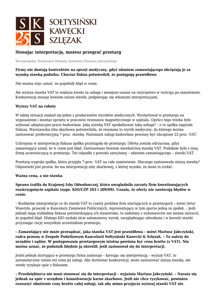 Stosując interpretację, możesz przegrać przetarg Rzeczpospolita, Przemysław Wojtasik, komentarz Mariusza Jabczyńskiego Firmy nie dostają kontraktów na sprzęt medyczny, gdyż zdaniem zamawiającego obciążają je za wysoką stawką podatku. Chociaż fiskus potwierdził, że postępują prawidłowo Nie można więc uznać, że popełniły błąd w cenie. Ale wyższa stawka VAT to większa kwota za usługę i mniejsze szanse na zwycięstwo w wyścigu po zamówienie. Konkurencja stosuje bowiem niższe stawki, podpierając się własnymi interpretacjami. Wyższy VAT na roboty W takiej sytuacji znalazł się jeden z producentów wyrobów medycznych. Wystartował w przetargu na wyposażenie i montaż sprzętu w pracowni rezonansu magnetycznego w szpitalu. Oprócz tego trzeba było wykonać adaptacyjne prace budowlane. Jaką stawką VAT opodatkować taką usługę? – o to spółka zapytała fiskusa. Warszawska izba skarbowa potwierdziła, że rezonans to wyrób medyczny, do którego można zastosować preferencyjną 7-proc. stawkę. Natomiast usługi budowlane powinny być obciążone 22-proc. VAT. Uzbrojona w interpretację fiskusa spółka przystąpiła do przetargu. Oferta została odrzucona, gdyż zamawiający uznał, że w cenie jest błąd. Zastosowano bowiem niewłaściwą stawkę VAT. Podobnie było z inną firmą uczestniczącą w przetargu. Też odpadła z powodu zawyżonej – zdaniem zamawiającego – stawki VAT. Przetarg wygrała spółka, która przyjęła 7-proc. VAT na całe zamówienie. Dlaczego zastosowała niższą stawkę? Odpowiedź jest prosta: bo ma interpretację izby skarbowej, z której wynika, że może to zrobić. Ważna cena, a nie stawka Sprawa trafiła do Krajowej Izby Odwoławczej, która uwzględniła zarzuty firm kwestionujących rozstrzygnięcie szpitala (sygn. KIO/UZP 203 i 209/09). Uznała, że oferty nie zawierają błędów w cenie. – Rozbieżne interpretacje co do stawki VAT to częsty problem firm startujących w przetargach – mówi Artur Wawryło, prawnik w Kancelarii Zamówień Publicznych, reprezentujący w tym sporze jedną ze spółek. – Jeśli jednak mają wykładnię fiskusa potwierdzającą ich stanowisko, to żadnemu z wykonawców nie można zarzucić, że popełnił błąd. Dlatego KIO wydała iście salomonowy wyrok, uwzględniając odwołania i w kwestii stawki przyznając rację wszystkim uczestnikom przetargu. – Zamawiający nie może przesądzać, jaka stawka VAT jest prawidłowa – mówi Mariusz Jabczyński, radca prawny w Zespole Podatkowym Kancelarii Sołtysiński Kawecki & Szlęzak. – To należy do urzędów i sądów. W postępowaniu przetargowym istotna powinna być cena brutto (z VAT). Nie można uznać, że podatnik błędnie ją określił, jeśli zastosował się do interpretacji. Jeżeli jednak startująca w przetargu firma zastosuje – kierując się interpretacją – wyższy VAT, to automatycznie rośnie też cena jej usługi. Aby dorównać konkurencji, może zastosować niższą stawkę, ale wtedy ryzykuje spór z fiskusem. – Przedsiębiorca nie musi stosować się do interpretacji – wyjaśnia Mariusz Jabczyński. – Naraża się jednak na spór z urzędem i konsekwencje karne skarbowe. Jeśli nie chce ryzykować, powinien rozważyć obniżenie ceny brutto całej usługi, tak aby mimo przyjęcia wyższej stawki VAT nie odstawała za bardzo od kwot proponowanych przez konkurencję. Pozostaje jeszcze odpowiedź na pytanie, jaką stawkę VAT stosować do tzw. świadczeń złożonych (głównego i pomocniczych). Interpretacje i wyroki są różne, ale większość ekspertów podkreśla, że powinno się przyjąć stawkę właściwą dla świadczenia, które decyduje o zawarciu transakcji.