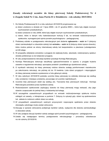 Zasady rekrutacji uczniów do klasy pierwszej Szkoły Podstawowej Nr 4 w Zespole Szkół Nr 2 im. Jana Pawła II w Działdowie - rok szkolny 2015/2016 1. Do Szkoły Podstawowej Nr 4 w roku szkolnym 2015/2016 przyjmowane są: a) dzieci urodzone w okresie od 1 lipca 2008 r. do 31 grudnia 2008 r., które były objęte rocznym wychowaniem przedszkolnym, b) dzieci urodzone w roku 2009, które były objęte rocznym wychowaniem przedszkolnym, c) dzieci, które w danym roku kalendarzowym kończą 5 lat, na wniosek rodziców/prawnych opiekunów, wymagana jest opinia poradni psychologiczno - pedagogicznej. 2. Podstawą udziału w postępowaniu rekrutacyjnym jest złożenie zgłoszenia – wzór nr 1 (dotyczy dzieci zamieszkałych w obwodzie szkoły) lub wniosku – wzór nr 2 (dotyczy dzieci spoza obwodu), które można pobrać ze strony internetowej szkoły lub bezpośrednio w placówce (udostępniane od 28 lutego. 3. W przypadku składania wniosków o przyjęcie do większej liczby placówek, rodzic/prawny opiekun określa preferencje co do kolejności przyjęcia. 4. W celu przeprowadzenia rekrutacji dyrektor powołuje Komisję Rekrutacyjną. 5. Komisja Rekrutacyjna dokonuje weryfikacji zgłoszeń/wniosków w oparciu o przyjęte kryteria zawarte w regulaminie rekrutacji, sporządza protokół i przedkłada go dyrektorowi szkoły. 6. O wynikach rekrutacji do klasy pierwszej rodzice dziecka zostają poinformowani niezwłocznie po zakończeniu rekrutacji, nie później niż do 15 kwietnia. Lista dzieci przyjętych i nieprzyjętych do klasy pierwszej zostanie wywieszona w holu głównym szkoły. 7. W roku szkolnym 2015/2016 podziału uczniów klasy pierwszej na oddziały dokonuje się według roku urodzenia i miesiąca urodzenia, poczynając od uczniów najmłodszych. 8. Uczniów klas pierwszych dzieli się według ulic. Tworzenia klas pierwszych dokonuje Komisja Rekrutacyjna powołana przez dyrektora szkoły. 9. Rodzice/prawni opiekunowie zapisujący dziecko do klasy pierwszej mogą wskazać, aby jego dziecko uczęszczało do jednej klasy z koleżanką lub kolegą. 10. W szczególnie uzasadnionych przypadkach na wniosek rodzica/prawnego opiekuna można odstąpić od zasady, o którejmowa w punkcie 7. Dotyczy to sytuacji gdy: dzieci są spokrewnione lub ułatwia to rodzicom odbiór dzieci ze szkoły. 11. W przypadkach uzasadnionych ważnymi przyczynami rozpoczęcie spełniania przez dziecko obowiązku szkolnego może zostać odroczone. 12. Decyzję w sprawie odroczenia podejmuje dyrektor szkoły, wyłącznie dla dziecka zamieszkałego w obwodzie szkoły. 13. W celu podjęcia decyzji dyrektor szkoły zasięga opinii poradni psychologiczno - pedagogicznej. 14. Ustala się następujące na rok szkolny 2015/2016: terminy postępowania rekrutacyjnego i procedury odwoławcze L.p. Rodzaj czynności termin Termin postępowania uzupełniającego 1. Składanie zgłoszeń i wniosków wraz z załącznikami (dotyczy dzieci z obwodu i spoza obwodu szkoły) 02 - 31.03.2015 r. (dotyczy dzieci z obwodu i spoza obwodu szkoły) 01 - 14.08.2015 r. (dotyczy dzieci spoza obwodu szkoły w przypadku wolnych miejsc) 2. Podanie do publicznej wiadomości listy kandydatów zakwalifikowanych i niezakwalifikowanych (dotyczy dzieci spoza obwodu szkoły) 14.04.2015 r. do godziny 14.00 (dotyczy dzieci spoza obwodu szkoły) 21.08.2015 r. do godziny 14.00 (dotyczy dzieci spoza obwodu szkoły) 3. Podanie do publicznej wiadomości kandydatów przyjętych (dotyczy dzieci z obwodu i spoza obwodu szkoły) i kandydatów nieprzyjętych (dotyczy dzieci spoza obwodu szkoły) 15.04.2015 r. do godziny 14.00 (dotyczy dzieci z obwodu i spoza obwodu szkoły) 28.08.2015 r. do godziny 14.00 (dotyczy dzieci spoza obwodu szkoły) 4. Składanie wniosków do komisji rekrutacyjnej o sporządzenie uzasadnienia odmowy przyjęcia (dotyczy dzieci spoza obwodu szkoły) do 7 dni od dnia podania do publicznej wiadomości kandydatów przyjętych i kandydatów nieprzyjętych 5. Przygotowanie i wydanie uzasadnienia odmowy przyjęcia przez Komisję Rekrutacyjną do 5 dni od daty złożenia wniosku o sporządzenie uzasadnienia odmowy przyjęcia 6. Złożenie do dyrektora szkoły odwołania od rozstrzygnięcia komisji rekrutacyjnej wyrażonego w pisemnym uzasadnieniu odmowy przyjęcia do 7 dni od terminu otrzymania pisemnego uzasadnienia odmowy przyjęcia 7. Rozstrzygnięcie przez dyrektora szkoły odwołania od rozstrzygnięcia komisji rekrutacyjnej wyrażonego w pisemnym uzasadnieniu odmowy przyjęcia do 7 dni od dnia złożenia do dyrektora odwołania od rozstrzygnięcia komisji rekrutacyjnej wyrażonego w pisemnym uzasadnieniu odmowy przyjęcia 15. Do szkoły przyjmuje się z urzędu dzieci zamieszkałe w obwodzie szkoły na podstawie wypełnionego przez rodziców lub prawnych opiekunów dziecka druku „Karta zgłoszenia dziecka do Szkoły Podstawowe Nr 4”. 16. Dzieci zamieszkałe poza obwodem szkoły przyjmuje się do szkoły wyłącznie w przypadku, gdy placówka dysponuje wolnymi miejscami, na podstawie wypełnionego przez rodziców/prawnych opiekunów dziecka druku „Wniosek o przyjęcie dziecka do Szkoły Podstawowej Nr 4 w Działdowie spoza obwodu szkoły”. 17. Do dopełnienia czynności związanych ze zgłoszeniem dziecka do szkoły zobowiązani są jego rodzice / prawni opiekunowie. 18. Druki: „Karta zgłoszenia dziecka do Szkoły Podstawowej Nr 4 w Działdowie” lub „Wniosek o przyjęcie dziecka do Szkoły Podstawowej Nr 4 w Działdowie” można otrzymać w sekretariacie szkoły lub pobrać ze strony internetowej szkoły. 19. Wypełnione druki należy składać w sekretariacie szkoły do 31 marca 2015 r. 20. Dzieci zamieszkałe poza obwodem szkoły mogą być przyjęte do klasy pierwszej po przeprowadzeniu postępowania rekrutacyjnego w przypadku, gdy szkoła nadal dysponuje wolnymi miejscami. Dzieci spoza obwodu przyjmuje się na podstawie następujących kryteriów: L.p. Kryterium Dokument potwierdzający spełnianie kryterium Wartość kry
