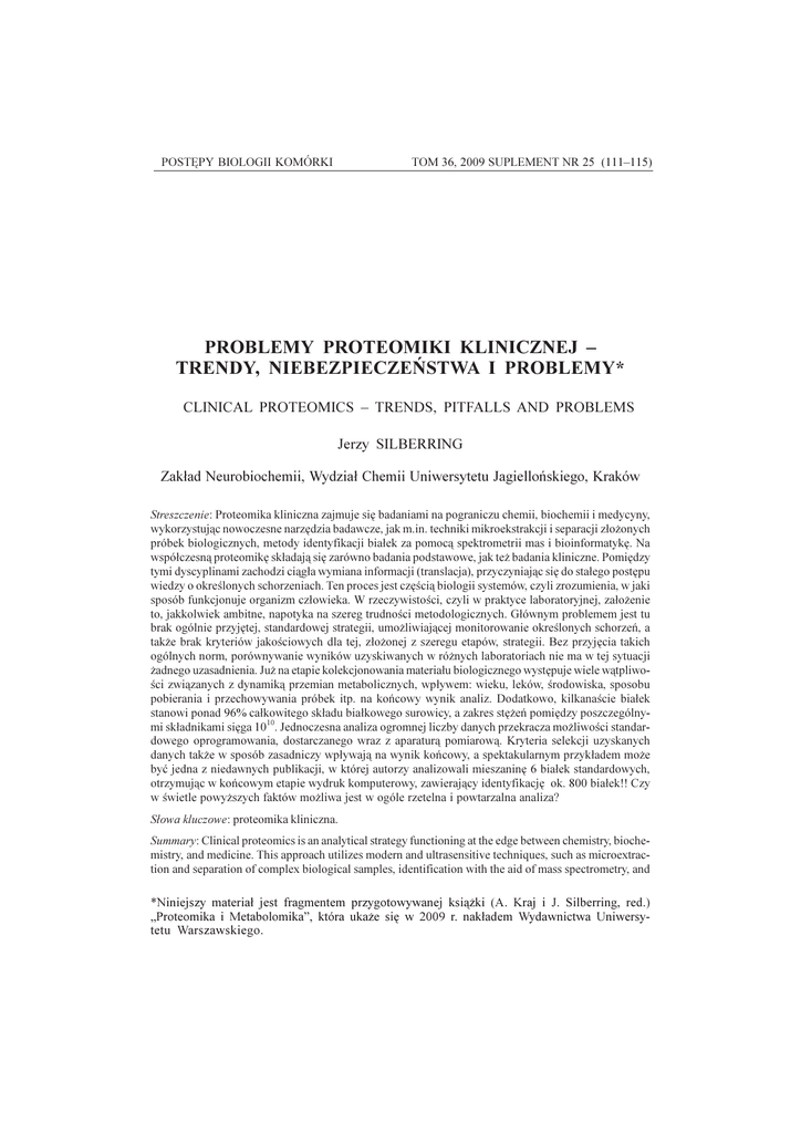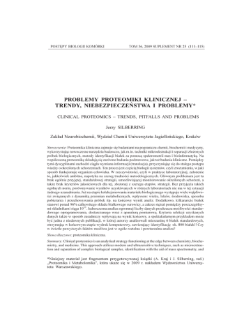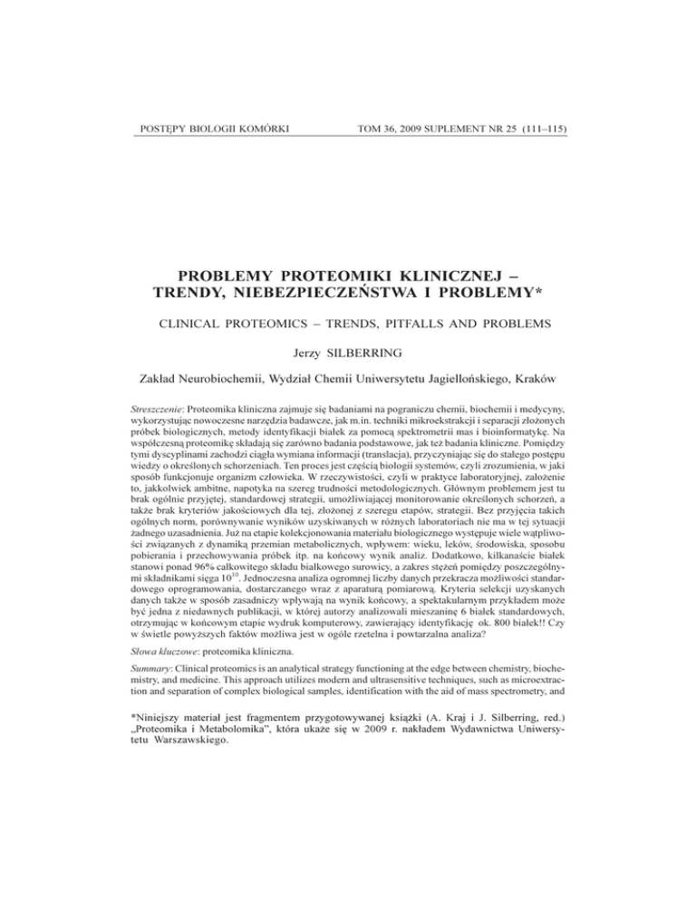PROBLEMY PROTEOMIKI KLINICZNEJ ... POSTÊPY BIOLOGII KOMÓRKI 111 TOM 36, 2009 SUPLEMENT NR 25 (111115) PROBLEMY PROTEOMIKI KLINICZNEJ TRENDY, NIEBEZPIECZEÑSTWA I PROBLEMY* CLINICAL PROTEOMICS TRENDS, PITFALLS AND PROBLEMS Jerzy SILBERRING Zak³ad Neurobiochemii, Wydzia³ Chemii Uniwersytetu Jagielloñskiego, Kraków Streszczenie: Proteomika kliniczna zajmuje siê badaniami na pograniczu chemii, biochemii i medycyny, wykorzystuj¹c nowoczesne narzêdzia badawcze, jak m.in. techniki mikroekstrakcji i separacji z³o¿onych próbek biologicznych, metody identyfikacji bia³ek za pomoc¹ spektrometrii mas i bioinformatykê. Na wspó³czesn¹ proteomikê sk³adaj¹ siê zarówno badania podstawowe, jak te¿ badania kliniczne. Pomiêdzy tymi dyscyplinami zachodzi ci¹g³a wymiana informacji (translacja), przyczyniaj¹c siê do sta³ego postêpu wiedzy o okrelonych schorzeniach. Ten proces jest czêci¹ biologii systemów, czyli zrozumienia, w jaki sposób funkcjonuje organizm cz³owieka. W rzeczywistoci, czyli w praktyce laboratoryjnej, za³o¿enie to, jakkolwiek ambitne, napotyka na szereg trudnoci metodologicznych. G³ównym problemem jest tu brak ogólnie przyjêtej, standardowej strategii, umo¿liwiaj¹cej monitorowanie okrelonych schorzeñ, a tak¿e brak kryteriów jakociowych dla tej, z³o¿onej z szeregu etapów, strategii. Bez przyjêcia takich ogólnych norm, porównywanie wyników uzyskiwanych w ró¿nych laboratoriach nie ma w tej sytuacji ¿adnego uzasadnienia. Ju¿ na etapie kolekcjonowania materia³u biologicznego wystêpuje wiele w¹tpliwoci zwi¹zanych z dynamik¹ przemian metabolicznych, wp³ywem: wieku, leków, rodowiska, sposobu pobierania i przechowywania próbek itp. na koñcowy wynik analiz. Dodatkowo, kilkanacie bia³ek stanowi ponad 96% ca³kowitego sk³adu bia³kowego surowicy, a zakres stê¿eñ pomiêdzy poszczególnymi sk³adnikami siêga 1010. Jednoczesna analiza ogromnej liczby danych przekracza mo¿liwoci standardowego oprogramowania, dostarczanego wraz z aparatur¹ pomiarow¹. Kryteria selekcji uzyskanych danych tak¿e w sposób zasadniczy wp³ywaj¹ na wynik koñcowy, a spektakularnym przyk³adem mo¿e byæ jedna z niedawnych publikacji, w której autorzy analizowali mieszaninê 6 bia³ek standardowych, otrzymuj¹c w koñcowym etapie wydruk komputerowy, zawieraj¹cy identyfikacjê ok. 800 bia³ek!! Czy w wietle powy¿szych faktów mo¿liwa jest w ogóle rzetelna i powtarzalna analiza? S³owa kluczowe: proteomika kliniczna. Summary: Clinical proteomics is an analytical strategy functioning at the edge between chemistry, biochemistry, and medicine. This approach utilizes modern and ultrasensitive techniques, such as microextraction and separation of complex biological samples, identification with the aid of mass spectrometry, and *Niniejszy materia³ jest fragmentem przygotowywanej ksi¹¿ki (A. Kraj i J. Silberring, red.) Proteomika i Metabolomika, która uka¿e siê w 2009 r. nak³adem Wydawnictwa Uniwersytetu Warszawskiego. 112 J. SILBERRING advanced bioinformatics. Nowadays proteomics is based on basic research and clinical investigations. Between those disciplines there is a constant exchange of information (translation) and this process is part of the systems biology, i.e. understanding how human organism works. In reality, i.e. in a daily laboratory practice this assumption, however ambitious, meets many methodological ambiguities. The major issue is a lack of the commonly accepted, standard (or optimal) analytical strategy to handle biological material, and to monitor specific diseases. There is also an urgent need to evaluate quality criteria for this multi-task approach. Without such widespread norms, data comparison between various laboratories is out of question. Many ambiguities already appear during material collection phase. This is associated with the overall dynamics of such complex biological system as living organism, influence of age, medications, environment, a way the sample is collected and stored, etc. on the final result of the entire analysis. Additionally, several proteins comprise 96% of the protein content in plasma and the dynamic range of molecules reaches nearly 1010, which obscures less abundant components having important biological impact. Thus, simultaneous analysis of a huge amount of raw data is far beyond capabilities of modern instrumentation and software, and, even more important, cannot be fully interpreted by operators and translated to a common biological sense. One spectacular example may here be cited, where authors honestly reported analysis of a mixture of 6 standard proteins, which resulted in a printout containing identification of ca. 800 proteins! How the above contributes to the reliable and reproducible analysis? Key words: clinical proteomics. WSTÊP Proteomika kliniczna zajmuje siê badaniami na pograniczu chemii, biochemii i medycyny, wykorzystuj¹c nowoczesne narzêdzia badawcze, jak m.in. techniki mikroekstrakcji i separacji z³o¿onych próbek biologicznych, metody identyfikacji bia³ek za pomoc¹ spektrometrii mas i bioinformatykê. Wspó³czesna proteomika obejmuje zarówno badania podstawowe, jak i badania kliniczne. Pomiêdzy tymi dyscyplinami zachodzi ci¹g³a wymiana informacji (translacja), przyczyniaj¹c siê do sta³ego postêpu wiedzy o okrelonych schorzeniach. Ten proces jest czêci¹ biologii systemów, czyli zrozumienia, w jaki sposób funkcjonuje organizm cz³owieka. CZY PROTEOMIKA POMO¯E NAM W POSZUKIWANIU BIOMARKERÓW? W rzeczywistoci, czyli w praktyce laboratoryjnej za³o¿enie to, jakkolwiek ambitne, napotyka na wiele trudnoci metodologicznych. G³ównym problemem jest tu brak ogólnie przyjêtej, standardowej strategii, umo¿liwiaj¹cej monitorowanie okrelonych schorzeñ. Brak tak¿e kryteriów jakociowych oceniaj¹cych poszczególne etapy klinicznej analizy proteomicznej. Nie jest bowiem oczywiste, co oznacza dobrze wykonana elektroforeza w ¿elu poliakrylamidowym i jak powinien prze