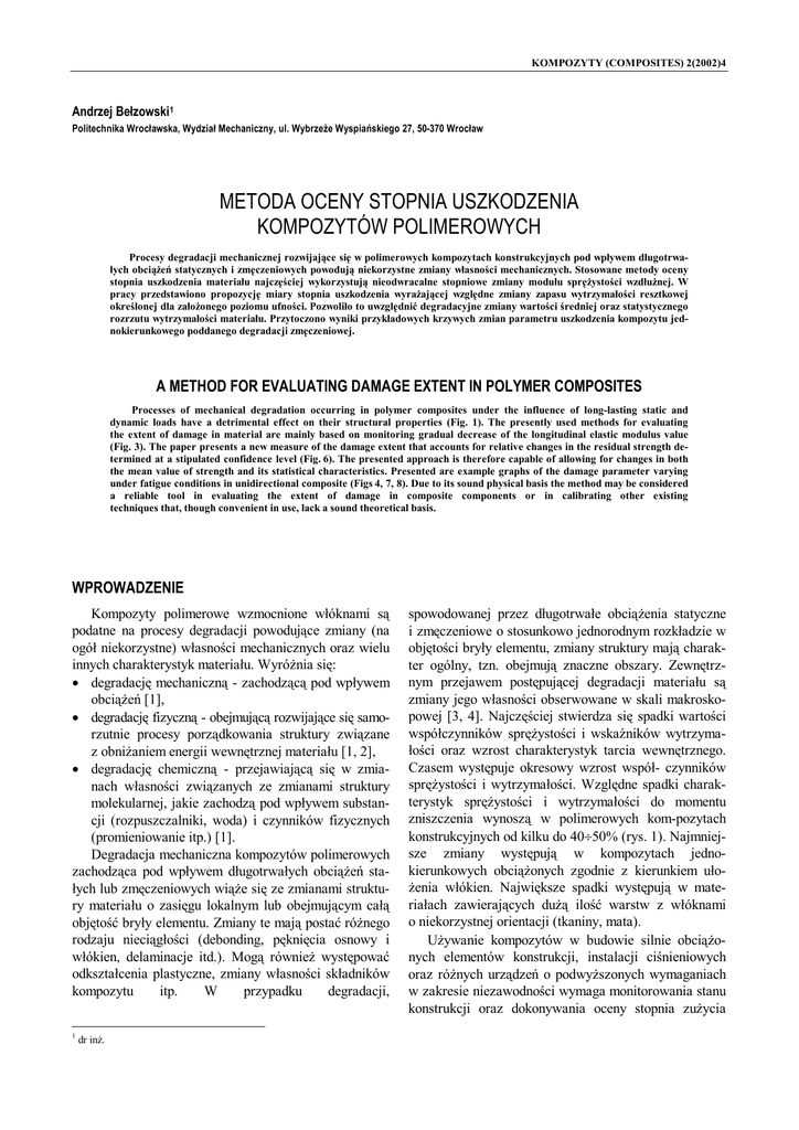 KOMPOZYTY (COMPOSITES) 2(2002)4 Andrzej Bełzowski1 Politechnika Wrocławska, Wydział Mechaniczny, ul. Wybrzeże Wyspiańskiego 27, 50-370 Wrocław METODA OCENY STOPNIA USZKODZENIA KOMPOZYTÓW POLIMEROWYCH Procesy degradacji mechanicznej rozwijające się w polimerowych kompozytach konstrukcyjnych pod wpływem długotrwałych obciążeń statycznych i zmęczeniowych powodują niekorzystne zmiany własności mechanicznych. Stosowane metody oceny stopnia uszkodzenia materiału najczęściej wykorzystują nieodwracalne stopniowe zmiany modułu sprężystości wzdłużnej. W pracy przedstawiono propozycję miary stopnia uszkodzenia wyrażającej względne zmiany zapasu wytrzymałości resztkowej określonej dla założonego poziomu ufności. Pozwoliło to uwzględnić degradacyjne zmiany wartości średniej oraz statystycznego rozrzutu wytrzymałości materiału. Przytoczono wyniki przykładowych krzywych zmian parametru uszkodzenia kompozytu jednokierunkowego poddanego degradacji zmęczeniowej. A METHOD FOR EVALUATING DAMAGE EXTENT IN POLYMER COMPOSITES Processes of mechanical degradation occurring in polymer composites under the influence of long-lasting static and dynamic loads have a detrimental effect on their structural properties (Fig. 1). The presently used methods for evaluating the extent of damage in material are mainly based on monitoring gradual decrease of the longitudinal elastic modulus value (Fig. 3). The paper presents a new measure of the damage extent that accounts for relative changes in the residual strength determined at a stipulated confidence level (Fig. 6). The presented approach is therefore capable of allowing for changes in both the mean value of strength and its statistical characteristics. Presented are example graphs of the damage parameter varying under fatigue conditions in unidirectional composite (Figs 4, 7, 8). Due to its sound physical basis the method may be considered a reliable tool in evaluating the extent of damage in composite components or in calibrating other existing techniques that, though convenient in use, lack a sound theoretical basis. WPROWADZENIE Kompozyty polimerowe wzmocnione włóknami są podatne na procesy degradacji powodujące zmiany (na ogół niekorzystne) własności mechanicznych oraz wielu innych charakterystyk materiału. Wyróżnia się: • degradację mechaniczną - zachodzącą pod wpływem obciążeń [1], • degradację fizyczną - obejmującą rozwijające się samorzutnie procesy porządkowania struktury związane z obniżaniem energii wewnętrznej materiału [1, 2], • degradację chemiczną - przejawiającą się w zmianach własności związanych ze zmianami struktury molekularnej, jakie zachodzą pod wpływem substancji (rozpuszczalniki, woda) i czynników fizycznych (promieniowanie itp.) [1]. Degradacja mechaniczna kompozytów polimerowych zachodząca pod wpływem długotrwałych obciążeń stałych lub zmęczeniowych wiąże się ze zmianami struktury materiału o zasięgu lokalnym lub obejmującym całą objętość bryły elementu. Zmiany te mają postać różnego rodzaju nieciągłości (debonding, pęknięcia osnowy i włókien, delaminacje itd.). Mogą również występować odkształcenia plastyczne, zmiany własności składników kompozytu itp. W przypadku degradacji, 1 dr inż. spowodowanej przez długotrwałe obciążenia statyczne i zmęczeniowe o stosunkowo jednorodnym rozkładzie w objętości bryły elementu, zmiany struktury mają charakter ogólny, tzn. obejmują znaczne obszary. Zewnętrznym przejawem postępującej degradacji materiału są zmiany jego własności obserwowane w skali makroskopowej [3, 4]. Najczęściej stwierdza się spadki wartości współczynników sprężystości i wskaźników wytrzymałości oraz wzrost charakterystyk tarcia wewnętrznego. Czasem występuje okresowy wzrost współ- czynników sprężystości i wytrzymałości. Względne spadki charakterystyk sprężystości i wytrzymałości do momentu zniszczenia wynoszą w polimerowych kom-pozytach konstrukcyjnych od kilku do 40÷50% (rys. 1). Najmniejsze zmiany występują w kompozytach jednokierunkowych obciążonych zgodnie z kierunkiem ułożenia włókien. Największe spadki występują w materiałach zawierających dużą ilość warstw z włóknami o niekorzystnej orientacji (tkaniny, mata). Używanie kompozytów w budowie silnie obciążonych elementów konstrukcji, instalacji ciśnieniowych oraz różnych urządzeń o podwyższonych wymaganiach w zakresie niezawodności wymaga monitorowania stanu konstrukcji oraz dokonywania oceny stopnia zużycia 254 A. Bełzowski materiału. Ważnym problemem teoretycznym i praktycznym jest znalezienie odpowiedniej miary stopnia uszkodzenia (zużycia) materiału. Idealna miara stopnia uszkodzenia materiału powinna: • jednoznacznie odzwierciedlać stopień wyczerpania zdolności materiału do przenoszenia obciążeń użytkowych, wyrażony w postaci spadku zapasu wytrzymałości lub przez zmniejszenie pozostającej trwałości zmęczeniowej itp., • charakteryzować się względną łatwością realizacji pomiarów wymaganych do określenia stopnia uszkodzenia, • charakteryzować się brakiem wpływu pomiarów charakterystyk materiału potrzebnych do oceny stopnia uszkodzenia na stan materiału (pomiary nieniszczące). 1 1 Większość stosowanych obecnie definicji miar uszko- dzenia kompozytów wykorzystuje bieżące wartości współczynników sprężystości, w szczególności modułu Younga. Teoretyczne podstawy tych metod wywodzą się z koncepcji naprężenia efektywnego, wysuniętej przez Kaczanowa pod koniec lat 50. Rozważając zagadnienia pełzania metali przyjął on, że zjawisko degradacji materiału rozwijające się pod wpływem przyłożonego obciążenia polega na stopniowym powstawaniu pustek zmniejszających przekrój czynny przenoszący obciążenia (rys. 2a). Wskutek obecności pęknięć naprężenie efektywne w materiale uszkodzonym (σ) jest 