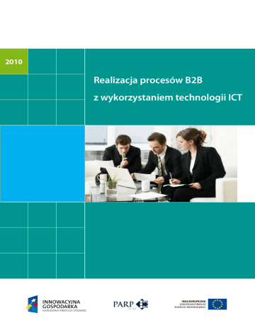 Realizacja procesów B2B z wykorzystaniem technologii ICT Koncepcja Publikacji: Leszek Czech Autorzy: Tomasz Dębicki Olgierd Dziamski Tomasz Kawecki Wojciech Kliber Marcin Kraska Piotr Nowak Michał Przybylski Tadeusz Rudnicki Robert Ślatała Bogusław Śliwczyński Paweł Żebrowski Korekta: Agnieszka Domagała Wydawca: Polska Agencja Rozwoju Przedsiębiorczości (PARP) ul. Pańska 81/83 00-834 Warszawa www.parp.gov.pl Wydanie I Publikacja bezpłatna Projekt współfinansowany przez Unię Europejską w ramach Europejskiego Funduszu Rozwoju Regionalnego Wspieramy e-biznes www.web.gov.pl Copyright © by Polska Agencja Rozwoju Przedsiębiorczości Warszawa 2010 Wszelkie prawa zastrzeżone. Żaden fragment nie może być wykorzystywany w jakiejkolwiek formie ani przekładany na język mechaniczny bez zgody PARP. Spis treści 1. Wstęp ...........................................................................................................................................................................................................................................................6 2. Przedstawienie działania PO IG 8.2 ............................................................................................................................................................................................8 2.1. Cel działania 8.2. .............................................................................................................................................................................................................................8 2.2. Uwarunkowania prawne i formalne udzielenia wsparcia ....................................................................................................................................8 2.2.1. Uwarunkowania prawne....................................................................................................................................................................................................8 2.2.2. Uwarunkowania formalne ................................................................................................................................................................................................8 2.3. Grupa docelowa .............................................................................................................................................................................................................................9 2.4. Zakres procesów kwalifikujących się do objęcia wsparciem. ............................................................................................................................9 Rodzaje procesów biznesowych realizowanych w przedsiębiorstwach ...................................................................................................... 10 3. 3.1. Rodzaje procesów biznesowych ...................................................................................................................................................................................... 10 3.2. Procesy wewnętrzne przedsiębiorstwa ........................................................................................................................................................................ 11 3.2.1. Diagnozowanie stanu przedsiębiorstwa .............................................................................................................................................................. 11 3.2.2. Prognozowanie..................................................................................................................................................................................................................... 11 3.2.3. Planowanie .............................................................................................................................................................................................................................. 11 3.2.4. Produkcja .................................................................................................................................................................................................................................. 12 3.2.5. Magazynowanie ................................................................................................................................................................................................................... 13 3.2.6. Księgowość, controlling i finanse .............................................................................................................................................................................. 14 3.3. Procesy zewnętrzne – współpraca B2B ........................................................................................................................................................................ 14 3.3.1. Marketing .................................................................................................................................................................................................................................. 14 3.3.2. Zaopatrzenie........................................................................................................................................................................................................................... 15 3.3.3. Sprzedaż .................................................................................................................................................................................................................................... 18 3.3.4. Dystrybucja .............................................................................................................................................................................................................................. 23 3.3.5. Komunikacja z otoczeniem biznesowym.....................................................................................................