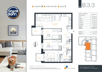 Salon z aneksem kuchennym 26,28 m2 Hall 10,62 m2 Pokój 1 10,10 m2 Pokój 2 10,10 m2 Pokój 3 9,93 m2 Łazienka 5,03 m2 Toaleta 1,95 m2 Suma 74,01 m2 Balkon 1 3,77 m2 Balkon 2 3,10 m2