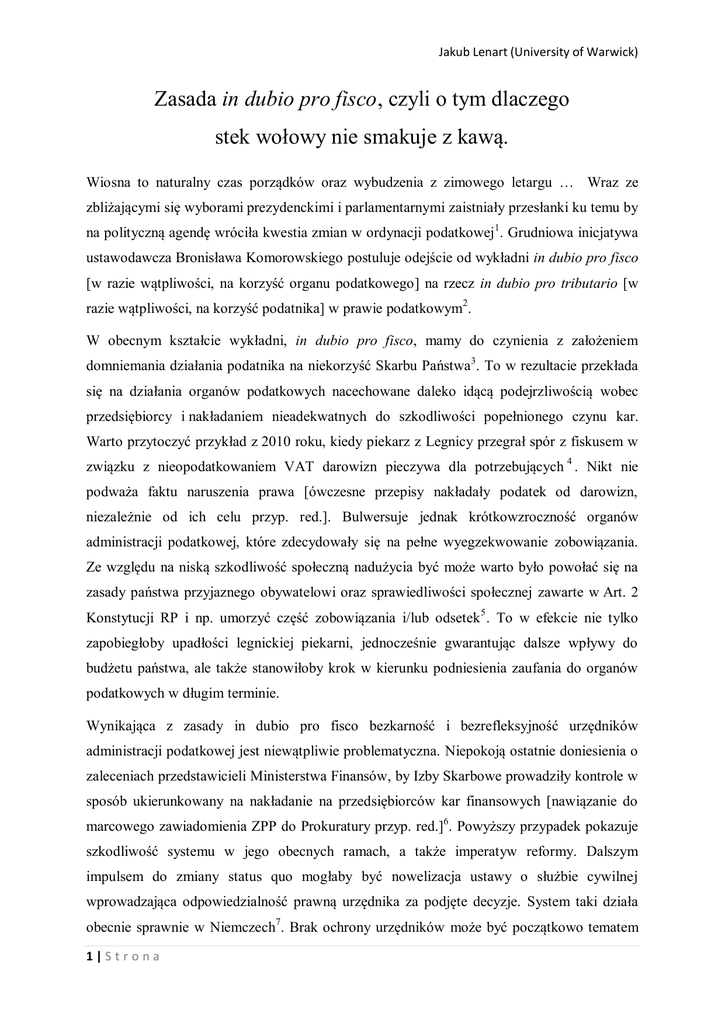 Jakub Lenart (University of Warwick) Zasada in dubio pro fisco, czyli o tym dlaczego stek wołowy nie smakuje z kawą. Wiosna to naturalny czas porządków oraz wybudzenia z zimowego letargu … Wraz ze zbliżającymi się wyborami prezydenckimi i parlamentarnymi zaistniały przesłanki ku temu by na polityczną agendę wróciła kwestia zmian w ordynacji podatkowej1. Grudniowa inicjatywa ustawodawcza Bronisława Komorowskiego postuluje odejście od wykładni in dubio pro fisco [w razie wątpliwości, na korzyść organu podatkowego] na rzecz in dubio pro tributario [w razie wątpliwości, na korzyść podatnika] w prawie podatkowym2. W obecnym kształcie wykładni, in dubio pro fisco, mamy do czynienia z założeniem domniemania działania podatnika na niekorzyść Skarbu Państwa3. To w rezultacie przekłada się na działania organów podatkowych nacechowane daleko idącą podejrzliwością wobec przedsiębiorcy i nakładaniem nieadekwatnych do szkodliwości popełnionego czynu kar. Warto przytoczyć przykład z 2010 roku, kiedy piekarz z Legnicy przegrał spór z fiskusem w związku z nieopodatkowaniem VAT darowizn pieczywa dla potrzebujących 4 . Nikt nie podważa faktu naruszenia prawa [ówczesne przepisy nakładały podatek od darowizn, niezależnie od ich celu przyp. red.]. Bulwersuje jednak krótkowzroczność organów administracji podatkowej, które zdecydowały się na pełne wyegzekwowanie zobowiązania. Ze względu na niską szkodliwość społeczną nadużycia być może warto było powołać się na zasady państwa przyjaznego obywatelowi oraz sprawiedliwości społecznej zawarte w Art. 2 Konstytucji RP i np. umorzyć część zobowiązania i/lub odsetek5 . To w efekcie nie tylko zapobiegłoby upadłości legnickiej piekarni, jednocześnie gwarantując dalsze wpływy do budżetu państwa, ale także stanowiłoby krok w kierunku podniesienia zaufania do organów podatkowych w długim terminie. Wynikająca z zasady in dubio pro fisco bezkarność i bezrefleksyjność urzędników administracji podatkowej jest niewątpliwie problematyczna. Niepokoją ostatnie doniesienia o zaleceniach przedstawicieli Ministerstwa Finansów, by Izby Skarbowe prowadziły kontrole w sposób ukierunkowany na nakładanie na przedsiębiorców kar finansowych [nawiązanie do marcowego zawiadomienia ZPP do Prokuratury przyp. red.]6. Powyższy przypadek pokazuje szkodliwość systemu w jego obecnych ramach, a także imperatyw reformy. Dalszym impulsem do zmiany status quo mogłaby być nowelizacja ustawy o służbie cywilnej wprowadzająca odpowiedzialność prawną urzędnika za podjęte decyzje. System taki działa obecnie sprawnie w Niemczech7. Brak ochrony urzędników może być początkowo tematem 1|S t r o na kontrowersyjnym, lecz wraz z rozwojem ubezpieczeń urzędniczych [produkt obecny na rynku niemieckim przyp. red.] jest szansa na rozwiązanie gwarantujące jednocześnie wolnorynkową ochronę urzędników, a także zrównanie podatnika i fiskusa wobec prawa. Bezrefleksyjność pogarsza dodatkowo fakt, że organy podatkowe władają szerokimi prerogatywami interpretacyjnymi. Z kolei złożoność i postępująca inflacja przepisów podatkowych dodatkowo eskalują problem. Kuriozum różnicowania opodatkowania VAT w branży gastronomicznej naświetla hipotetyczny przykład obiadu w dowolnej restauracji w Polsce. Przypuszczalnie, wraz z siostrą zamówiliśmy stek wołowy z grilla z mozarellą i truflami [w cenie 50zł bez VAT]. W ramach własnego rachunku zamawiam ponadto kawę [w cenie 10zł bez VAT]. Istniejące prawo traktuje nas jednak różnie, ponieważ posiłek mojej siostry objęty jest stawką VAT w wysokości 8%, natomiast zarówno mój posiłek, jak i kawa opodatkowane są jednakową stawką 23% VAT 8 . Efektywnie, ten sam stek kosztuje mnie 6,5zł drożej. Abstrahując od wątpliwej zasadności takich przepisów oraz niesmaku konsumenckiego, taka skala obostrzeń przepisami branży gastronomicznej ogranicza jej konkurencyjność i rozwój w Polsce. Jednocześnie zmusza ona istniejące firmy do zwiększenia nakładów na kontrole wewnętrznych mechanizmów rozrachunkowych oraz szukania luk interpretacyjnych w prawie podatkowym. Podsumowując, zamiast przedmiotowego traktowania polskich przedsiębiorców warto zwiększyć środki skierowane na uszczelnienie systemu podatkowego, np. w związku z nadużyciami takimi jak karuzele VAT [problem oceniany przez PwC na ok. 42 mld zł, czyli 2.5% PKB w 2014r. przyp. red.] 9 . Biorąc pod uwagę wielkość planowanego deficytu budżetowego [47.5 mld zł w 2014r. przyp. red.], to tutaj znajduje się zarówno efektywne w sensie Pareto, jak i społecznie pożądane rozwiązanie problemu resortu finansów. Powróćmy jeszcze krótko do oceny prawdopodobieństwa wprowadzenia w życie nowelizacji ordynacji podatkowej. Przykładowo w czasie Sejmu VI kadencji projekt wnioskowany przez Prezydenta RP potrzebował na rozpatrzenie średnio 167 dni10. Zważając na powyższe, a także październikowy termin wyborów parlamentarnych oraz zasadę dyskontynuacji prac Sejmu wiele wskazuje na to, że prezydencki projekt ma ograniczone szanse sukcesu. A szkoda, ponieważ w sytuacji, gdy wprowadzenie opodatkowania jednakową stawką VAT jest obecnie mało realne, zasada in dubio pro tributario byłaby zmianą zdecydowanie na lepsze dla polskiego biznesu. 2|S t r o na Przypisy: 1) O terminach wyborów prezydenckich oraz parlamentarnych w Polsce w 2015 roku: i. http://www.sejm.gov.pl/sejm7.nsf/komunikat.xsp?documentId=F48FB1E9B07A3FEEC1257DE200436 901 ii. http://www.infor.pl/prawo/wybory/wybory-parlamentarne-2015/694227,Wybory-parlamentarne-2015termin.html 2) Prezydencki projekt nowelizacji ordynacji podatkowej w Polsce: i. http://www.prezydent.pl/prawo/ustawy/zgloszone/art,23,watpliwosci-rozstrzygane-na-korzyscpodatnika.html 3) Na czym polegają zasady in dubio pro fisco oraz in dubio pro tributario: i. ii. ii. iii. http://www.podatek-od-nieruchomosci.com/?p=8