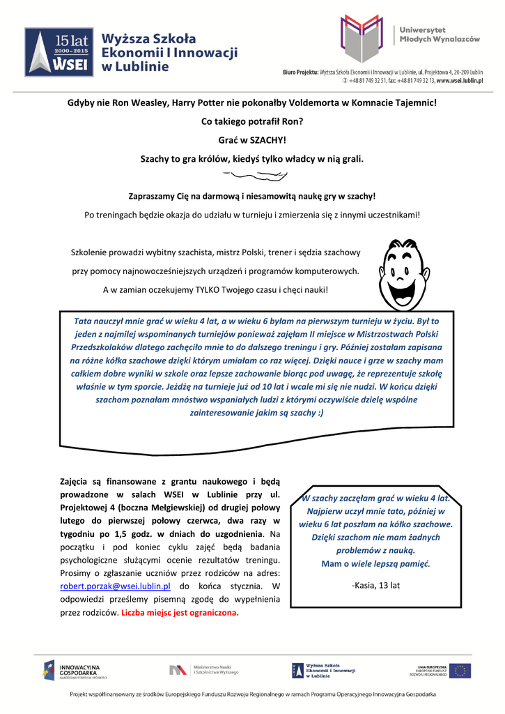 Gdyby nie Ron Weasley, Harry Potter nie pokonałby Voldemorta w Komnacie Tajemnic! Co takiego potrafił Ron? Grać w SZACHY! Szachy to gra królów, kiedyś tylko władcy w nią grali. Zapraszamy Cię na darmową i niesamowitą naukę gry w szachy! Po treningach będzie okazja do udziału w turnieju i zmierzenia się z innymi uczestnikami! Szkolenie prowadzi wybitny szachista, mistrz Polski, trener i sędzia szachowy przy pomocy najnowocześniejszych urządzeń i programów komputerowych. A w zamian oczekujemy TYLKO Twojego czasu i chęci nauki! Tata nauczył mnie grać w wieku 4 lat, a w wieku 6 byłam na pierwszym turnieju w życiu. Był to jeden z najmilej wspominanych turniejów ponieważ zajęłam II miejsce w Mistrzostwach Polski Przedszkolaków dlatego zachęciło mnie to do dalszego treningu i gry. Później zostałam zapisana na różne kółka szachowe dzięki którym umiałam co raz więcej. Dzięki nauce i grze w szachy mam całkiem dobre wyniki w szkole oraz lepsze zachowanie biorąc pod uwagę, że reprezentuje szkołę właśnie w tym sporcie. Jeżdżę na turnieje już od 10 lat i wcale mi się nie nudzi. W końcu dzięki szachom poznałam mnóstwo wspaniałych ludzi z którymi oczywiście dzielę wspólne zainteresowanie jakim są szachy :) - Agata, 15 lat Zajęcia są finansowane z grantu naukowego i będą prowadzone w salach WSEI w Lublinie przy ul. Projektowej 4 (boczna Mełgiewskiej) od drugiej połowy lutego do pierwszej połowy czerwca, dwa razy w tygodniu po 1,5 godz. w dniach do uzgodnienia. Na początku i pod koniec cyklu zajęć będą badania psychologiczne służącymi ocenie rezultatów treningu. Prosimy o zgłaszanie uczniów przez rodziców na adres: [email protected] do końca stycznia. W odpowiedzi prześlemy pisemną zgodę do wypełnienia przez rodziców. Liczba miejsc jest ograniczona. W szachy zaczęłam grać w wieku 4 lat. Najpierw uczył mnie tato, później w wieku 6 lat poszłam na kółko szachowe. Dzięki szachom nie mam żadnych problemów z nauką. Mam o wiele lepszą pamięć. -Kasia, 13 lat