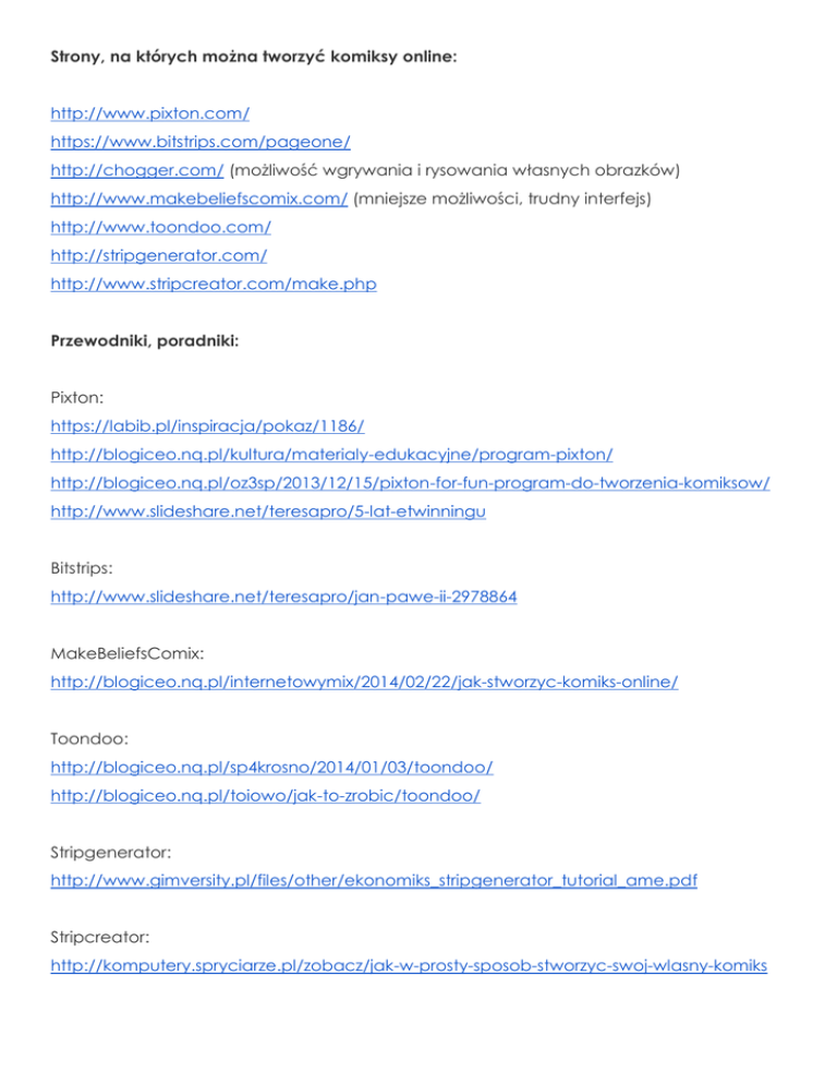 Strony, na których można tworzyć komiksy online: http://www.pixton.com/ https://www.bitstrips.com/pageone/ http://chogger.com/ (możliwość wgrywania i rysowania własnych obrazków) http://www.makebeliefscomix.com/ (mniejsze możliwości, trudny interfejs) http://www.toondoo.com/ http://stripgenerator.com/ http://www.stripcreator.com/make.php Przewodniki, poradniki: Pixton: https://labib.pl/inspiracja/pokaz/1186/ http://blogiceo.nq.pl/kultura/materialy-edukacyjne/program-pixton/ http://blogiceo.nq.pl/oz3sp/2013/12/15/pixton-for-fun-program-do-tworzenia-komiksow/ http://www.slideshare.net/teresapro/5-lat-etwinningu Bitstrips: http://www.slideshare.net/teresapro/jan-pawe-ii-2978864 MakeBeliefsComix: http://blogiceo.nq.pl/internetowymix/2014/02/22/jak-stworzyc-komiks-online/ Toondoo: http://blogiceo.nq.pl/sp4krosno/2014/01/03/toondoo/ http://blogiceo.nq.pl/toiowo/jak-to-zrobic/toondoo/ Stripgenerator: http://www.gimversity.pl/files/other/ekonomiks_stripgenerator_tutorial_ame.pdf Stripcreator: http://komputery.spryciarze.pl/zobacz/jak-w-prosty-sposob-stworzyc-swoj-wlasny-komiks