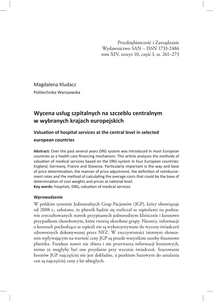 Przedsiębiorczość i Zarządzanie Wydawnictwo SAN – ISSN 1733-2486 tom XIV, zeszyt 10, część I, ss. 261–273 DĂŐĚĂůĞŶĂ<ůƵĚĂĐnj WŽůŝƚĞĐŚŶŝŬĂtĂƌƐnjĂǁƐŬĂ tLJĐĞŶĂƵƐųƵŐƐnjƉŝƚĂůŶLJĐŚŶĂƐnjĐnjĞďůƵĐĞŶƚƌĂůŶLJŵ ǁǁLJďƌĂŶLJĐŚŬƌĂũĂĐŚĞƵƌŽƉĞũƐŬŝĐŚ sĂůƵĂƟŽŶŽĨŚŽƐƉŝƚĂůƐĞƌǀŝĐĞƐĂƚƚŚĞĐĞŶƚƌĂůůĞǀĞůŝŶƐĞůĞĐƚĞĚ ĞƵƌŽƉĞĂŶĐŽƵŶƚƌŝĞƐ Abstract:KǀĞƌƚŚĞƉĂƐƚƐĞǀĞƌĂůLJĞĂƌƐZ'ƐLJƐƚĞŵǁĂƐŝŶƚƌŽĚƵĐĞĚŝŶŵŽƐƚƵƌŽƉĞĂŶ ĐŽƵŶƚƌŝĞƐĂƐĂŚĞĂůƚŚĐĂƌĞĮŶĂŶĐŝŶŐŵĞĐŚĂŶŝƐŵ͘dŚŝƐĂƌƟĐůĞĂŶĂůLJnjĞƐƚŚĞŵĞƚŚŽĚƐŽĨ ǀĂůƵĂƟŽŶŽĨŵĞĚŝĐĂůƐĞƌǀŝĐĞƐďĂƐĞĚŽŶƚŚĞZ'ƐLJƐƚĞŵŝŶĨŽƵƌƵƌŽƉĞĂŶĐŽƵŶƚƌŝĞƐ͗ ŶŐůĂŶĚ͕'ĞƌŵĂŶLJ͕&ƌĂŶĐĞĂŶĚ^ůŽǀĞŶŝĂ͘WĂƌƟĐƵůĂƌůLJŝŵƉŽƌƚĂŶƚŝƐƚŚĞǁĂLJĂŶĚďĂƐĞ ŽĨƉƌŝĐĞĚĞƚĞƌŵŝŶĂƟŽŶ͕ƚŚĞŵĂŶŶĞƌŽĨƉƌŝĐĞĂĚũƵƐƚŵĞŶƚ͕ƚŚĞĚĞĮŶŝƟŽŶŽĨƌĞŝŵďƵƌƐĞŵĞŶƚƌĂƚĞƐĂŶĚƚŚĞŵĞƚŚŽĚŽĨĐĂůĐƵůĂƟŶŐƚŚĞĂǀĞƌĂŐĞĐŽƐƚƐƚŚĂƚĐŽƵůĚďĞƚŚĞďĂƐĞŽĨ ĚĞƚĞƌŵŝŶĂƟŽŶŽĨĐŽƐƚǁĞŝŐŚƚƐĂŶĚƉƌŝĐĞƐĂƚŶĂƟŽŶĂůůĞǀĞů͘ Key words:ŚŽƐƉŝƚĂůƐ͕Z'͕ǀĂůƵĂƟŽŶŽĨŵĞĚŝĐĂůƐĞƌǀŝĐĞƐ tƉƌŽǁĂĚnjĞŶŝĞ W polskim systemie Jednorodnych Grup Pacjentów (JGP), który obowiązuje od 2008 r., założono, że płatnik będzie się rozliczał ze szpitalami na podstawie zryczałtowanych stawek przypisanych jednorodnym klinicznie i kosztowo przypadkom chorobowym, które tworzą określone grupy. Niestety, informacje o kosztach pochodzące ze szpitali nie są wykorzystywane do wyceny świadczeń zdrowotnych dokonywanej przez NFZ. W rzeczywistości istotnym elementem wpływającym na wartość ceny JGP są przede wszystkim zasoby finansowe płatnika. Fundusz nawet nie zbiera i nie przetwarza informacji kosztowych, mimo że mogłyby być one przydatne przy wycenie świadczeń. Szacowanie kosztów JGP najczęściej nie jest dokładne, a punktem bazowym do ustalania cen są najczęściej ceny z lat ubiegłych. ϮϲϮ DĂŐĚĂůĞŶĂ<ůƵĚĂĐnj System Jednorodnych Grup Pacjentów oparty na amerykańskim systemie DRG (Diagnostic Related Groups) funkcjonuje obecnie w wielu krajach europejskich [Sobiech 2006, s. 215]. Celem artykułu jest analiza i porównanie różnych sposobów ustalania cen świadczeń medycznych, które mogą polegać na obliczaniu, ustalaniu lub negocjowaniu ceny przez płatnika. W artykule zwrócono również uwagę na sposób liczenia średnich kosztów, jakie mogą być brane pod uwagę przy ustalaniu stawek cenowych lub wag kosztowych będących podstawą wyceny świadczeń medycznych. tLJĐĞŶĂƑǁŝĂĚĐnjĞŷŵĞĚLJĐnjŶLJĐŚǁŶŐůŝŝ Od 2004 r. prawie cała opieka szpitalna w Anglii jest refundowana na podstawie prospektywnego systemu finansowania, tzw. „Payment by Result” (PbR). W założeniu tego systemu finansowanie szpitali miało być uzależnione od ich produktywności (rezultatów), a za rezultat uznano wyleczenie pacjenta zaklasyfikowanego do określonej kategorii diagnostycznej. W systemie tym płatnik płaci szpitalom wcześniej ustaloną cenę za każdego leczonego pacjenta, biorąc pod uwagę złożoność jego potrzeb zdrowotnych. Taryfy cenowe w systemie PbR są stosowane do finansowania świadczeń opieki szpitalnej, opieki ambulatoryjnej, usług A&E (pomoc w nagłych wypadkach) i obejmują niemal całą działalność szpitali. Usługi nieobjęte systemem PbR to m.in. opieka podstawowa, usługi społeczne, usługi zdrowia psychicznego i pogotowia ratunkowego. Taryfy PbR są ustalane na podstawie średnich kosztów szpitalnych obejmujących koszty pracy, sprzętu i koszty kapitałowe. Proces wyceny opieki nad pacjentem przyjętym do szpitala jest wspierany przez najnowszą angielską wersję systemu DRG – tzw. HRG 4 [Mason, Ward, Street 2011, s. 210]. Proces postępowania w celu wyceny i finansowania świadczeń szpitalnych w systemie PbR składa się z następujących etapów: – Leczenie pacjenta; – Kodowanie – po opuszczeniu szpitala przez pacjenta proces leczenia jest kodowany w odpowiednim systemie klasyfikacji: ICD-10 dla diagnoz i OPCS-4 dla interwencji. Kody i inne informacje, takie jak wiek, długość pobytu pacjenta w szpitalu są rejestrowane w specjalnym systemie komputerowym (Patient Administration System – PAS); – Grupowanie – dane są przesyłane do krajowej bazy danych SUS (Secondary Uses Service), która przypisuje je do odpowiednich kategorii HRG; informacje z bazy są wykorzystywane do ustalania korekt w płatnościach za świadczenia medyczne i wykorzystywane przez Departament Zdrowia do ustalania taryf cenowych; tLJĐĞŶĂƵƐųƵŐƐnjƉŝƚĂůŶLJĐŚŶĂƐnjĐnjĞďůƵĐĞŶƚƌĂůŶLJŵ͘͘͘ Ϯϲϯ – Wycena – taryfy cenowe zależą od kategorii HRG. Dokonuje się przy tym korekt cenowych m.in. dla długich i krótkich pobytów, opieki specjalistycznej i najlepszych medycznych praktyk; – Płatności – płatnik płaci zmienne stawki na podstawie bieżącej działalności szpitala lub stałe miesięczne kwoty wynegocjowane w umowach, które są później korygowane na podstawie rejestrów SUS o bieżącej aktywności szpitali [NHS, Departament of Health 2012, s. 12]. Ustalanie taryf cenowych w Anglii jest długim i skomplikowanym procesem. Tradycyjnie taryfy cenowe były określane przez Departament Zdrowia z rocznym wyprzedzeniem na podstawie danych o średnich kosztach każdego HRG pochodzących ze wszystkich szpitali. Po okresie 2013–2014 instytucjami odpowiedzialnymi za ustalanie taryf cenowych będą niezależne instytucje: Monitor i NHS Commissioning Board. W Anglii istnieje obecnie duży nacisk na ustalanie tzw. taryf najlepszych pr
