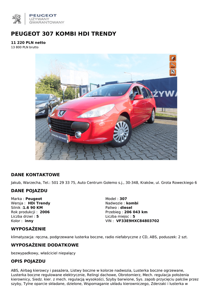 PEUGEOT 307 KOMBI HDI TRENDY 11 220 PLN netto 13 800 PLN brutto DANE KONTAKTOWE Jakub, Warzecha, Tel.: 501 29 33 75, Auto Centrum Golemo s.j., 30-348, Kraków, ul. Grota Roweckiego 6 DANE POJAZDU Marka : Peugeot Wersja : HDi Trendy Silnik :1.6 90 KM Rok produkcji : 2006 Liczba drzwi : 5 Kolor : inny Model : 307 Nadwozie : kombi Paliwo : diesel Przebieg : 206 043 km Liczba miejsc : 5 VIN : VF33E9HXC84803702 WYPOSAŻENIE klimatyzacja: ręczna, podgrzewane lusterka boczne, radio niefabryczne z CD, ABS, poduszek: 2 szt. WYPOSAŻENIE DODATKOWE bezwypadkowy, właściciel niepalący OPIS POJAZDU ABS, Airbag kierowcy i pasażera, Listwy boczne w kolorze nadwozia, Lusterka boczne ogrzewane, Lusterka boczne regulowane elektrycznie, Relingi dachowe, Obrotomierz, Mech. regulacja położenia kierownicy, Siedz. kier. z mech. regulacją wysokości, Szyby barwione, Sys. zapob przycięciu palców przez szyby, Tylne oparcie składane, dzielone, Wspomaganie układu kierowniczego, Zderzaki i lusterka w kolorze nadwozia, Zamek centralny, Światła przeciwmgielne, Komputer pokładowy, Klamki w kolorze nadwozia, Klimatyzacja, Immobilizer, El. podnoszenie szyb, przód, 4/5 zagłówki, Radio CD !!! W przypadku zainteresowania naszą ofertą prosimy o wcześniejszy kontakt w celu potwierdzenia dostępności oraz lokalizacji samochodu !!! Więcej informacji na temat tego samochodu oraz całej naszej oferty: Autoryzowany salon Peugeot Kraków ul. Grota Roweckiego 6 Jakub Warzecha - doradca handlowy Tel. +48 501 29 33 75 Agnieszka Szymańska-Uchwat - specjalista ds. Kredytów, Lesingów i Ubezpieczeń Tel. +48 693 93 25 21 Autoryzowany salon Citroen Kraków ul. Opolska 9 Tomasz Meus – Kierownik Samochodów Używanych Tel. +48 693 93 27 67 Michał Mikołajczak - doradca handlowy Tel. +48 609 44 10 28 Agnieszka Szczuka-Łach - specjalista ds. Kredytów, Lesingów i Ubezpieczeń Tel. +48 693 93 27 69 Autoryzowany salon Peugeot Nowy Targ ul. Podtatrzańska 3 Marcin Gerlach – kierownik salonu Tel. +48 607 30 52 55 Stasik Paweł - specjalista d/s ubezpieczeń Tel. +48 725 29 16 16 QR CODE DLA OGŁOSZENIA W SERWISIE UZYWANYGWARANTOWANY.PL Powered by TCPDF (www.tcpdf.org)
