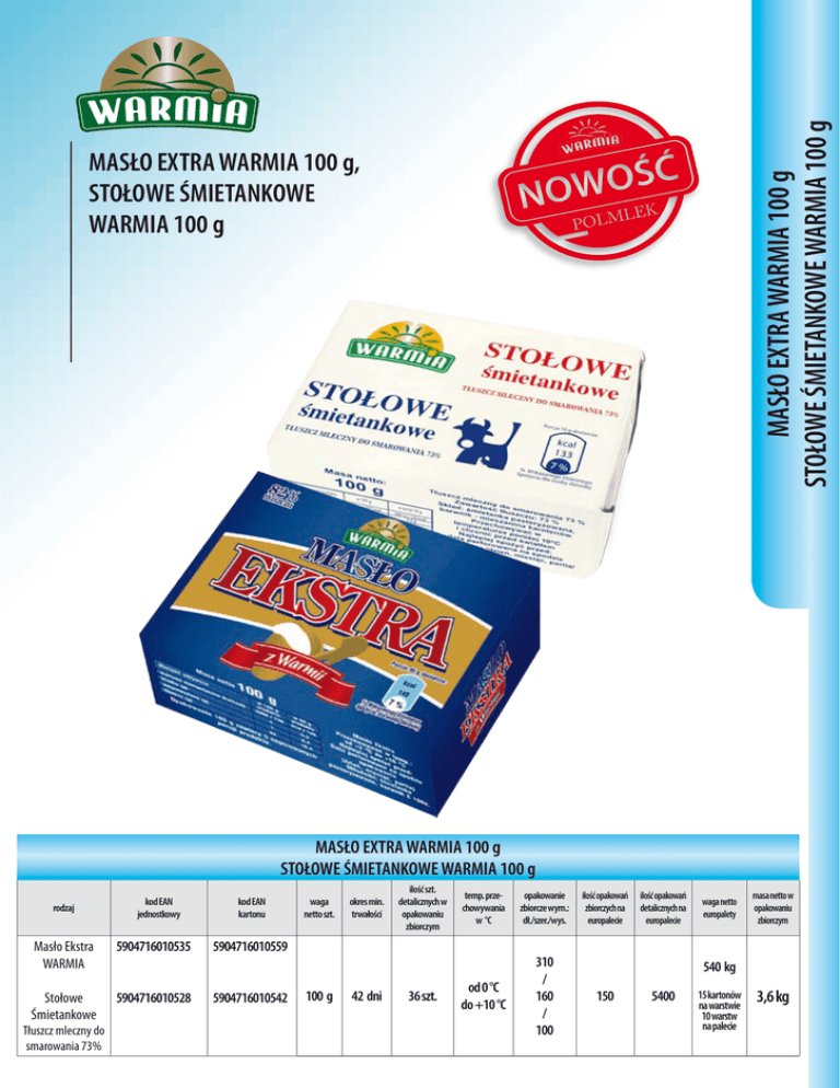 MASŁO EXTRA WARMIA 100 g STOŁOWE ŚMIETANKOWE WARMIA 100 g MASŁO EXTRA WARMIA 100 g, STOŁOWE ŚMIETANKOWE WARMIA 100 g MASŁO EXTRA WARMIA 100 g STOŁOWE ŚMIETANKOWE WARMIA 100 g rodzaj kod EAN jednostkowy Masło Ekstra WARMIA 5904716010535 Stołowe Śmietankowe 5904716010528 Tłuszcz mleczny do smarowania 73% kod EAN kartonu waga netto szt. okres min. trwałości ilość szt. detalicznych w opakowaniu zbiorczym temp. przechowywania w °C opakowanie zbiorcze wym.: dł./szer./wys. od 0 °C do +10 °C 310 / 160 / 100 5904716010559 5904716010542 100 g 42 dni 36 szt. ilość opakowań zbiorczych na europalecie ilość opakowań detalicznych na europalecie waga netto europalety masa netto w opakowaniu zbiorczym 540 kg 150 5400 15 kartonów na warstwie 10 warstw na palecie 3,6 kg