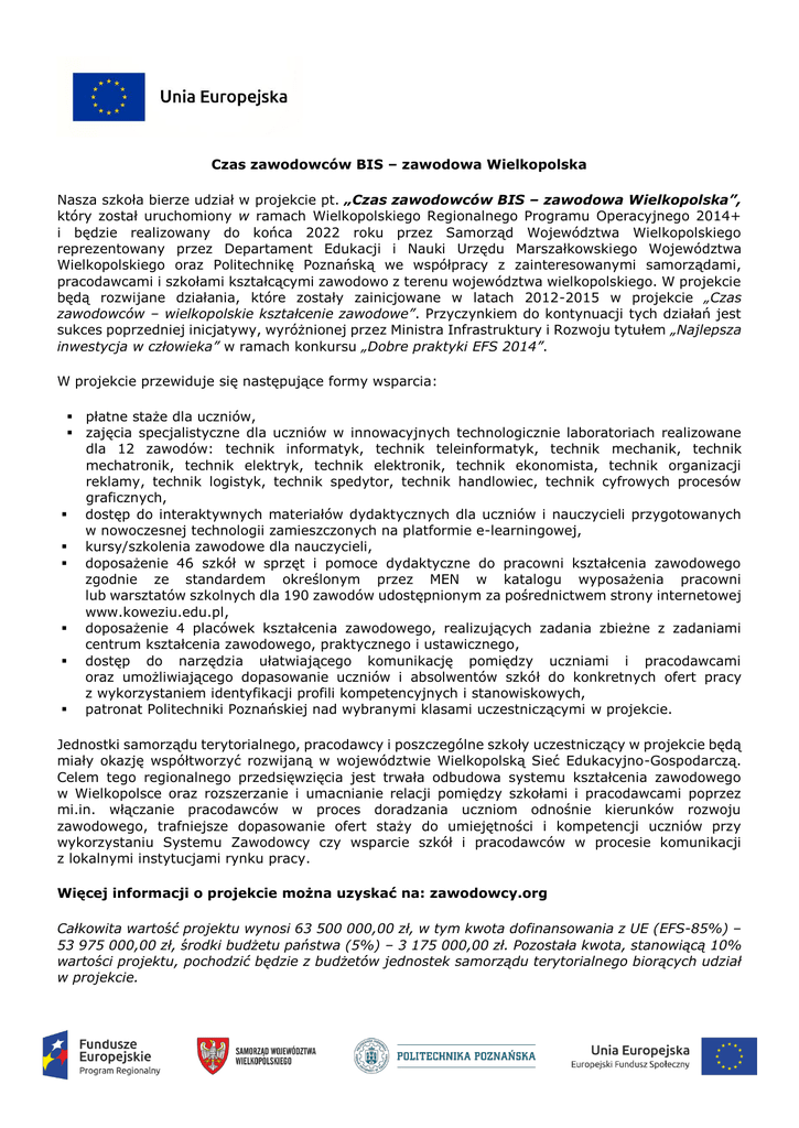 Czas zawodowców BIS – zawodowa Wielkopolska Nasza szkoła bierze udział w projekcie pt. „Czas zawodowców BIS – zawodowa Wielkopolska”, który został uruchomiony w ramach Wielkopolskiego Regionalnego Programu Operacyjnego 2014+ i będzie realizowany do końca 2022 roku przez Samorząd Województwa Wielkopolskiego reprezentowany przez Departament Edukacji i Nauki Urzędu Marszałkowskiego Województwa Wielkopolskiego oraz Politechnikę Poznańską we współpracy z zainteresowanymi samorządami, pracodawcami i szkołami kształcącymi zawodowo z terenu województwa wielkopolskiego. W projekcie będą rozwijane działania, które zostały zainicjowane w latach 2012-2015 w projekcie „Czas zawodowców – wielkopolskie kształcenie zawodowe”. Przyczynkiem do kontynuacji tych działań jest sukces poprzedniej inicjatywy, wyróżnionej przez Ministra Infrastruktury i Rozwoju tytułem „Najlepsza inwestycja w człowieka” w ramach konkursu „Dobre praktyki EFS 2014”. W projekcie przewiduje się następujące formy wsparcia: płatne staże dla uczniów, zajęcia specjalistyczne dla uczniów w innowacyjnych technologicznie laboratoriach realizowane dla 12 zawodów: technik informatyk, technik teleinformatyk, technik mechanik, technik mechatronik, technik elektryk, technik elektronik, technik ekonomista, technik organizacji reklamy, technik logistyk, technik spedytor, technik handlowiec, technik cyfrowych procesów graficznych, dostęp do interaktywnych materiałów dydaktycznych dla uczniów i nauczycieli przygotowanych w nowoczesnej technologii zamieszczonych na platformie e-learningowej, kursy/szkolenia zawodowe dla nauczycieli, doposażenie 46 szkół w sprzęt i pomoce dydaktyczne do pracowni kształcenia zawodowego zgodnie ze standardem określonym przez MEN w katalogu wyposażenia pracowni lub warsztatów szkolnych dla 190 zawodów udostępnionym za pośrednictwem strony internetowej www.koweziu.edu.pl, doposażenie 4 placówek kształcenia zawodowego, realizujących zadania zbieżne z zadaniami centrum kształcenia zawodowego, praktycznego i ustawicznego, dostęp do narzędzia ułatwiającego komunikację pomiędzy uczniami i pracodawcami oraz umożliwiającego dopasowanie uczniów i absolwentów szkół do konkretnych ofert pracy z wykorzystaniem identyfikacji profili kompetencyjnych i stanowiskowych, patronat Politechniki Poznańskiej nad wybranymi klasami uczestniczącymi w projekcie. Jednostki samorządu terytorialnego, pracodawcy i poszczególne szkoły uczestniczący w projekcie będą miały okazję współtworzyć rozwijaną w województwie Wielkopolską Sieć Edukacyjno-Gospodarczą. Celem tego regionalnego przedsięwzięcia jest trwała odbudowa systemu kształcenia zawodowego w Wielkopolsce oraz rozszerzanie i umacnianie relacji pomiędzy szkołami i pracodawcami poprzez mi.in. włączanie pracodawców w proces doradzania uczniom odnośnie kierunków rozwoju zawodowego, trafniejsze dopasowanie ofert staży do umiejętności i kompetencji uczniów przy wykorzystaniu Systemu Zawodowcy czy wsparcie szkół i pracodawców w procesie komunikacji z lokalnymi instytucjami rynku pracy. Więcej informacji o projekcie można uzyskać na: zawodowcy.org Całkowita wartość projektu wynosi 63 500 000,00 zł, w tym kwota dofinansowania z UE (EFS-85%) – 53 975 000,00 zł, środki budżetu państwa (5%) – 3 175 000,00 zł. Pozostała kwota, stanowiącą 10% wartości projektu, pochodzić będzie z budżetów jednostek samorządu terytorialnego biorących udział w projekcie.