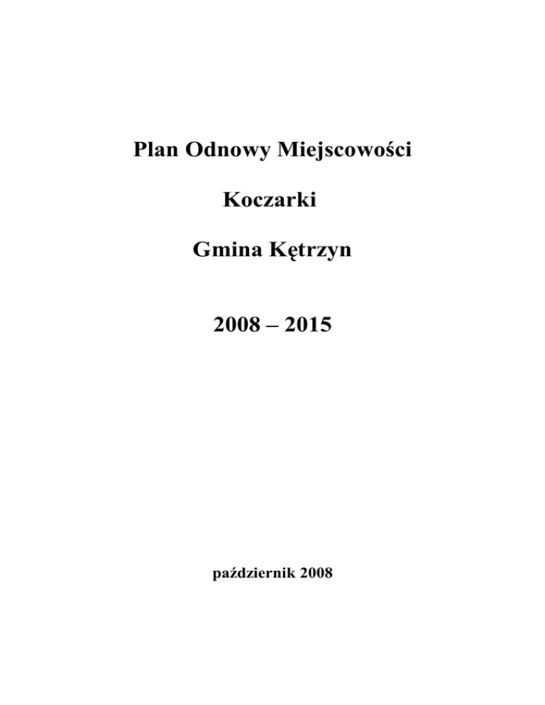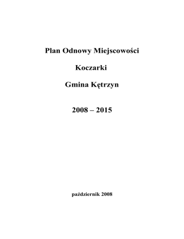 Plan Odnowy Miejscowości Koczarki Gmina Kętrzyn 2008 – 2015 październik 2008 Spis treści I. Charakterystyka miejscowości - 3 str. a. Historia II. Kierunki rozwoju - 4 str. a. Metoda opracowania planu rozwoju b. Horyzont czasowy realizacji planu rozwoju c. Finansowanie planu rozwoju d. Priorytety III. Inwentaryzacja zasobów- 6 str. a. Obszary badania stanu zasobów miejscowych, walory środowiska lokalnego b. Obszary badania stanu zasobów miejscowych c. Potrzeby środowiska lokalnego IV. Analiza SWOT – 8 str. V. Planowane przedsięwzięcia – 9 str. a. Opis planowanego przedsięwzięcia b. Szacunkowy koszt planowanych przedsięwzięć VI. Harmonogram realizacji planowanych przedsięwzięć – 10 str. VII. Załączniki – 10 str. 2 Plan odnowy miejscowości Koczarki 2008 - 2015 I. Charakterystyka miejscowości Koczarki- wieś położona w województwie warmińsko-mazurskim, w powiecie kętrzyńskim, w południowo-wschodniej części Gminy Kętrzyn. Liczba mieszkańców – 255 osób ( stan na dzień 01.01.2008). a. Historia KOCZARKI, przed II wojną światową KOTZARGEN, EICHHÖHE od 1938r. Data założenia wsi nie jest znana. W XVII i XVIII w. gospodarzyła tu szlachecka rodzina Sojacińskich -Sujatów należąca do arian, czyli do braci polskich osiadłych w Prusach. Do Koczarek arianie dotarli za pośrednictwem Siedmiogrodu - wskazują na to genealogie niektórych miejscowych Mazurów (piśmienni byli od XVII w.) Przed II wojną światową Koczarki znajdowały się na terenie powiatu mrągowskiego. Obok majątku ziemskiego, na którego terenie znajduje się dwór wybudowany w połowie XIX w., w Koczarkach funkcjonowały także gospodarstwa chłopskie. Majątek ziemski po 1945 użytkowany był jako PGR. W Koczarkach znajdował się podobóz Stalagu I-A w Stabławkach. W czasie II wojny światowej przetrzymywani byli tu jeńcy i robotnicy przymusowi zatrudniani głównie przy kopaniu rowów przeciwpancernych. Warunki życia w tym obozie opisane zostały we wspomnieniach Kazimierza Miączyńskiego, zamieszczonych w publikacji Ze znakiem "P" relacje i wspomnienia z robót przymusowych w Prusach Wschodnich w latach II wojny światowej (Olsztyn 1985 r.). Jak wynika ze wspomnień Miączyńskiego, do Koczarek trafił w 1944, gdy na terenie Prus rozpoczęto akcję budowy okopów. Autor wspomnień podaje, że w Koczarkach zakwaterowanych było ok. 3000 ludzi, którzy spali m.in w stodole i oborze. Pracowali w grupach po 50 osób, podzielonych jeszcze na podgrupy po 10 osób. Praca przy kopaniu okopów trwała 12 godzin. Dzienne wyżywienie stanowiła zupa z brukwi na obiad i kolację oraz jeden chleb na cztery osoby i 42 gramy margaryny na osobę. W czasie funkcjonowania obozu w Koczarkach zmarło 13 robotników przymusowych, którzy pochowani zostali na miejscowym cmentarzu. Barak z czerwonej cegły, który służył jako stołówka, kuchnia i magazyn żywności, od 1945 do 1965 był wykorzystywany jako sezonowe przedszkole. 3 Plan odnowy miejscowości Koczarki 2008 - 2015 Przed przejęciem PGR przez AWRSP Zakład Koczarki wchodził w skład PGR Nakomiady. PGR Koczarki miał powierzchnię 800 ha użytków rolnych i utrzymywano tam 120 krów dojnych. Po 1945 w Koczarkach zmniejszyła się liczba gospodarstw chłopskich. Znaczna część Mazurów, w wyniku różnego rodzaju nacisków wyjechała do Niemiec. Miejscowa ludność zawsze zachowywała postawę zrozumienia i tolerancji. W dniu 8 lipca 2001 otworzono tu kaplicę przynależną do Parafii EwngelickoAugsburskiej w Kętrzynie. W uroczystości otwarcia kaplicy uczestniczył biskup Diecezji Mazurskiej Rudolf Bażanowski. W Koczarkach jest czynny cmentarz ewangelicki. We wsi znajduje się budynek dawnej szkoły wybudowanej przed 1945, a użytkowanej także po II wojnie światowej. Obecnie dzieci z Koczarek dowożone są do Szkoły Podstawowej w Nakomiadach i do Gimnazjum Gminnego w Karolewie. W 1910 było tu 337 mieszkańców, w tym 63 w majątku.. W 2000 było tu 271 mieszkańców. II. Kierunki rozwoju a. Metoda opracowania planu rozwoju Metodę opracowania możemy opisać jako partnerską, tzn. koncepcja planu rozwoju jest wynikiem rozmów, spotkań i dyskusji prowadzonych przez mieszkańców z władzami gminy i przedstawicielami społeczności lokalnej miejscowości Koczarki. Podstawą tej koncepcji są wyniki ankiety przeprowadzonej przez mieszkańców Koczarek podczas konsultacji społecznych prowadzonych dla analizy potrzeb i oczekiwań mieszkańców wsi. Na podstawie wyników ankiety i obserwacji środowiska lokalnego, jak również na podstawie wymienionych wyżej danych wyjściowych zostały określone wszystkie ważne obszary problemowe oraz preferencje rozwojowe wynikające z istniejących uwarunkowań. b. Horyzont czasowy realizacji planu rozwoju Plan rozwoju obejmuje cele i priorytety, których realizacja sięga II etapu programowania pomocy z Unii Europejskiej t.j. do 2015. c. Finansowanie planu rozwoju 4 Plan odnowy miejscowości Koczarki 2008 - 2015 Źródłami finansowania zadań w ramach Planu Rozwoju Miejscowości Koczarki będą: - Budżet Gminy, - pozabudżetowe środki pomocowe, w tym głównie fundusze strukturalne : Europejski Fundusz Rozwoju Regionalnego ( EFRR ), Program Rozwoju Obszarów Wiejskich i Europejski Fundusz Społeczny (EFS ). d. Priorytety Koczarki, jako miejscowość wchodząca w skład Gminy Kętrzyn, podporządkowana jest strategicznym celom rozwoju całej gminy. Niemniej oczekiwania i potrzeby mieszkańców nie są w dużej mierze zaspokajane przez gminę, a to z powodu braku pieniędzy w kasie, budżecie gminy. Perspektywistycznie istnieje koncepcja lepszej współpracy gminy z mieszkańcami po to, ażeby wspólnie działać na rzecz lokalnego rozwoju. Poniżej przedstawione zostały priorytety rozwojowe ( w kolejności przyznanych punktów) wyznaczone przez samych mieszkańców Koczarek w badaniu ankietowym przeprowadzonym na spotkaniu konsultacyjnym: 1. Infrastruktura kanalizacyjna. 2. O
