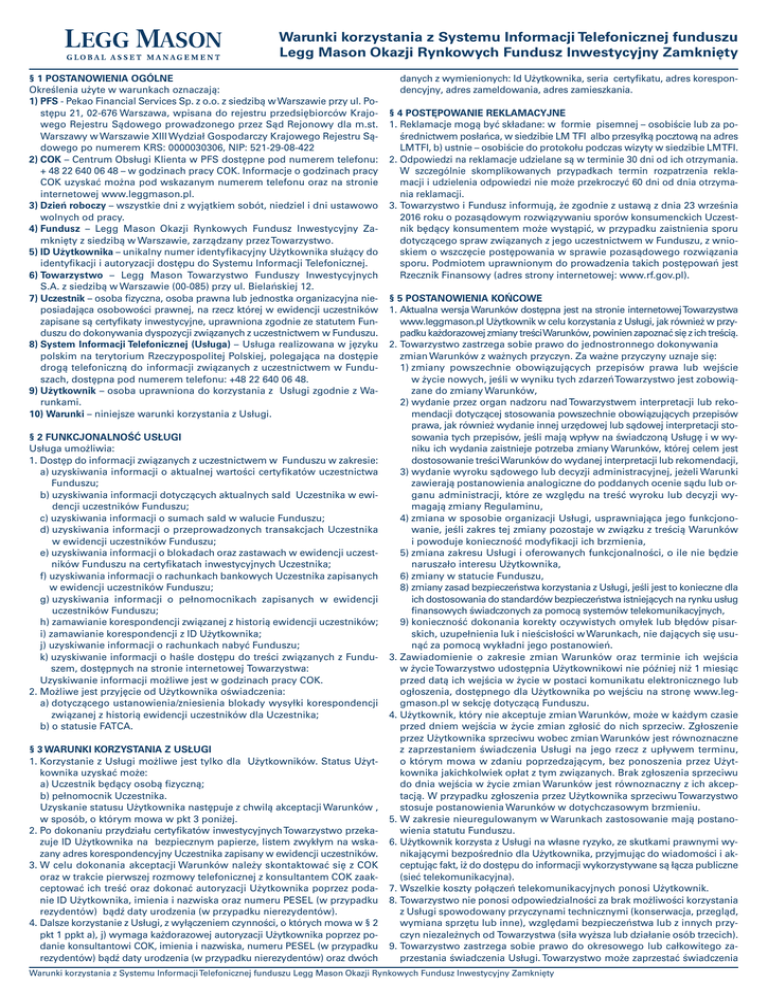 Warunki korzystania z Systemu Informacji Telefonicznej funduszu Legg Mason Okazji Rynkowych Fundusz Inwestycyjny Zamknięty § 1 POSTANOWIENIA OGÓLNE Określenia użyte w warunkach oznaczają: 1) PFS - Pekao Financial Services Sp. z o.o. z siedzibą w Warszawie przy ul. Postępu 21, 02-676 Warszawa, wpisana do rejestru przedsiębiorców Krajowego Rejestru Sądowego prowadzonego przez Sąd Rejonowy dla m.st. Warszawy w Warszawie XIII Wydział Gospodarczy Krajowego Rejestru Sądowego po numerem KRS: 0000030306, NIP: 521-29-08-422 2) COK – Centrum Obsługi Klienta w PFS dostępne pod numerem telefonu: + 48 22 640 06 48 – w godzinach pracy COK. Informacje o godzinach pracy COK uzyskać można pod wskazanym numerem telefonu oraz na stronie internetowej www.leggmason.pl. 3) Dzień roboczy – wszystkie dni z wyjątkiem sobót, niedziel i dni ustawowo wolnych od pracy. 4) Fundusz – Legg Mason Okazji Rynkowych Fundusz Inwestycyjny Zamknięty z siedzibą w Warszawie, zarządzany przezTowarzystwo. 5) ID Użytkownika – unikalny numer identyfikacyjny Użytkownika służący do identyfikacji i autoryzacji dostępu do Systemu Informacji Telefonicznej. 6) Towarzystwo – Legg Mason Towarzystwo Funduszy Inwestycyjnych S.A. z siedzibą w Warszawie (00-085) przy ul. Bielańskiej 12. 7) Uczestnik – osoba fizyczna, osoba prawna lub jednostka organizacyjna nieposiadająca osobowości prawnej, na rzecz której w ewidencji uczestników zapisane są certyfikaty inwestycyjne, uprawniona zgodnie ze statutem Funduszu do dokonywania dyspozycji związanych z uczestnictwem w Funduszu. 8) System Informacji Telefonicznej (Usługa) – Usługa realizowana w języku polskim na terytorium Rzeczypospolitej Polskiej, polegająca na dostępie drogą telefoniczną do informacji związanych z uczestnictwem w Funduszach, dostępna pod numerem telefonu: +48 22 640 06 48. 9) Użytkownik – osoba uprawniona do korzystania z Usługi zgodnie z Warunkami. 10) Warunki – niniejsze warunki korzystania z Usługi. § 2 FUNKCJONALNOŚĆ USŁUGI Usługa umożliwia: 1. Dostęp do informacji związanych z uczestnictwem w Funduszu w zakresie: a) uzyskiwania informacji o aktualnej wartości certyfikatów uczestnictwa Funduszu; b) uzyskiwania informacji dotyczących aktualnych sald Uczestnika w ewidencji uczestników Funduszu; c) uzyskiwania informacji o sumach sald w walucie Funduszu; d) uzyskiwania informacji o przeprowadzonych transakcjach Uczestnika w ewidencji uczestników Funduszu; e) uzyskiwania informacji o blokadach oraz zastawach w ewidencji uczestników Funduszu na certyfikatach inwestycyjnych Uczestnika; f) uzyskiwania informacji o rachunkach bankowych Uczestnika zapisanych w ewidencji uczestników Funduszu; g) uzyskiwania informacji o pełnomocnikach zapisanych w ewidencji uczestników Funduszu; h) zamawianie korespondencji związanej z historią ewidencji uczestników; i) zamawianie korespondencji z ID Użytkownika; j) uzyskiwanie informacji o rachunkach nabyć Funduszu; k) uzyskiwanie informacji o haśle dostępu do treści związanych z Funduszem, dostępnych na stronie internetowej Towarzystwa: Uzyskiwanie informacji możliwe jest w godzinach pracy COK. 2. Możliwe jest przyjęcie od Użytkownika oświadczenia: a) dotyczącego ustanowienia/zniesienia blokady wysyłki korespondencji związanej z historią ewidencji uczestników dla Uczestnika; b) o statusie FATCA. § 3 WARUNKI KORZYSTANIA Z USŁUGI 1. Korzystanie z Usługi możliwe jest tylko dla Użytkowników. Status Użytkownika uzyskać może: a) Uczestnik będący osobą fizyczną; b) pełnomocnik Uczestnika. Uzyskanie statusu Użytkownika następuje z chwilą akceptacji Warunków , w sposób, o którym mowa w pkt 3 poniżej. 2. Po dokonaniu przydziału certyfikatów inwestycyjnychTowarzystwo przekazuje ID Użytkownika na bezpiecznym papierze, listem zwykłym na wskazany adres korespondencyjny Uczestnika zapisany w ewidencji uczestników. 3. W celu dokonania akceptacji Warunków należy skontaktować się z COK oraz w trakcie pierwszej rozmowy telefonicznej z konsultantem COK zaakceptować ich treść oraz dokonać autoryzacji Użytkownika poprzez podanie ID Użytkownika, imienia i nazwiska oraz numeru PESEL (w przypadku rezydentów) bądź daty urodzenia (w przypadku nierezydentów). 4. Dalsze korzystanie z Usługi, z wyłączeniem czynności, o których mowa w § 2 pkt 1 ppkt a), j) wymaga każdorazowej autoryzacji Użytkownika poprzez podanie konsultantowi COK, imienia i nazwiska, numeru PESEL (w przypadku rezydentów) bądź daty urodzenia (w przypadku nierezydentów) oraz dwóch danych z wymienionych: Id Użytkownika, seria certyfikatu, adres korespondencyjny, adres zameldowania, adres zamieszkania. § 4 POSTĘPOWANIE REKLAMACYJNE 1. Reklamacje mogą być składane: w formie pisemnej – osobiście lub za pośrednictwem posłańca, w siedzibie LM TFI albo przesyłką pocztową na adres LMTFI, b) ustnie – osobiście do protokołu podczas wizyty w siedzibie LMTFI. 2. Odpowiedzi na reklamacje udzielane są w terminie 30 dni od ich otrzymania. W szczególnie skomplikowanych przypadkach termin rozpatrzenia reklamacji i udzielenia odpowiedzi nie może przekroczyć 60 dni od dnia otrzymania reklamacji. 3. Towarzystwo i Fundusz informują, że zgodnie z ustawą z dnia 23 września 2016 roku o pozasądowym rozwiązywaniu sporów konsumenckich Uczestnik będący konsumentem może wystąpić, w przypadku zaistnienia sporu dotyczącego spraw związanych z jego uczestnictwem w Funduszu, z wnioskiem o wszczęcie postępowania w sprawie pozasądowego rozwiązania sporu. Podmiotem uprawnionym do prowadzenia takich postępowań jest Rzecznik Finansowy (adres strony internetowej: www.rf.gov.pl). § 5 POSTANOWIENIA KOŃCOWE 1. Aktualna wersja Warunków dostępna jest na stronie internetowejTowarzystwa www.leggmason.pl Użytkownik w celu korzystania z Usługi, jak również w przypadku każdorazowej zmiany treściWarunków, powinien zapoznać się z ich treścią. 2. Towarz