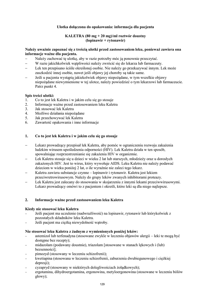 Ulotka dołączona do opakowania: informacja dla pacjenta KALETRA (80 mg + 20 mg)/ml roztwór doustny (lopinawir + rytonawir) Należy uważnie zapoznać się z treścią ulotki przed zastosowaniem leku, ponieważ zawiera ona informacje ważne dla pacjenta. Należy zachować tę ulotkę, aby w razie potrzeby móc ją ponownie przeczytać. W razie jakichkolwiek wątpliwości należy zwrócić się do lekarza lub farmaceuty. Lek ten przepisano ściśle określonej osobie. Nie należy go przekazywać innym. Lek może zaszkodzić innej osobie, nawet jeśli objawy jej choroby są takie same. Jeśli u pacjenta wystąpią jakiekolwiek objawy niepożądane, w tym wszelkie objawy niepożądane niewymienione w tej ulotce, należy powiedzieć o tym lekarzowi lub farmaceucie. Patrz punkt 4. Spis treści ulotki: 1. Co to jest lek Kaletra i w jakim celu się go stosuje 2. Informacje ważne przed zastosowaniem leku Kaletra 3. Jak stosować lek Kaletra 4. Możliwe działania niepożądane 5. Jak przechowywać lek Kaletra 6. Zawartość opakowania i inne informacje 1. Co to jest lek Kaletra i w jakim celu się go stosuje Lekarz prowadzący przepisał lek Kaletra, aby pomóc w ograniczeniu rozwoju zakażenia ludzkim wirusem upośledzenia odporności (HIV). Lek Kaletra działa w ten sposób, spowalniając rozprzestrzenianie się zakażenia HIV w organizmie. Lek Kaletra stosuje się u dzieci w wieku 2 lat lub starszych, młodzieży oraz u dorosłych zakażonych HIV. Jest to wirus, który wywołuje AIDS. Leku Kaletra nie należy podawać dzieciom w wieku poniżej 2 lat, o ile wyraźnie nie zaleci tego lekarz. Kaletra zawiera substancje czynne – lopinawir i rytonawir. Kaletra jest lekiem przeciwretrowirusowym. Należy do grupy leków zwanych inhibitorami proteazy. Lek Kaletra jest zalecany do stosowania w skojarzeniu z innymi lekami przeciwwirusowymi. Lekarz prowadzący omówi to z pacjentem i określi, które leki są dla niego najlepsze. 2. Informacje ważne przed zastosowaniem leku Kaletra Kiedy nie stosować leku Kaletra Jeśli pacjent ma uczulenie (nadwrażliwość) na lopinawir, rytonawir lub którykolwiek z pozostałych składników leku Kaletra. Jeśli pacjent ma ciężką niewydolność wątroby. Nie stosować leku Kaletra z żadnym z wymienionych poniżej leków: astemizol lub terfenadyna (stosowane zwykle w leczeniu objawów alergii – leki te mogą być dostępne bez recepty); midazolam (podawany doustnie), triazolam [stosowane w stanach lękowych i (lub) bezsenności]; pimozyd (stosowany w leczeniu schizofrenii); kwetiapina (stosowana w leczeniu schizofrenii, zaburzenia dwubiegunowego i ciężkiej depresji); cyzapryd (stosowany w niektórych dolegliwościach żołądkowych); ergotamina, dihydroergotamina, ergonowina, metyloergonowina (stosowane w leczeniu bólów głowy); 129 amiodaron (stosowany w leczeniu niemiarowej pracy serca); lowastatyna, symwastatyna (stosowane w celu zmniejszenia stężenia cholesterolu we krwi); alfuzosyna [stosowana u mężczyzn w leczeniu łagodnego rozrostu gruczołu krokowego (BPH – ang. Benign prostatic hyperplasia)]; kwas fusydowy (stosowany w leczeniu zakażeń skóry wywołanych przez gronkowce takich, jak liszajec i zakażone zapalenie skóry). Kwas fusydowy stosowany w leczeniu długotrwałych zakażeń kości i stawów można przyjmować pod nadzorem lekarza (patrz punkt „Kaletra a inne leki”); kolchicyna (lek przeciw dnie moczanowej) – pacjenci z zaburzeniami czynności nerek lub wątroby; awanafil lub wardenafil (stosowane w leczeniu zaburzeń erekcji); syldenafil stosowany w leczeniu nadciśnienia płucnego (wysokie ciśnienie krwi w tętnicy płucnej); pod kontrolą lekarza można stosować syldenafil w leczeniu zaburzeń erekcji (patrz punkt „Ostrzeżenia i środki ostrożności”); preparaty zawierające dziurawiec zwyczajny (Hypericum perforatum). Należy zapoznać się z listą leków w części „Kaletra a inne leki”, aby uzyskać informacje o innych lekach, które należy stosować z zachowaniem szczególnej ostrożności. Jeśli pacjent aktualnie przyjmuje któryś z tych leków, powinien zapytać lekarza prowadzącego, czy nie jest konieczna zmiana leczenia współistniejących chorób albo leczenia przeciwretrowirusowego. Ostrzeżenia i środki ostrożności Ważne informacje Lek Kaletra nie powoduje wyleczenia zakażenia HIV ani AIDS. Osoby stosujące lek Kaletra mogą ulegać zakażeniom lub innym schorzeniom związanym z zakażeniem HIV i z AIDS. Ważne jest zatem, aby pacjent pozostawał pod opieką lekarza w czasie stosowania leku Kaletra. Pacjent nadal może przenosić HIV podczas stosowania tego leku, pomimo że skuteczna terapia przeciwretrowirusowa zmniejsza to ryzyko. Pacjent powinien omówić z lekarzem środki ostrożności konieczne w celu uniknięcia zakażania innych osób. Należy poinformować lekarza prowadzącego, jeśli pacjent choruje (chorował) na: hemofilię typu A lub B, ponieważ lek Kaletra może zwiększyć ryzyko krwawienia; cukrzycę, ponieważ informowano o zwiększaniu się stężenia cukru we krwi u pacjentów otrzymujących lek Kaletra; schorzenia wątroby w przeszłości, ponieważ u pacjentów, u których w przeszłości występowała choroba wątroby, w tym przewlekłe wirusowe zapalenie wątroby typu B lub C, istnieje zwiększone zagrożenie ciężkimi i grożącymi zgonem powikłaniami ze strony wątroby. Należy poinformować lekarza, jeśli u pacjenta wystąpią: nudności, wymioty, bóle brzucha, trudności w oddychaniu i znaczne osłabienie mięśni rąk i nóg, ponieważ objawy te mogą wskazywać na zwiększenie stężenia kwasu mlekowego; pragnienie, częste oddawanie moczu, niewyraźne widzenie lub zmniejszenie masy ciała, ponieważ może to wskazywać na zwiększenie stężenia cukru we krwi; nudności, wymioty, bóle brzucha, ponieważ znaczne zwiększenie zawartości triglicerydów (tłuszczów we krwi) uważa się za czynnik ryzyka zapalenia trzustki i takie objawy mogą wskazywa