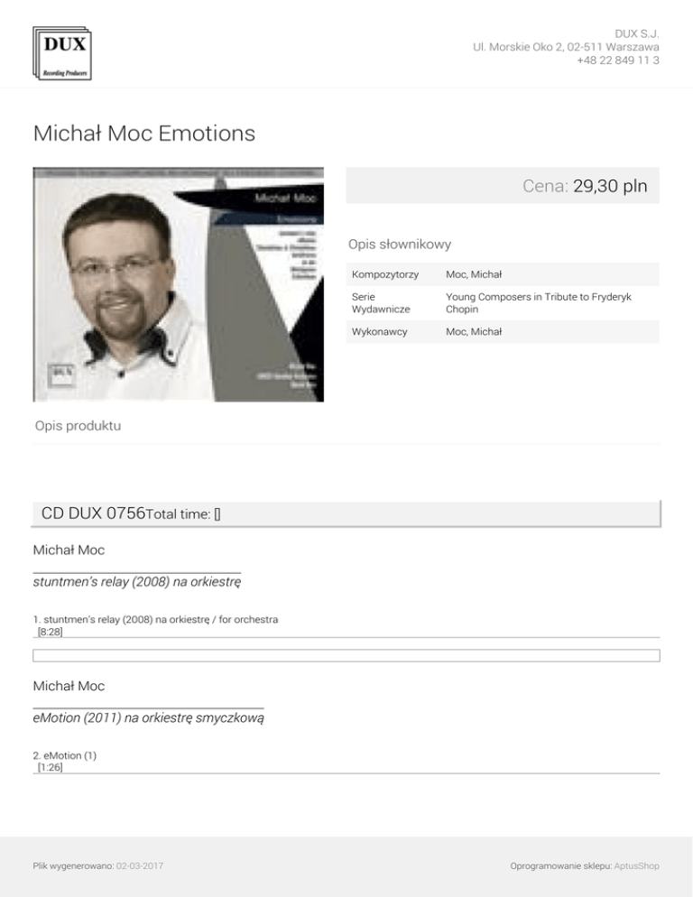 DUX S.J. Ul. Morskie Oko 2, 02-511 Warszawa +48 22 849 11 3 Michał Moc Emotions Cena: 29,30 pln Opis słownikowy Kompozytorzy Moc, Michał ∎ Serie Wydawnicze Young Composers in Tribute to Fryderyk Chopin Wykonawcy Moc, Michał ∎ Opis produktu CD DUX 0756Total time: [] Michał Moc stuntmen’s relay (2008) na orkiestrę 1. stuntmen’s relay (2008) na orkiestrę / for orchestra [8:28] Michał Moc eMotion (2011) na orkiestrę smyczkową 2. eMotion (1) [1:26] Plik wygenerowano: 02-03-2017 Oprogramowanie sklepu: AptusShop DUX S.J. Ul. Morskie Oko 2, 02-511 Warszawa +48 22 849 11 3 3. eMotion (2) [1:56] 4. eMotion (3) [1:43] 5. 4th e Motion [3:03] 6. 5th e Motion [2:42] 7. 6th e Motion [2:08] Michał Moc Chordalians & Chordaliens (2004) na orkiestrę kameralną i akordeon 8. Chordalians & Chordaliens (2004) na orkiestrę kameralną i akordeon/ for chamber orchestra and accordion [8:00] Michał Moc barbArioso (2009) dla młodzieżowej orkiestry smyczkowej z poliptyku: ...ad astra 9. barbArioso (2009) dla młodzieżowej orkiestry smyczkowej z poliptyku: ...ad astra/ for youth string orchestra from the polypticon: …ad astra [5:45] Michał Moc as per (2007) na orkiestrę smyczkową 10. as per (2007) na orkiestrę smyczkową / for string orchestra [6:24] Michał Moc Plik wygenerowano: 02-03-2017 Oprogramowanie sklepu: AptusShop DUX S.J. Ul. Morskie Oko 2, 02-511 Warszawa +48 22 849 11 3 Betelgeuse (1999/2000) na akordeon i taśmę 11. Betelgeuse (1999/2000) na akordeon i taśmę (nagranie live) / for accordion and tape (live recording) [8:42] Michał Moc Achordeon (2007) na orkiestrę smyczkową i taśmę 12. Achordeon (2007) na orkiestrę smyczkową i taśmę / for string orchestra and tape [6:14] Wykonawcy: Michał Moc /akordeon/ Plik wygenerowano: 02-03-2017 Powered by TCPDF (www.tcpdf.org) Oprogramowanie sklepu: AptusShop