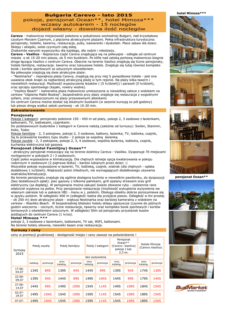 Bułgaria Carevo - lato 2015 pokoje, pensjonat Ocean**, hotel Mimoza*** wczasy autokarem - 15 noclegów dojazd własny - dowolna ilość noclegów hotel Mimoza*** Carevo - malownicza miejscowość położona w południowo wschodniej Bułgarii, nad kryształowo czystym Morzem Czarnym, z pięcioma atrakcyjnymi plażami. Pełna infrastruktura turystyczna: pensjonaty, hoteliki, tawerny, restauracje, puby, kawiarenki i dyskoteki. Place zabaw dla dzieci. Sklepy i sklepiki, wiele czynnych całą dobę. Znakomite warunki wypoczynku dla każdego, dla rodzin i młodzieży. Carevo - Vasilico - Najstarsza część Careva znajdująca się na półwyspie - odległa od centrum miasta o ok 15-20 min pieszo, ok 5 min busikiem. Po klifie nad zatoką portową malowniczo biegnie droga łącząca Vasilico z centrum Careva. Obecnie na terenie Vasilico znajdują się liczne pensjonaty, hotele familijne, restauracje. tawerny oraz luksusowe hotele. Znajduje się tutaj również kompleks boisk i kortów sportowych ze sztucznym oświetleniem. Na półwyspie znajdują się dwie atrakcyjne plaże: - "Nestinarka" - największa plaża Careva, znajdują się przy niej 5 gwiazdkowe hotele - jest ona uważana obok Arapii za najbardziej atrakcyjną plażę w tym rejonie. Na plaży kilka tawern i niewielkich restauracji. Możliwość wypożyczenia leżaków ( (5 lv/dzień)) i parasoli (5 lv/dzień), oraz sprzętu sportowego (kajaki, rowery wodne). - "Vasilico Beach" - kameralna plaża malowniczo umieszczona w niewielkiej zatoce z widokiem na cerkiew "Uśpienia Matki Boskiej", bezpośrednio przy plaży znajduje się restauracja z wygodnymi sofami, oraz umieszczonymi na plaży przewiewnymi altankami. Do centrum Careva można dostać się lokalnymi busikami (w sezonie kursują co pół godziny) lub pieszo drogą wzdłuż zatoki portowej - ok 15-20 min. Zakwaterowanie Pensjonaty Pokoje I kategorii- pensjonaty położone 150 - 450 m od plaży, pokoje 2, 3 osobowe z łazienkami, balkonami, TV, lodówkami, czajnikami. Do podstawowych budynków 1 kategorii w Carevie należą (zależnie od turnusu): Swilen, Stanimir, Kolio, Todor. Pokoje familijne - 2, 3 pokojowe, pokoje 2, 3 osobowe, balkony, łazienka, TV, lodówka, czajnik, Są to przeważnie kwatery typu studio - 2 pokoje ze wspołną łazienką Pokoje zwykłe - 2, 3 pokojowe, pokoje 2, 3, 4 osobowe, wspólna łazienka, lodówka, czajnik, kuchenka elektryczna lub gazowa. Pensjonat (Hotel Familijny) Ocean** - atrakcyjny pensjonat mieszczący się na terenie dzielnicy Careva - Vasiliko. Dysponuje 70 miejscami noclegowymi w pokojach 2 i 3 osobowych. Część pokoi wyposażona w klimatyzację. Dla chętnych istnieje opcja kwaterowania w pokoju rodzinnym 4 osobowym (2 piętrowe łóżka) - bardzo lubianym przez dzieci :) Wszystkie pokoje wyposażone w łazienki, TV, lodówkę, czajnik, wiatrak (dla chętnych - opłata dodatkowa 1 lv/dzień). Większość pokoi chłodnych, nie wymagających dodatkowego używania wiatraków/klimatyzacji. Na terenie pensjonatu znajduje się ogólnie dostępna kuchnia w niewielkim pawiloniku, do dyspozycji (bez dodatkowych opłat): piec gazowy z kilkoma palnikami, grill opalany drzewem oraz grill elektryczny (za dopłatą). W pensjonacie można zakupić świeżo złowione ryby - codziennie rano właściciel wypływa na połów. Przy pensjonacie restauracja (możliwość wykupienia wyżywienia we własnym zakresie lub w pakiecie HB) - menu w j. polskim. Obsługa obiektu dobrze porozumiewa się w języku polskim. W odległości 400 m (odległość realna dla przejście pieszo. Odległość w lini prostej - ok 250 m) dwie atrakcyjne plaże - większa Nestinarka oraz bardziej kameralna z widokiem na cerkiew - Wasiliko Beach. W bezpośredniej bliskości hotelu sklepy spożywcze (czynne do późnych godzin wieczorno - nocnych, liczne restauracje, tawerny oraz kompleks boisk sportowych i kortów tenisowych z oświetleniem sztucznym. W odległości 50m od pensjonatu przystanek busów jeżdżących do centrum Careva (1 lv/os). Hotel Mimoza *** pokoje 2, 3 osobowe z łazienkami, lodówkami, TV sat, WIFI, balkonami. Na terenie hotelu siłownia, niewielki basen oraz restauracja. Turnusy i ceny ceny w promocji grudniowej - dostępność miejsc i ceny zawsze na potwierdzenie ! Pokój zwykły Pokój familijny Pokój I kategorii turnusy 2015 Pensjonat Ocean** (Carevo -Vasilico) pokoje I kat. 2,3 os. Hotele Mimoza (Carevo Vasilico) bez wyżywienia katalog. promocja ceny katalog. promocja ceny katalog. promocja ceny katalog. promocja ceny katalog. promocja 17.0604.07 1345 895 1395 945 1445 995 1395 945 1745 1395 22.0609.07 1395 945 1445 995 1495 1045 1445 995 1795 1445 27.0614.07 1445 995 1495 1095 1545 1145 1495 1095 1845 1545 02.0719.07 1495 1045 1545 1095 1595 1145 1545 1095 1895 1545 07.07- 1495 1045 1545 1095 1595 1145 1545 1095 1895 1545 pensjonat Ocean** inne pensjonaty 24.07 12.0729.07 1495 1045 1545 1095 1595 1145 1545 1095 1895 1545 17.0703.08 1495 1045 1545 1095 1595 1145 1545 1095 1895 1545 22.0708.08 1495 1045 1545 1095 1595 1145 1545 1095 1895 1545 27.0713.08 1495 1045 1545 1095 1595 1145 1545 1095 1895 1545 01.0818.08 1495 1045 1545 1195 1595 1245 1545 1195 1895 1645 06.0823.08 1495 1045 1545 1095 1595 1145 1545 1095 1895 1545 11.0828.08 1495 1045 1545 1095 1595 1145 1545 1095 1895 1545 16.0802.09 1495 1045 1545 1095 1595 1145 1495 1045 1895 1545 21.0807.09 1445 995 1495 1045 1545 1095 1445 995 1845 1495 26.0812.09 1395 945 1445 995 1495 1045 1445 995 1795 1445 31.0817.09 1345 895 1395 945 1445 995 1395 945 1745 1395 05.0922.09 1345 895 1395 945 1445 995 1395 945 1745 1395 a Cena obejmuje ● ● ● ● przejazd autokarem LUX (autokary nowej generacji), zakwaterowanie 15 noclegów opieka pilota, rezydenta, rewelacyjna zabawa, ciepłe morze, pogoda gwarantowana :) Cena nie obejmuje ● opłata klimatyczna 37,50 zł/os/turnus ● ubezpieczenie KL/NW 52,50 zł Zniżki, dopłaty opcjonalne ● dzieci: stała dla dziecka do lat 4 śpiącego razem z rodzicami -