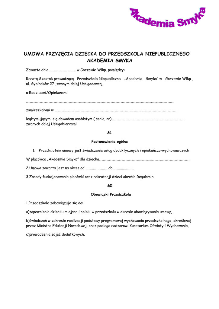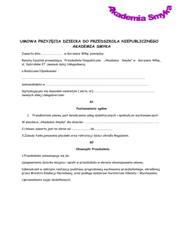 UMOWA PRZYJĘCIA DZIECKA DO PRZEDSZKOLA NIEPUBLICZNEGO AKADEMIA SMYKA Zawarta dnia…………………………… w Gorzowie Wlkp. pomiędzy: Renatą Szostak prowadzącą Przedszkole Niepubliczne „Akademia Smyka” w Gorzowie Wlkp., ul. Sybiraków 27 ,zwanym dalej Usługodawcą, a Rodzicami/Opiekunami ……………………………………………………………………………………………………………………………………………………………. zamieszkałymi w …………………………………………………………………………………………………………………………………. legitymującymi się dowodem osobistym ( seria, nr)…………………………………………………………………………….. zwanych dalej Usługobiorcami. &1 Postanowienia ogólne 1. Przedmiotem umowy jest świadczenie usług dydaktycznych i opiekuńczo-wychowawczych W placówce „Akademia Smyka” dla dziecka……………………………………………………………………………………………….. 2.Umowa zawarta jest na okres od .........................do....................... 3.Zasady funkcjonowania placówki oraz rekrutacji dzieci określa Regulamin. &2 Obowiązki Przedszkola 1.Przedszkole zobowiązuje się do: a)zapewnienia dziecku miejsca i opieki w przedszkolu w okresie obowiązywania umowy, b)świadczeń w zakresie realizacji podstawy programowej wychowania przedszkolnego, określonej przez Ministra Edukacji Narodowej, oraz podlega nadzorowi Kuratorium Oświaty i Wychowania, c)prowadzenia zajęć dodatkowych. &3 Obowiązki Rodziców/Opiekunów 1.Rodzice/Opiekunowie zobowiązują się do: a) Informowania przedszkolna poszczególnych zajęciach zgodnie prowadzącą dane zajęcia, o z przewidywanej obecności i nieobecności na zasadami organizacyjnymi ustalonymi przez osobę b) Wykonywania polecenia pracowników przedszkola, a zwłaszcza z szczególną starannością polecenia dotyczące bezpieczeństwa, c) Bezzwłocznego poinformowania pracowników placówki o infekcjach i chorobach zakaźnych dziecka. &4 Organizacja 1.Przedszkola czynny jest 12 miesięcy w roku w dni powszednie w godzinach od 6.00 do 17.00 poza przerwami ustalonymi w organizacji. 2. Po odebraniu dziecka z przedszkola Rodzic/Opiekun przebywający na terenie placówki wraz z nim jest odpowiedzialny za jego zachowanie i bezpieczeństwo. 3.Dziećmi opiekuje się nauczyciel wychowania przedszkolnego i pomoc nauczyciela &5 Zmiana wysokości czesnego 1. Przedszkole zastrzega sobie możliwość zmiany wysokości opłat w razie wzrostu uzasadnionych kosztów utrzymania Punktu przedszkolnego w tym w szczególności; podwyższenia opłat za dostawę mediów oraz czynszu najmu lokalu czy wzrostu wynagrodzeń kadry pedagogicznej. 2. O planowanej zmianie opłat, o których mowa w punkcie 1 przedszkole powinno powiadomić Rodziców/Opiekunów z miesięcznym wyprzedzeniem osobiście lub za pomocą listu poleconego. 3. Zmiana opłat, o której mowa w punkcie 1 uzasadnia skorzystanie przez Rodzica/Opiekuna z przysługującego mu prawa do; a)wypowiedzenia umowy, z zachowaniem jednomiesięcznego okresu wypowiedzenia ze skutkiem na koniec miesiąca kalendarzowego b) odstąpienia od umowy, jeśli nie rozpoczęto jeszcze jej wykonywania. &6 Okres adaptacyjny 1. Pierwszy miesiąc uczęszczania do przedszkola jest miesiącem próbnym. W przypadku trudności adaptacji w ciągu miesiąca próbnego , Rodzice/Opiekunowie mogą rozwiązać umowę bez zachowania terminu wypowiedzenia. 2. Przedszkole może w sytuacji wskazanej w punkcie 1 rozwiązać umowę z zachowaniem jednomiesięcznego okresu wypowiedzenia ze skutkiem na koniec miesiąca kalendarzowego. &7 Skreślenie z listy 1. W przypadkach i na zasadach określonych w Organizacji, Dyrektor może skreślić dziecko z listy dzieci uczęszczających do przedszkola. 2.Skreślenie dziecka z listy dzieci uczęszczających do przedszkola stanowi podstawę Do wypowiedzenia umowy z zachowaniem jednomiesięcznego okresu wypowiedzenia ze skutkiem na koniec miesiąca kalendarzowego. 3.Za dzień skreślenia dziecka z listy strony uznają dzień upływu okresu wypowiedzenia, opisanego w punkcie 2 powyżej. &8 Płatność 1.Usługi Świadczone w placówce są odpłatne. 2.Opłata stała (czesne) za przedszkole wynosi 350 zł + 6,5 zł/dzień za wyżywienie. Opłata za przedszkole jest jednakowa w każdym miesiącu działalności, niezależnie od przerwy świątecznej, dni ustawowo wolnych od pracy oraz „długich weekendów”. W przypadku nieobecności dziecka odliczana jest opłata za wyżywienie w wysokości 6,5 zł dziennie. 3.Opłaty za przedszkole wnoszone są do 10 dnia każdego miesiąca przelewem na konto firmy 94 2030 0045 1130 0000 0561 7690.Brak terminowej wpłaty wiążę się z naliczeniem odsetek za każdy dzień zwłoki. W przypadku zwłoki w płatności przekraczającej 30 dni przedszkole ma prawo wypowiedzieć umowę, z zachowaniem jednomiesięcznego okresu wypowiedzenia ze skutkiem na koniec miesiąca kalendarzowego, po uprzednim wezwaniu do uiszczenia zaległości 4.Wszystkie dzieci przyjęte do przedszkola podlegają obowiązkowemu ubezpieczeniu od następstwie szczęśliwych wypadków. Koszt ubezpieczenia pokrywają Rodzice. 5. W ramach czesnego gwarantowana jest opieka od godz. 6.00 do 17.00; wyżywienie (śniadanie obiad dwudaniowy, podwieczorek);zajęcia dodatkowe. &9 Odszkodowanie 1. Placówce przysługuje odszkodowanie w wysokości jednomiesięcznej stawki czesnego w przypadku: a)zerwania przez Rodziców umowy z Placówką z naruszeniem postanowień niniejszej umowy, b)rozwiązania przez Placówkę umowy wskutek niepłacenia czesnego, c)rezygnacji z przedszkola bez przewidzianego w umowie miesięcznego pisemnego wypowiedzenia. &10 Inne Usługodawca może odstąpić od niniejszej umowy w trybie natychmiastowym jeżeli: 1.Zachowanie dziecka stwarza zagrożenie bezpieczeństwa dla innych dzieci. 2.N