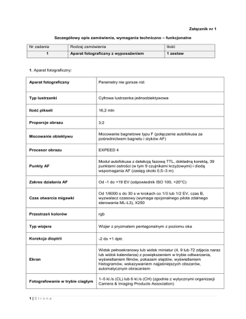Załącznik nr 1 Szczegółowy opis zamówienia, wymagania techniczno – funkcjonalne Nr zadania 1 Rodzaj zamówienia Ilość Aparat fotograficzny z wyposażeniem 1 zestaw 1. Aparat fotograficzny: Aparat fotograficzny Parametry nie gorsze niż: Typ lustrzanki Cyfrowa lustrzanka jednoobiektywowa Ilość pikseli 16,2 mln Proporcje obrazu 3:2 Mocowanie obiektywu Mocowanie bagnetowe typu F (połączenie autofokusa za pośrednictwem bagnetu i styków AF) Procesor obrazu EXPEED 4 Punkty AF Moduł autofokusa z detekcją fazową TTL, dokładną korektą, 39 punktami ostrości (w tym 9 czujnikami krzyżowymi) i diodą wspomagania AF (zasięg około 0,5–3 m) Zakres działania AF Od -1 do +19 EV (odpowiednik ISO 100, +20°C) Czas otwarcia migawki Od 1/8000 s do 30 s w krokach co 1/3 lub 1/2 EV, czas B, wyzwalacz czasowy (wymaga opcjonalnego pilota zdalnego sterowania ML-L3), X250 Przestrzeń kolorów rgb Typ wizjera Wizjer z pryzmatem pentagonalnym z poziomu oka Korekcja dioptrii -2 do +1 dptr. Ekran Widok pełnoekranowy lub widok miniatur (4, 9 lub 72 zdjęcia naraz lub widok kalendarza) z powiększeniem w trybie odtwarzania, wyświetlaniem filmów, pokazem slajdów, wyświetlaniem histogramów, wskazywaniem najjaśniejszych obszarów, automatycznym obracaniem Fotografowanie w trybie ciagłym 1–5 kl./s (CL) lub 6 kl./s (CH) (zgodnie z wytycznymi organizacji Camera & Imaging Products Association) 1|Strona Typ zdjęć NEF (RAW): 12- lub 14-bitowy z kompresją bezstratną lub stratną. JPEG: zgodność z podstawowym formatem JPEG, ustawienia kompresji: Fine (około 1:4), Normal (około 1:8) i Basic (około 1:16); dostępne opcje kompresji: Priorytet wielkości i Optymalna jakość. Rozmiar obrazów 4928 x 3264 [L]; 3696 × 2448 [M]; 2464 × 1632 [S] Rozmiar filmu [NTSC] 1920 × 1080 (24p); 24 (23,976) kl./s. 1280 × 720 (30p); 30 (29,97) kl./s. 1280 × 720 (24p); 24 (23,976) kl./s. 640 × 424 (30p); 30 (29,97) kl./s. [PAL] 1920 × 1080 (24p); 24 (23,976) kl./s. 1280 × 720 (25p); 25 kl./s. 1280 × 720 (24p); 24 (23,976) Złącza USB Hi-Speed. Złącze mini HDMI typu C; monitor aparatu wyłącza się po podłączeniu kabla HDMI. Stereofoniczne typu mini-jack (średnica 3,5 mm) Gniazdo kart pamięci Karty SD (Secure Digital), SDHC i SDXC Zakres ISO Auto, ISO 100 – 25 600, skoku 1/3 lub ½ EV 2. Akcesoria: 2.1 Torba – sztuk1: przeznaczona do lustrzanek średniej wielkości z akcesoriami (dodatkowy obiektyw i lampa), nóżki na spodzie, 2 wewnętrzne komory, 2 zewnętrzne kieszenie, usztywnione dno, pasek na ramię peleryna przeciwdeszczowa wszyta w dodatkową kieszeń torby. 2.2 Torba – sztuk 1: przeznaczona do lustrzanek średniej wielkości, nóżki na spodzie, 1-2 wewnętrzne komory, 1-2 zewnętrzne kieszenie, usztywnione dno, pasek na ramię peleryna przeciwdeszczowa wszyta w dodatkową kieszeń torby. 2.3 Obiektyw – 1 sztuka: ogniskowa - 18 – 105 mm, światłosiła – f/3,5 – 5,6, minimalna odległość zdjęciowa – 1,5 m. 2.4 Akumulator – 1 sztuka/ 1 kpl (dla baterii akumulatorowych). 2|Strona 2.5 Karta pamięci – 2 sztuki, pojemność co najmniej 32 GB, ultra 40 MB/s 2.6 Ładowarka - 1 sztuka, jeśli nie jest w zestawie z oferowanym aparatem. 2.7 Obiektyw szerokokątny (kompatybilny z aparatem body NIKON D3200) - 1 sztuka: ogniskowa – 10-20 mm, światłosiła – f/3,5 kąt widzenia (stopnie) – ok. 105 - 60. Nr zadania 2 Rodzaj zamówienia Ilość Zestaw multimedialny 1 zestaw 1. Projektor – ilość sztuk 1. Lp Parametr Opis parametru 1 Technologia obrazu DLP 2 Minimalna jasność lampy 3000 ANSI Lumen 3 Minimalna rozdzielczość natywna XGA 1024x768 4 Minimalny kontrast 2500 5 Minimalna żywotność lampy w trybie normalnym 3500 godzin 1xVGA DSub-15 pin wejście; 1xHDMI wejście; 6 Złącza wejściowe i wyjściowe (minimalna ilość) 1xComposite Video RCA Chinch wejście; 1xAudio jack 3,5mm wejście; 1xVGA DSub-15 pin – wyjście na monitor 1xAudio Out jack 3,5mm – wyjście sygnału audio - korekcja zniekształceń geometrycznych wyświetlanego obrazu w pionie 7 Wymagane funkcje (minimum) - menu ekranowe w języku polskim - wbudowany głośnik o mocy minimum 2W - kabel zasilający 8 Minimalne wymagane wyposażenie dostarczone wraz z urządzeniem - kabel HDMI, - pilot zdalnego sterowania, 3|Strona - torba do projektora 9 Gwarancja Minimum 36 miesięcy 2. Akcesoria: 2.1 Specyfikacja na ekran do projektora: Lp Parametr Opis parametru 1 Rodzaj i rozmiar ekranu Zwijany, przenośny ekran projekcyjny o minimalnych wymiarach 1650x1220 mm na statywie 2 Wyposażenie dodatkowe Pokrowiec lub obudowa ekranu, zabezpieczająca przed uszkodzeniem ekranu, wyposażona w pasek na ramię oraz rączkę (uchwyt) do przenoszenia 3 Gwarancja Minimum 2 lata. 2.2 Specyfikacja na laptop: Lp Nazwa podzespołu Parametry wymagane 1 Procesor Minimum dwurdzeniowy procesor z obsługą instrukcji 64 bit, wyposażony we własny układ graficzny lub procesor równoważny według wyników testów przeprowadzonych przez Wykonawcę. Wykonawca deklaruje, że procesor uzyskał w testach Pass Mark CPU wynik min. 2700 pkt. (http:// cpubenchmark.net/laptop.html). – proszę podać symbol oferowanego procesora 2 Karta graficzna Zintegrowana, pamięć przydzielana obrębie pamięci operacyjnej 3 Matryca Wielkość min. 15,2” max. 16,1”, o rozdzielczości minimalnej 1366 x 768, matowa z podświetleniem LED 4 Pamięć RAM Min. 4GB DDR3, z możliwością rozszerzenia do min. 8 GB 5 Dysk twardy Pojemność minimum 500 GB, SATA-3 6 Napęd optyczny DVD+/-RW DL 7 Karta sieciowa Zintegrowana, 10/100/1000 MBit/s 8 Karta dźwiękowa Zintegrowana z płytą główną, wbudowany mikrofon, wbudowane głośniki stereo 4|Strona dynamicznie w min. 3x USB w tym co najmniej 1 szt. USB 3.0, 1 x monitor (D-Sub 15), 1 x HDMI, 1 x Ethernet (RJ-45), wejście na mikrofon, wyjście słuchawkowe, wejście zasilania (DC-in), ilość banków pamięci DDR3: min 2 (w tym min. 1 nie zajęty) 9 Wymagane zintegrowane złącza Dodatkowe 