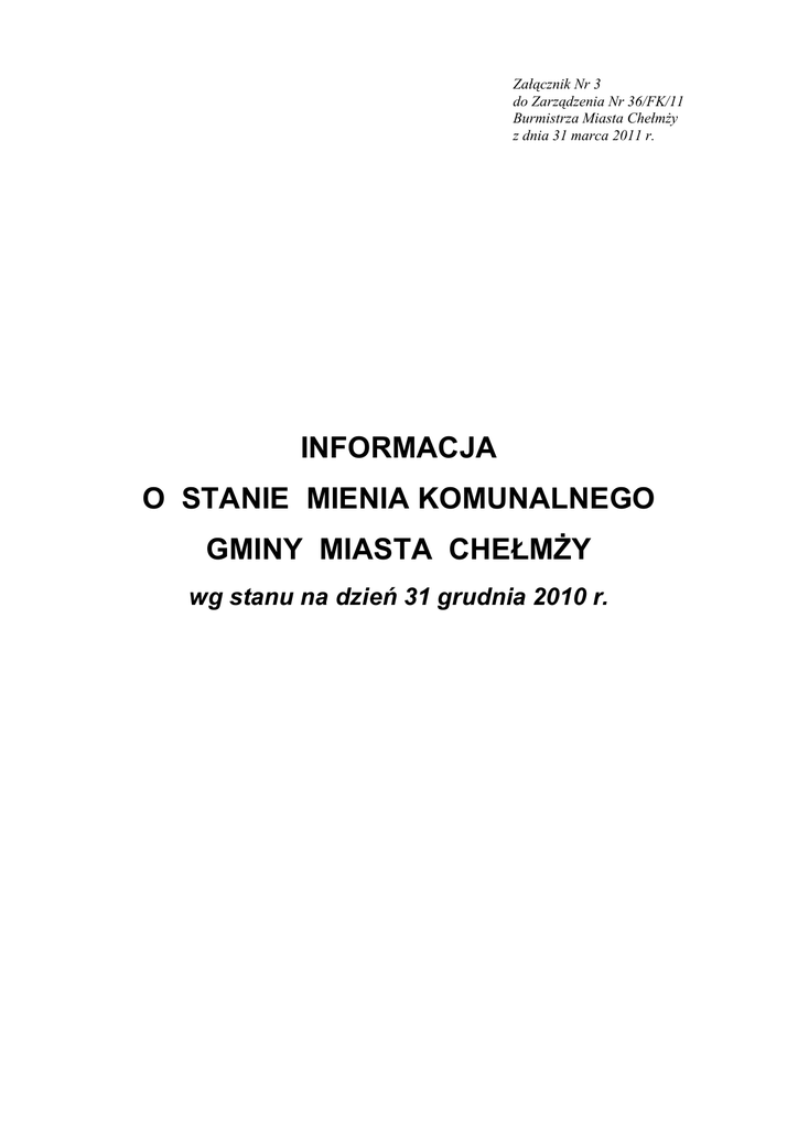 Załącznik Nr 3 do Zarządzenia Nr 36/FK/11 Burmistrza Miasta ChełmŜy z dnia 31 marca 2011 r. INFORMACJA O STANIE MIENIA KOMUNALNEGO GMINY MIASTA CHEŁMśY wg stanu na dzień 31 grudnia 2010 r. SPIS TREŚCI WSTĘP ROZDZIAŁ 1. Gospodarka gruntami ROZDZIAŁ 2. Budynki i budowle komunalne Budynki mieszkalne Obiekty i budynki komunalne ROZDZIAŁ 3. Charakterystyka infrastruktury komunalnej Sieć wodociągowa Odprowadzenie ścieków Sieć gazowa Drogi na terenie miasta Oświetlenie uliczne Zieleń miejska Cmentarz Gospodarka odpadami komunalnymi Melioracje szczegółowe ROZDZIAŁ 4. Finanse gminy Dochody Wierzytelności Zobowiązania Zestawienie Nr 1 - Informacja o zmianach w mieniu komunalnym w okresie od 30.09.2009 r. (data złoŜenia poprzedniej informacji) do 31.12.2010 r. Zestawienie Nr 2 - Grunty Tabela Nr 1 Informacja o zmianach w stanie mienia komunalnego miasta ChełmŜy – 31.12.2010 r. Tabela Nr 2 Wielkość udziałów/akcji posiadanych przez Miasto ChełmŜa w spółkach Tabela Nr 3 Zestawienie ilościowe majątku Miasta ChełmŜy Tabela Nr 4 Zmiany struktury uŜytków gruntów komunalnych Tabela Nr 5 Szczegółowa struktura gruntów komunalnych Tabela Nr 6 Mienie komunalne i jego zmiany w okresie od 30.09.2009r. do 31.12.2010r. Tabela Nr 7 Zestawienie mienia komunalnego według stanu na dzień 31 grudnia 2010 roku WSTĘP Ustawa z dnia 27 sierpnia 2009 r. o finansach publicznych wprowadziła obowiązek sporządzenia informacji o stanie mienia komunalnego wraz ze sprawozdaniem rocznym z wykonania budŜetu. Dotychczas informacja o stanie mienia komunalnego była załączana do projektu uchwały budŜetowej. Zgodnie z art. 267 ustawy z dnia 27 sierpnia 2009 r. o finansach publicznych, zarząd jednostki samorządu terytorialnego przedstawia, w terminie do dnia 31 marca roku następującego po roku budŜetowym, organowi stanowiącemu jednostki samorządu terytorialnego informację o stanie mienia jednostki samorządu terytorialnego, zawierającą: a) dane dotyczące przysługujących jednostce samorządu terytorialnego praw własności, b) dane dotyczące: − innych niŜ własność praw majątkowych, w tym w szczególności o ograniczonych prawach rzeczowych, uŜytkowaniu wieczystym, wierzytelnościach, udziałach w spółkach, akcjach, − posiadania, c) dane o zmianach w stanie mienia komunalnego, w zakresie określonym w lit. a i b, od dnia złoŜenia poprzedniej informacji, d) dane o dochodach uzyskanych z tytułu wykonywania prawa własności i innych praw majątkowych oraz z wykonywania posiadania, e) inne dane i informacje o zdarzeniach mających wpływ na stan mienia jednostki samorządu terytorialnego. Informacja o stanie mienia komunalnego została przestawiona w formie opisowej i tabelarycznej. Rozdział 1. Gospodarka gruntami – 31.12.2010 r. Gmina Miasto ChełmŜa zajmuje powierzchnię UŜytki rolne grunty orne sady 784 ha 358 ha 297 ha 8 ha łąki trwałe 26 ha pastwiska trwałe 11 ha grunty rolne zabudowane 12 ha grunty pod rowami Grunty leśne oraz zadrz. i zakrz. 4 ha 5 ha lasy i grunty leśne 1 ha grunty zadrzewione 4 ha Grunty zabudowane i zurbanizowane 239 ha mieszkaniowe 122 ha przemysłowe 54 ha inne zabudowane 29 ha zurbanizowane niezabudowane 19 ha rekreacyjno-wypoczynkowe 15 ha Tereny komunikacyjne 68 ha drogi 50 ha koleje 18 ha UŜytki kopalne brak Grunty pod wodami 96 ha grunty pod wodami powierzchniowo stojącymi 20 ha grunty pod wodami powierzchniowo płynącymi Tereny pozostałe tereny róŜne nieuŜytki 76 ha 18 ha 18 ha Rozdział 2. Budynki i obiekty komunalne 1. Budynki mieszkalne – Zasób gminnych budynków i lokali mieszkalnych na podstawie danych dostarczonych przez zarządcę, tj. ZGM Sp. z o.o. w ChełmŜy, stan na dzień 31.12.2010 r. Zasób budynków mieszkalnych gminy miasta ChełmŜy przedstawia się następująco: − 79 budynków wspólnot mieszkaniowych, w których procentowy udział posiada gmina; − 20 budynków ze 100 % udziałem gminy, jednakŜe niektóre z nich posiadają nieuregulowane stany prawne gruntu; − 16 budynków socjalnych; − 13 budynków prowadzonych jako tzw. przymusowe zarządy –prowadzenie cudzych spraw bez zlecenia, co daje łącznie 128 budynków. Lokale mieszkalne (w tym lokale w standardzie socjalnym) oraz lokale uŜytkowe, którymi zarządza ZGM Sp. z o.o. stanowią łącznie 940 sztuk, z czego 909 to lokale mieszkalne, zaś 31 to lokale uŜytkowe. Lokale mieszkalne w ilości 909 sztuk podzielić moŜna na: − 556 lokali mieszkalnych znajdują się w budynkach wspólnot mieszkaniowych; − 353 lokale mieszkalne i lokale socjalne znajdujące się w budynkach przekazanych w zarząd jako prowadzenie cudzych spraw bez zlecenia oraz posiadających nieuregulowany stan prawny gruntu (w tym 143 lokale mieszkalne usytuowane w budynkach będących w tzw. „przymusowym zarządzie”, 144 lokale znajdujące się w budynkach ze 100 % udziałem gminy i posiadających nieuregulowany stan prawny gruntu); − 66 lokali w budynkach w standardzie socjalnym. Zasób lokali uŜytkowych stanowiących własność Gminy Miasto ChełmŜa to 31 sztuk, z czego: − 20 lokali uŜytkowych znajduje się w budynkach wspólnot mieszkaniowych; − 9 lokali uŜytkowych znajduje się w nieruchomości niemieszkalnej (budynek przy ul. Bydgoskiej 7); − 2 lokale uŜytkowe znajdują się w budynku przekazanym w zarząd jako prowadzenie cudzych spraw bez zlecenia oraz posiadających nieuregulowany stan prawny gruntu (budynek przy ul. I. Paderewskiego 8) o łącznej powierzchni uŜytkowej 97,22 m2. 2. Budynki i budowle komunalne: − Kompleks Sportowy przy ul. 3-go Maja, − Basen przy ul. Bydgoskiej 7, − Boisko sportowe ORLIK, − Boisko sportowe METALOWIEC, − Hala widowiskowo – sportowa, − Place zabaw: „DANONKI”, „NETTO”, Park Miejski ul. 3-go Maja 14. Rozdział 3. Charakterystyka infrastruktury komunalnej 1. Sieć wodociągowa – Właścicielem sieci wodociągowej na terenie m. ChełmŜy jest Miasto ChełmŜa. Siecią z