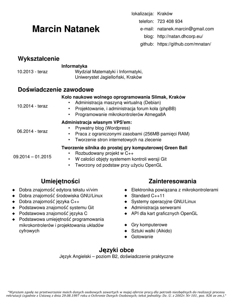 lokalizacja: Kraków telefon: 723 408 934 Marcin Natanek email: [email protected] blog: http://natan.dhcorp.eu/ github: https://github.com/mnatan/ Wykształcenie 10.2013 teraz Informatyka Wydział Matematyki i Informatyki, Uniwerystet Jagielloński, Kraków Doświadczenie zawodowe 10.2014 teraz Koło naukowe wolnego oprogramowania Slimak, Kraków • Administracja maszyną wirtualną (Debian) • Projektowanie, i administracja forum koła (phpBB) • Programowanie mikrokontrolerów Atmega8A 06.2014 teraz Administracja własnym VPS'em: • Prywatny blog (Wordpress) • Praca z ograniczonymi zasobami (256MB pamięci RAM) • Tworzenie stron internetowych na zlecenie 09.2014 – 01.2015 Tworzenie silnika do prostej gry komputerowej Green Ball • Rozbudowany projekt w C++ • W całości objęty systemem kontroli wersji Git • Tworzony od podstaw przy użyciu OpenGL Umiejętności Zainteresowania Dobra znajomość edytora tekstu vi/vim Dobra znajomość środowiska GNU/Linux Dobra znajomość języka C++ Podstawowa znajomość systemu Git Podstawowa znajomość języka C Podstawowa umiejętność programowania mikrokontrolerów i projektowania układów cyfrowych Elektronika powiązana z mikrokontrolerami Standard C++11 Systemy operacyjne GNU/Linux Administracja serwerami API dla kart graficznych OpenGL Gry komputerowe Sztuki walki (Aikido) Gotowanie Języki obce Język Angielski – poziom B2, doświadczenie praktyczne "Wyrażam zgodę na przetwarzanie moich danych osobowych zawartych w mojej ofercie pracy dla potrzeb niezbędnych do realizacji procesu rekrutacji (zgodnie z Ustawą z dnia 29.08.1997 roku o Ochronie Danych Osobowych; tekst jednolity: Dz. U. z 2002r. Nr 101, poz. 926 ze zm.)."