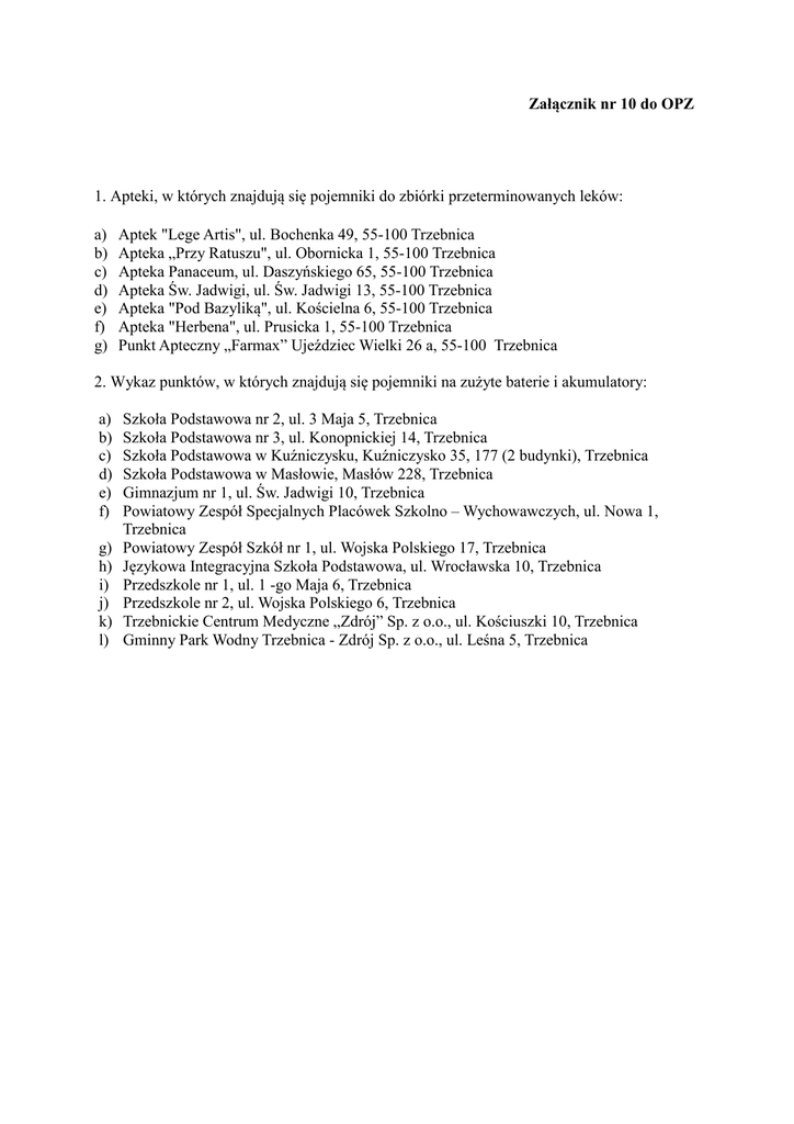 Załącznik nr 10 do OPZ 1. Apteki, w których znajdują się pojemniki do zbiórki przeterminowanych leków: a) b) c) d) e) f) g) Aptek "Lege Artis", ul. Bochenka 49, 55-100 Trzebnica Apteka „Przy Ratuszu", ul. Obornicka 1, 55-100 Trzebnica Apteka Panaceum, ul. Daszyńskiego 65, 55-100 Trzebnica Apteka Św. Jadwigi, ul. Św. Jadwigi 13, 55-100 Trzebnica Apteka "Pod Bazyliką", ul. Kościelna 6, 55-100 Trzebnica Apteka "Herbena", ul. Prusicka 1, 55-100 Trzebnica Punkt Apteczny „Farmax” Ujeździec Wielki 26 a, 55-100 Trzebnica 2. Wykaz punktów, w których znajdują się pojemniki na zużyte baterie i akumulatory: a) b) c) d) e) f) g) h) i) j) k) l) Szkoła Podstawowa nr 2, ul. 3 Maja 5, Trzebnica Szkoła Podstawowa nr 3, ul. Konopnickiej 14, Trzebnica Szkoła Podstawowa w Kuźniczysku, Kuźniczysko 35, 177 (2 budynki), Trzebnica Szkoła Podstawowa w Masłowie, Masłów 228, Trzebnica Gimnazjum nr 1, ul. Św. Jadwigi 10, Trzebnica Powiatowy Zespół Specjalnych Placówek Szkolno – Wychowawczych, ul. Nowa 1, Trzebnica Powiatowy Zespół Szkół nr 1, ul. Wojska Polskiego 17, Trzebnica Językowa Integracyjna Szkoła Podstawowa, ul. Wrocławska 10, Trzebnica Przedszkole nr 1, ul. 1 -go Maja 6, Trzebnica Przedszkole nr 2, ul. Wojska Polskiego 6, Trzebnica Trzebnickie Centrum Medyczne „Zdrój” Sp. z o.o., ul. Kościuszki 10, Trzebnica Gminny Park Wodny Trzebnica - Zdrój Sp. z o.o., ul. Leśna 5, Trzebnica