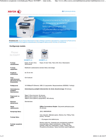 Nabiurkowe urządzenie wielofunkcyjne Phaser 3635MFP — dane techn... 1z5 http://www.office.xerox.com/multifunction-printer/multifunction-over-... Wydrukuj tę stronę Przeskocz do: Druk | Kopia | Skanowanie | Faks | Obsługa nośników | Zarządzanie urządzeniem | Rozliczanie | Bezpieczeństwo | Wymagania środowiskowe | Wymagania elektryczne | Wymiary | Certyfikacje Konfiguracje modelu 3635MFPV_S 3635MFPV_X Funkcje standardowe Kopia, E-mail, Druk, Skanowanie Funkcje opcjonalne Możliwość zastosowania serwera faksu sieciowego Prędkość drukowania do 33 str./min Czas wydrukowania pierwszej strony, drukowanie Od 9 sekund Podłączenie 10/100BaseTX Ethernet, USB 2.0 (opcjonalne: Bezprzewodowe (IEEE802.11a/b/g)) Automatyczny podajnik dokumentów Automatyczny podajnik dokumentów do druku dwustronnego: 60 arkuszy Pojemność na papier Wydruki dwustronne Kopia, E-mail, Faks, Faks LAN, Druk, Skanowanie Taca 1 (Taca boczna): 50 arkuszy Taca 2 (Taca papieru): 500 arkuszy Taca 3 (Taca papieru) (opcjonalne): 500 arkuszy Standardowo Opcje wykańczania Offline Convenience Stapler: Zszywanie jednopozycyjne, 20-arkuszy Kompresja faksu JBIG, MMR/MR/MH Funkcje faksu Auto reduction, Blokada spamu, Memory fax, Polling, Faks poufny, Toll save* * - Wymagana linia telefoniczna. Funkcje wysyłania faksu Monitor audio linii, Automatyczne zmniejszanie prędkości transmisji faksu, Batch transmission, Emisja, Strony tytułowe, Delay fax, Faksowanie z szyby, Ważny faks, Wysyłanie priorytetowe, Opcje transmisji (raport/nagłówek) 2010-11-26 10:57 Nabiurkowe urządzenie wielofunkcyjne Phaser 3635MFP — dane techn... 2z5 Automatyczne opóźnienie faksu, Przekazywanie faksu na e-mail, Dopasowanie do strony, Zapobieganie niechcianym faksom, Drukowanie jedno- lub dwustronne, Bezpieczne odbieranie Funkcje odbioru Speed dials (one line) Funkcje zwiększające produktywność http://www.office.xerox.com/multifunction-printer/multifunction-over-... N/A Do 199 Automatyczne wybieranie tac, Automatyczne przełączanie tac, Kopiowanie książek, Układanie, Kolorowe skanowanie, Raportowanie eksploatacji materiałów eksploatacyjnych, Okładki, Formaty użytkownika, Zapisane ustawienia sterownika, Komunikaty statusu drukarki, Dopasowanie do strony, Przerwanie pracy, Kolejka prac, Wybór tacy wyjściowej, Wielozadaniowe przetwarzanie na mapę bitową podczas drukowania, Zestaw próbkowy, Druk zachowany, Wskaźnik eksploatacji tonerów, Przekładki folii, Znaki wodne Zalecany miesięczny nakład Do 10 000 stron Maksymalne dopuszczalne obciążenie Do 75 000 stron miesięcznie Gwarancja 1 rok w miejscu instalacji Druk Maksymalna rozdzielczość wydruku 600 x 600 dpi (rozdzielczość interpolowana 1200 x 1200) Pamięć urządzenia (standardowa/ maksymalna) 256 MB / 512 MB Twardy dysk Standardowo 80 GB Procesor 360 MHz Obsługa systemów operacyjnych AIX 5, HP UX® 11, HP UX® 11i, Solaris 10, Solaris 9, Windows® 2003 Server, Windows® Vista, Windows® XP, Windows® XP Pro Protokoły sieciowe FTP, HTTP, HTTPs, LPR, SNMP w wersji 1, SNMP w wersji 2, SNMP w wersji 3, TCP/IP, UDP Języki opisu strony (PDL) PCL® 5e emulacja, PCL® 6 emulacja, PostScript® 3™ support Czcionki PCL® 45 PostScript® fonts 136 Funkcje drukowania Arkusz wzorcowy, Drukowanie broszur, Opóźnione drukowanie, Obrót obrazu, N-stron, Nakładki, Print from USB Tryby jakości drukowania Standardowo, Tryb oszczędzania toneru ^ POWRÓT NA POCZĄTEK Kopia Czas wydrukowania pierwszej strony, kopiowanie Od 9 sekund Maksymalna rozdzielczość kopii 600 x 600 dpi Funkcje kopiowania Automatyczne zmniejszanie/powiększanie, Tworzenie broszury, Booklet creation (requires two-sided output), Kolorowy interfejs ekranu dotykowego, Usuwanie brzegu, Kopiowanie dowodów osobistych, Przesunięcie obrazu, Margin shift, N-stron, Zmniejszanie / Powiększanie, Jedno skanowanie wiele wydruków, Interfejs ekranu dotykowego 2010-11-26 10:57 Nabiurkowe urządzenie wielofunkcyjne Phaser 3635MFP — dane techn... 3z5 Wiele kopii 1 do 999 Zmniejszenie/powiększenie z tacy dokumentów 25 - 400 % Kroki zmniejszenia/powiększenia 1% http://www.office.xerox.com/multifunction-printer/multifunction-over-... ^ POWRÓT NA POCZĄTEK Skanowanie Docelowe miejsca skanowania Skanowanie sieciowe, Skanowanie do USB, Skanowanie do poczty e-mail Kolorowe skanowanie Tak Prędkość skanowania Kolor: do 22 str./min Czerń: do 33 str./min Ustawienia rozdzielczości skanowania 100 x 100, 200 x 200, 300 x 300, 400 x 400, 600 x 600 dpi, 72 x 72 Głębia bitowa 36 bit Formaty plików skanowania JPEG, PDF, TIFF, wielostronicowy TIFF Sterowniki skanowania TWAIN, WIA Oprogramowanie do skanowania Xerox Scan to PC Desktop® Personal Edition SE Protokoły e-mail Kodowanie MIME, SMTP Uwierzytelnianie wiadomości e-mail Logowanie gości za pomocą PIN, SMB (Windows NT 4.0/Windows 2000/Windows Server 2003), Logowanie do urządzenia za pomocą nazwy i hasła użytkownika sieci, Obsługuje Kerberos (Windows 2000/UNIX/Windows Server 2003) Funkcje e-mail Możliwość wyszukiwania adresu (wewnętrzna lub publiczna książka adresowa), Lista adresów firmy przez LDAPv3, Logowanie do urządzenia za pomocą nazwy i hasła użytkownika sieci, Dostęp urządzenia do sieci i uwierzytelnianie, Bezpośrednie wysyłanie wiadomości e-mail z urządzenia, Pozycje adresów katalogu (Exchange/Notes/LDAP), Pobrana lista adresów (format pliku z rozdzielaniem przecinkami), Opcje arkusza potwierdzenia wiadomości e-mail CWIS, Treść wiadomości e-mail (konfigurowana przez użytkownika), Podpisy wiadomości e-mail, Tryb dostępu gościa, Dostęp i uwierzytelnianie lokalnego użytkownika, Ręczne wprowadzanie adresu, Wyszukiwanie adresu wprowadzonego ręcznie lub z katalogu Exchange/Notes/LDAP, Wyszukiwanie listy adresów sieciowych przez LDAP, Logowanie gości za pomocą PIN, Skanowanie do wiadomości e-mail z obsługą LDAP, Skanowanie do wiadomości e-mail z powiadomieniem o dostarczeniu poczty, Skanowanie do adresów SMTP ^ POW