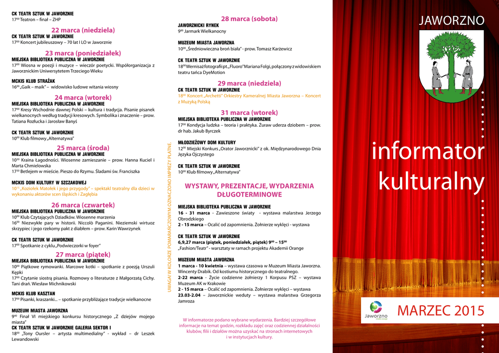 CK Teatr Sztuk w Jaworznie 1700 Teatron – finał – ZHP 28 marca (sobota) jaworznicki Rynek 900 Jarmark Wielkanocny 22 marca (niedziela) CK Teatr Sztuk w Jaworznie 1700 Koncert jubileuszowy – 70 lat I LO w Jaworznie Muzeum Miasta Jaworzna 1000 „Średniowieczna broń biała” - prow. Tomasz Karżewicz 23 marca (poniedziałek) Miejska Biblioteka Publiczna w Jaworznie 1700 Wiosna w poezji i muzyce – wieczór poetycki. Współorganizacja z Jaworznickim Uniwersytetem Trzeciego Wieku CK Teatr Sztuk w Jaworznie 1800 Wernisaż fotografii pt.„Fluoro”Mariana Folgi, połączony z widowiskiem teatru tańca DyeMotion MCKiS Klub Strażak 1600 „Gaik – maik” – widowisko ludowe witania wiosny 29 marca (niedziela) CK Teatr Sztuk w Jaworznie 1800 Koncert „Archetti” Orkiestry Kameralnej Miasta Jaworzna – Koncert z Muzyką Polską 24 marca (wtorek) Miejska Biblioteka Publiczna w Jaworznie 1700 Kresy Wschodnie dawnej Polski – kultura i tradycja. Pisanie pisanek wielkanocnych według tradycji kresowych. Symbolika i znaczenie – prow. Tatiana Rozłucka i Jarosław Banyś 31 marca (wtorek) Miejska Biblioteka Publiczna w Jaworznie 1700 Kondycja ludzka – teoria i praktyka. Żuraw uderza dziobem – prow. dr hab. Jakub Byrczek Miejska Biblioteka Publiczna w Jaworznie 1030 Kraina Łagodności. Wiosenne zamieszanie – prow. Hanna Kuciel i Marta Chmielowska 1730 Betlejem w mieście. Pieszo do Rzymu. Śladami św. Franciszka MCKiS Dom Kultury w Szczakowej 1015 „Koziołek Matołek i jego przygody” – spektakl teatralny dla dzieci w wykonaniu aktorów scen śląskich i Zagłębia 26 marca (czwartek) Miejska Biblioteka Publiczna w Jaworznie 1000 Klub Czytających Dziadków. Wiosenne marzenia 1600 Niezwykłe pary w historii. Niccolò Paganini. Nieziemski wirtuoz skrzypiec i jego rzekomy pakt z diabłem – prow. Karin Wawrzynek CK Teatr Sztuk w Jaworznie 1700 Spotkanie z cyklu „Podwieczorki w foyer” 27 marca (piątek) Miejska Biblioteka Publiczna w Jaworznie 1000 Piątkowe rymowanki. Marcowe kotki – spotkanie z poezją Urszuli Kępki 1700 Czytanie siostrą pisania. Rozmowy o literaturze z Małgorzatą Cichy. Tani drań. Wiesław Michnikowski MCKiS Klub Kasztan 1700 Pisanki, kraszanki... – spotkanie przybliżające tradycje wielkanocne Muzeum Miasta Jaworzna 940 Finał VI miejskiego konkursu historycznego „Z dziejów mojego miasta” CK Teatr Sztuk w Jaworznie Galeria Sektor I 1800 „Tony Oursler – artysta multimedialny” - wykład – dr Leszek Lewandowski UWAGA! W kolorze pomarańczowym oznaczono imprezy PŁATNE. CK Teatr Sztuk w Jaworznie 1000 Klub filmowy „Alternatywa” 25 marca (środa) JAWORZNO Młodzieżowy Dom Kultury 1200 Miejski Konkurs „Orator Jaworznicki” z ok. Międzynarodowego Dnia Języka Ojczystego CK Teatr Sztuk w Jaworznie 1000 Klub filmowy „Alternatywa” Wystawy, prezentacje, wydarzenia długoterminowe informator kulturalny Miejska Biblioteka Publiczna w Jaworznie 16 - 31 marca - Zawieszone światy - wystawa malarstwa Jerzego Obrodzkiego 2 - 15 marca – Ocalić od zapomnienia. Żołnierze wyklęci - wystawa CK Teatr Sztuk w Jaworznie 6,9,27 marca (piątek, poniedziałek, piątek) 900 – 1500 „Fashion/Teatr” - warsztaty w ramach projektu Akademii Orange Muzeum Miasta Jaworzna 1 marca - 10 kwietnia – wystawa czasowa w Muzeum Miasta Jaworzna. Wincenty Drabik. Od kostiumu historycznego do teatralnego. 2-22 marca - Życie codzienne żołnierzy 1 Korpusu PSZ – wystawa Muzeum AK w Krakowie 2 - 15 marca – Ocalić od zapomnienia. Żołnierze wyklęci – wystawa 23.03-2.04 – Jaworznickie weduty – wystawa malarstwa Grzegorza Jamroza W informatorze podano wybrane wydarzenia. Bardziej szczegółowe informacje na temat godzin, rozkładu zajęć oraz codziennej działalności klubów, filii i działów można uzyskać na stronach internetowych i w instytucjach kultury. MARZEC 2015 3 marca (wtorek) 12 marca (czwartek) Miejska Biblioteka Publiczna w Jaworznie 1000 Klub Książki. „Zmotywowani do czytania. Motyw władzy w literaturze” - prow. Anna Sobula 1700 Klub Teatralny – Kolacja na cztery ręce - prow. Anna PtaszkiewiczGodzina Miejska Biblioteka Publiczna w Jaworznie 1700 Czwartki z historią. Gawędy o Jaworznie Marii Leś-Runickiej. Towarzystwo Gimnastyczne Sokół 1600 Bobas w Bibliotece. Co ma wpływ na rozwój mowy małego dziecka? Stymulacja – prelekcja logopedy Moniki Michael CK Teatr Sztuk w Jaworznie 1000 Klub filmowy „Alternatywa” Muzeum Miasta Jaworzna 1000 I etap VI miejskiego konkursu historycznego„Z dziejów mojego miasta” 5 marca (czwartek) Miejska Biblioteka Publiczna w Jaworznie 1000 Żołnierze wyklęci - wykład dr Kornelii Banaś z IPN Katowice 1645 Klub Filmowy. Historie prawdziwe – prow. Joanna Gatermajer 6 marca (piątek) MCKiS Klub Kasztan 1800 Pasjonaci – kobiety z pasją. Babski wieczorek przy okazji MCKiS Klub Podłęże 1000 Mini Playback Show – konkurs muzyczny Młodzieżowy Dom Kultury 900 Konkurs recytatorski dla gimnazjów „Mały ogólnopolski konkurs recytatorski”. Etap miejski CK Teatr Sztuk w Jaworznie Galeria Sektor I 1800 „Sztuka video w Polsce” - wykład – dr Leszek Lewandowski 7 marca (sobota) Muzeum Miasta Jaworzna 1000 Zwiedzanie muzeum z przewodnikiem. Przygotowanie do VI miejskiego konkursu historycznego „Z dziejów mojego miasta” - prow. Adrian Rams 8 marca (niedziela) CK Teatr Sztuk w Jaworznie 1800 „Świst ostateczny” - spektakl w reż. Ewy Sałużanki 9 marca (poniedziałek) CK Teatr Sztuk w Jaworznie 1300 „Fashion/Teatr” - otwarte spotkania z projektantami ubioru część II spotkanie z Michałem Wójciakiem 10 marca (wtorek) MCKiS Hala Widowiskowo-Sportowa 1800 „Wieczór z Kulturą” - operetka Franza Lehara pt.„Wesoła Wdówka” w wykonaniu Gliwickiego Teatru Muzycznego z Grażyną Brodzińską w roli głównej CK Teatr Sztuk w Jaworznie 1000 Klub filmowy „Alternatywa” 11 marca (środa) Miejska Biblioteka Publiczna w Jaworznie 1700 Rozba