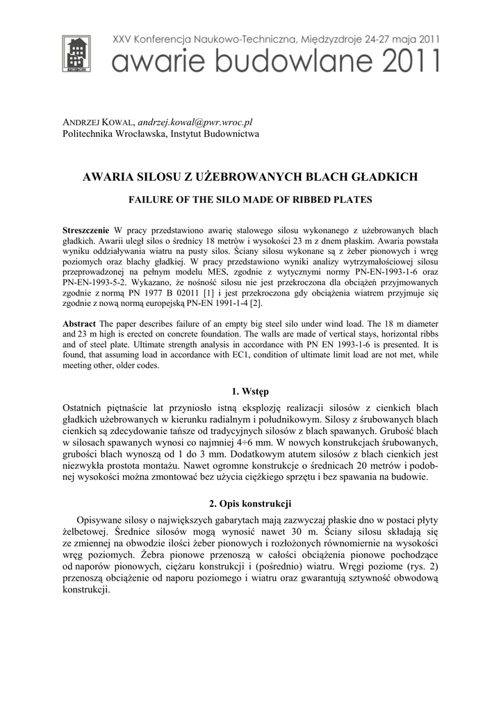 ANDRZEJ KOWAL, [email protected] Politechnika Wrocławska, Instytut Budownictwa AWARIA SILOSU Z UśEBROWANYCH BLACH GŁADKICH FAILURE OF THE SILO MADE OF RIBBED PLATES Streszczenie W pracy przedstawiono awarię stalowego silosu wykonanego z uŜebrowanych blach gładkich. Awarii uległ silos o średnicy 18 metrów i wysokości 23 m z dnem płaskim. Awaria powstała wyniku oddziaływania wiatru na pusty silos. Ściany silosu wykonane są z Ŝeber pionowych i wręg poziomych oraz blachy gładkiej. W pracy przedstawiono wyniki analizy wytrzymałościowej silosu przeprowadzonej na pełnym modelu MES, zgodnie z wytycznymi normy PN-EN-1993-1-6 oraz PN-EN-1993-5-2. Wykazano, Ŝe nośność silosu nie jest przekroczona dla obciąŜeń przyjmowanych zgodnie z normą PN 1977 B 02011 [1] i jest przekroczona gdy obciąŜenia wiatrem przyjmuje się zgodnie z nową normą europejską PN-EN 1991-1-4 [2]. Abstract The paper describes failure of an empty big steel silo under wind load. The 18 m diameter and 23 m high is erected on concrete foundation. The walls are made of vertical stays, horizontal ribbs and of steel plate. Ultimate strength analysis in accordance with PN EN 1993-1-6 is presented. It is found, that assuming load in accordance with EC1, condition of ultimate limit load are not met, while meeting other, older codes. 1. Wstęp Ostatnich piętnaście lat przyniosło istną eksplozję realizacji silosów z cienkich blach gładkich uŜebrowanych w kierunku radialnym i południkowym. Silosy z śrubowanych blach cienkich są zdecydowanie tańsze od tradycyjnych silosów z blach spawanych. Grubość blach w silosach spawanych wynosi co najmniej 4÷6 mm. W nowych konstrukcjach śrubowanych, grubości blach wynoszą od 1 do 3 mm. Dodatkowym atutem silosów z blach cienkich jest niezwykła prostota montaŜu. Nawet ogromne konstrukcje o średnicach 20 metrów i podobnej wysokości moŜna zmontować bez uŜycia cięŜkiego sprzętu i bez spawania na budowie. 2. Opis konstrukcji Opisywane silosy o największych gabarytach mają zazwyczaj płaskie dno w postaci płyty Ŝelbetowej. Średnice silosów mogą wynosić nawet 30 m. Ściany silosu składają się ze zmiennej na obwodzie ilości Ŝeber pionowych i rozłoŜonych równomiernie na wysokości wręg poziomych. śebra pionowe przenoszą w całości obciąŜenia pionowe pochodzące od naporów pionowych, cięŜaru konstrukcji i (pośrednio) wiatru. Wręgi poziome (rys. 2) przenoszą obciąŜenie od naporu poziomego i wiatru oraz gwarantują sztywność obwodową konstrukcji. 578 Kowal A.: Awaria silosu z uŜebrowanych blach gładkich Rys. 1. Schemat konstrukcji silosu z uŜebrowanych blach gładkich (model obliczeniowy) Rys. 2. Wręga pozioma, grubość blachy 1 mm śebra pionowe umieszczone są w górnej części silosu z jednej strony blachy, a w dolnej części silosu z dwóch stron. Zastosowanie Ŝeber z dwóch stron pozwala na uciąglenie Ŝeber oraz na zwiększenie ich nośności. Rozstaw Ŝeber uzaleŜniony jest od wielkości obciąŜenia pionowego. Jak pokazano na rys. 1, Ŝebra są gęściej rozmieszczone na dole i znacznie rzadziej idąc ku górze. Wręgi poziome rozmieszczone są równomiernie co około 125 cm, Diagnostyka w ocenie bezpieczeństwa konstrukcji 579 zaleŜnie od stosowanych arkuszy blach. Wręgi poziome wykonane są zazwyczaj z profilu kapeluszowego (rys. 2). śebra pionowe i wręgi poziome wykonane są z profili giętych z blachy o grubości 1÷2 mm. Ostatni element nośny to blacha gładka, śrubowana do Ŝeber. Blacha ma grubość zmienną na wysokości, największa grubość blachy występuje na dole i zazwyczaj nie przekracza 3 mm, u góry grubość blachy wynosi 1÷1.5 mm. Konstrukcja dachu wykonana jest równieŜ z uŜebrowanych paneli blaszanych. Przy duŜych rozpiętościach stosowane są podpory z dźwigarów kratowych. W wypadku analizowanego silosu o średnicy 18 m zastosowano dodatkowe zastrzały jak pokazano na rys. 3. Rys. 3. Widok konstrukcji silosu (model obliczeniowy) od wewnątrz 4. ObciąŜenie wiatrem Zgodnie z normą PNB/77 02011 [1], jeszcze przed wprowadzeniem poprawki z roku 2009, maksymalne parcie charakterystyczne na górze silosu wyniesie, w drugiej strefie klimatycznej: pk = qk × β × Ce × C x − 0,35 ×1,8 × 1×1.2451 = 0,79 KPa (1) Norma [1] jest na tyle dobrze znana, Ŝe nie opisuje się w szczegółach powyŜszych symboli. Parcie obliczeniowe na górnej krawędzi silosu wynosi: 0.79×1.3 = 1.02 kPa. ObciąŜenie wiatrem przyjmowane wg normy Eurokod EC1 [2] w duŜym stopniu zaleŜy od kategorii terenu. W przypadku otwartych terenów wiejskich naleŜy przyjmować kategorię terenu II. Charakterystyczne największe ciśnienie prędkości wiatru, przy przyjęciu II-giej kategorii terenu, na wysokości 23 m wyniesie: 0.42×2.95 = 1.24 kPa. Jak widać wartość charakterystyczna maksymalnego parcia, ustalona wg EC 1 [2] przewyŜsza o 58% wartość obciąŜenia ustaloną wg normy z roku 1977 [1]. RóŜnica wartości obliczeniowych jest jeszcze większa i wynosi aŜ 84%. ZauwaŜmy, Ŝe norma obciąŜeń wiatrem z roku 1977 obowiązywała aŜ do roku 2009. 580 Kowal A.: Awaria silosu z uŜebrowanych blach gładkich Rys. 4. ObciąŜenie silosu wiatrem – widok Rys. 5. ObciąŜenie silosu wiatrem – przekrój w górnej części Diagnostyka w ocenie bezpieczeństwa konstrukcji 581 5. Opis awarii Silos o przedstawionej powyŜej konstrukcji uległ awarii w czasie wyjątkowo silnej wichury. Wręgi poziome uległy załamaniu niemal na całej wysokości silosu. Największe poziome odkształcenia silosu występują w górnej części na wysokości od czwartej do szóstej wręgi. Fot. 1. Uszkodzona górna część silosu 6. Analiza nośności Przeprowadzono analizę nośności przedstawionej konstrukcji przy wykorzystaniu metody elementów skończonych (program Sofistik) i procedury obliczeniowej opisanej w normie PN EN 1993-1-6. Poszycie oraz wręgi poziome modelowano elementami powłokowymi. Elementy pio