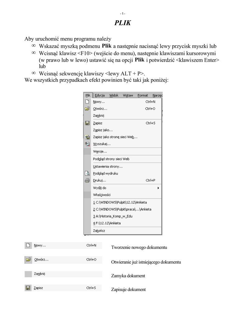 -1- PLIK Aby uruchomić menu programu należy • Wskazać myszką podmenu Plik a następnie nacisnąć lewy przycisk myszki lub • Wcisnąć klawisz <F10> (wejście do menu), następnie klawiszami kursorowymi (w prawo lub w lewo) ustawić się na opcji Plik i potwierdzić <klawiszem Enter> lub • Wcisnąć sekwencję klawiszy <lewy ALT + P>. We wszystkich przypadkach efekt powinien być taki jak poniżej: Tworzenie nowego dokumentu Otwieranie już istniejącego dokumentu Zamyka dokument Zapisuje dokument -2- Zapisuje dokument a jednocześnie umożliwia jego konwertowanie. Po naciśnięciu pojawia się okno zapisywania: Dostępne formaty zapisywania: • WordPerfect 6.x - konwertuje dokumenty programów WordPerfect 6.0 dla DOS oraz WordPerfect 6.0 i 6.1 dla Windows. • WordPerfect 5.x - konwertuje dokumenty programów WordPerfect 5.0 i 5.1 dla DOS oraz WordPerfect 5.1 i 5.2 dla Windows. • Tekst MS-DOS z układem - zachowuje podziały wierszy. Wstawia spacje do konwertowanego dokumentu, tak aby odwzorować w przybliżony sposób wcięcia, tabele, odstępy między wierszami, odstępy między akapitami i tabulatory. Konwertuje podziały sekcji i podziały stron na znaczniki akapitów. Format ten należy stosować do konwertowania dokumentu na format pliku tekstowego, w którym ma być zachowany wygląd strony. • Microsoft Excel - umożliwia otwieranie plików programu Excel w programie Word. • Word 97-2002 i 6.0/95 - RTF - zapisuje dokumenty w formacie Rich Text Format (RTF) z rozszerzeniem .doc. • Word 6.0/95 - eksport - zapisuje dokumenty w formacie programu Word 6.0/95 jako pliki binarne z rozszerzeniem .doc. • Word dla komputera Macintosh 4.0-5.1 - konwertuje dokumenty na dokumenty w formacie Word 4.x i 5.x dla komputerów Macintosh . Do otwierania dokumentów w tych formatach w programie Word 2002 konwerter nie jest wymagany. • Word 2.x dla Windows - zapisuje dokumenty w formacie wersji 2.x. Do otwierania dokumentów programu Word w wersji 2.x konwerter nie jest wymagany. • Microsoft Works 4.0 dla systemu Windows - otwiera i zapisuje pliki w formacie programu Works 4.0. • Microsoft Works 2000 dla systemu Windows - otwiera i zapisuje pliki w formacie programu Works 2000. • Odzyskiwanie tekstu - służy do odzyskiwania tekstu z dowolnego pliku w przypadku otwierania uszkodzonych dokumentów. • Lotus 1-2-3 - otwiera dokumenty wersji 2.x, 3.x i 4.0. -3- • • • • Strona sieci Web - otwiera lub zapisuje dokumenty w formacie HTML. Zachowuje właściwości dokumentu programu Word, dzięki czemu przy ponownym zapisywaniu dokumentów w formacie HTML w formacie dokumentu programu Word zostają zachowane cechy specyficzne dla programu Word. Strona sieci Web, przefiltrowana - zapisuje dokumenty w formacie HTML. Ten konwerter usuwa kodowanie HTML specyficzne dla programu Word. Archiwum sieci Web - zapisuje wszystkie elementy witryny sieci Web, łącznie z tekstem i grafiką, w jednym pliku. Word 5.0 dla Windows - zapisuje dokumenty w formacie wersji 5.x. Do otwierania dokumentów programu Word w wersji 5.x konwerter nie jest wymagany. Zapisuje dokument jako stronę sieci Web (Dla ułatwienia program Word oferuje kilka metod pomagających przy tworzeniu strony sieci Web. Można użyć Kreatora stron sieci Web, szablonu strony sieci Web lub można zapisać dokument programu Word jako stronę sieci Web) Naciśnięcie tego klawisza powoduje pojawienie się okienka wyszukiwania: -4- W polu Wyszukaj tekst można wprowadzić dowolną liczbę wyrazów. Wyszukiwanie podstawowe zwraca pliki zawierające w treści, słowach kluczowych lub w innych właściwościach wyrazy określone przez użytkownika. Wprowadzenie większej liczby wyrazów w polu Wyszukaj tekst sprawia, że wyszukiwanie jest bardziej precyzyjne, a lista znalezionych dokumentów krótsza. Wyszukiwanie podstawowe znajduje pliki zawierające różne odmiany wyrazów wprowadzonych w polu Wyszukaj tekst. Na przykład wprowadzenie tekstu „swim” wystarczy, aby odnaleźć dokumenty zawierające wyrazy „swim”, „swimming”, lub „swam”. Uwaga!!! Wyszukiwanie podstawowe uwzględnia odmianę wyrazów wyłącznie podczas szukania dokumentów w języku angielskim, francuskim, hiszpańskim, niemieckim, holenderskim, włoskim i szwedzkim. Stosując wyszukiwanie podstawowe, można skorzystać z symboli wieloznacznych: • Znak gwiazdki „*” reprezentuje grupę składającą się z dowolnej liczby znaków. Na przykład po wprowadzeniu tekstu „pr*e” zostaną znalezione dokumenty zawierające wyrazy „pranie”, „produkuje” oraz „proste”. • Znak zapytania „?” reprezentuje dowolny, pojedynczy znak. Na przykład po wprowadzeniu tekstu „wie?y” zostaną znalezione dokumenty zawierające wyrazy „wieży” i „wiemy”, ale nie będzie wśród nich dokumentów z wyrazem „wierzy”. Podczas przeszukiwania skrzynki pocztowej programu Microsoft Outlook można w szukanym tekście wykorzystać język naturalny. Wyszukiwanie z użyciem języka naturalnego polega na formułowaniu wyszukiwania za pomocą potocznych wyrażeń, na przykład „Find all messages sent yesterday”. Korzystając z wyszukiwania z użyciem języka naturalnego, można znajdować wiadomości e-mail, elementy kalendarza, kontakty, zadania, pozycje dziennika oraz notatki. Wyszukiwanie z użyciem języka naturalnego jest obsługiwane tylko w angielskich wersjach pakietu Microsoft Office XP. Przed rozpoczęciem wyszukiwania należy określić przynajmniej jedno miejsce wyszukiwania w polu Wyszukaj w. Jeżeli dokładnie znany jest folder, który trzeba przeszukać, to można wpisać go bezpośrednio. Chcąc przeszukać wiele folderów lub miejsc sieciowych, należy wybrać pozycję z listy Wyszukaj w, aby określić miejsce wyszukiwania: • Mój komputer Zawiera wszystkie dyski i foldery używanego komputera. • Moje miejsca sieciowe (Foldery sieci Web w systemach Microsoft Windows 98 i Windows NT 4.0) Zawiera wszystkie miejsca si