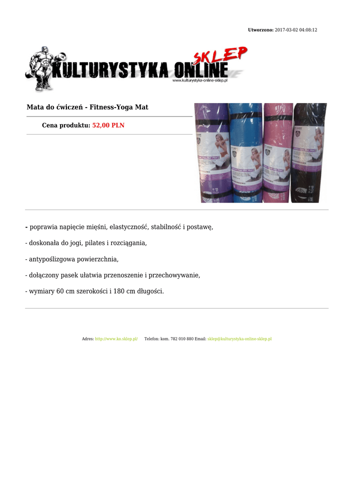 Utworzono: 2017-03-02 04:08:12 Mata do ćwiczeń - Fitness-Yoga Mat Cena produktu: 52,00 PLN - poprawia napięcie mięśni, elastyczność, stabilność i postawę, - doskonała do jogi, pilates i rozciągania, - antypoślizgowa powierzchnia, - dołączony pasek ułatwia przenoszenie i przechowywanie, - wymiary 60 cm szerokości i 180 cm długości. Adres: http://www.ko.sklep.pl/ Telefon: kom. 782 010 880 Email: [email protected]