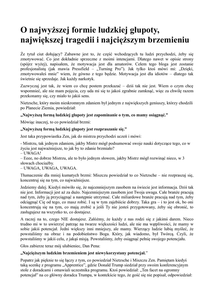O najwyższej formie ludzkiej głupoty, największej tragedii i najcięższym brzemieniu Że tytuł ciut dołujący? Zabawne jest to, że część wchodzących tu ludzi przychodzi, żeby się zmotywować. Co jest dokładnie sprzeczne z moimi intencjami. Dlatego nawet w opisie strony (spójrz wyżej), napisałem, że motywacja jest dla amatorów. Celem tego bloga jest zostanie profesjonalistą (jak mawia Pressfield – „Turning Pro”). Jak tylko ktoś mówi mi: „Dzięki, zmotywowałeś mnie” wiem, że gówno z tego będzie. Motywacja jest dla idiotów – dlatego tak świetnie się sprzedaje. Jak każdy narkotyk. Zazwyczaj jest tak, że wiem co chcę postem przekazać – dziś tak nie jest. Wiem o czym chcę wspomnieć, ale nie mam pojęcia, czy uda mi się to jakoś zgrabnie zamknąć, więc za chwilę razem przekonamy się, czy miało to jakiś sens. Nietzsche, który moim nieskromnym zdaniem był jednym z największych geniuszy, którzy chodzili po Planecie Ziemia, powiedział: „Najwyższą formą ludzkiej głupoty jest zapominanie o tym, co mamy osiągnąć.” Mówiąc inaczej, to co powiedział brzmi: „Najwyższą formą ludzkiej głupoty jest rozpraszanie się.” Jest taka przypowiastka Zen, jak do mistrza przychodzi uczeń i mówi: - Mistrzu, tak jednym zdaniem, jakby Mistrz mógł podsumować swoje nauki dotyczące tego, co w życiu jest najważniejsze, to jak by to zdanie brzmiało? – UWAGA! – Eeee, no dobrze Mistrzu, ale to było jednym słowem, jakby Mistrz mógł rozwinąć nieco, w 3 słowach chociażby. – UWAGA, UWAGA, UWAGA. Tłumaczenie dla mniej kumatych brzmi: Miszczu powiedział to co Nietzsche – nie rozpraszaj się, koncentruj się na tym, co najważniejsze. Jedziemy dalej. Kiedyś mówiło się, że najcenniejszym zasobem na świecie jest informacja. Dziś tak nie jest. Informacji jest aż za dużo. Najcenniejszym zasobem jest Twoja uwaga. Całe branże pracują nad tym, żeby ją przyciągnąć a następnie utrzymać. Całe miliardowe branże pracują nad tym, żeby odciągnąć Cię od tego, co masz robić. I są w tym zajebiście dobrzy. Taka gra – i to jest ok, bo oni koncentrują się na tym, co mają zrobić a jeśli Ty nie jesteś przygotowany, żeby się obronić, to zasługujesz na wszystko to, co dostajesz. A raczej na to, czego NIE dostajesz. Załóżmy, że każdy z nas rodzi się z jakimś darem. Nieco trudno mi w to uwierzyć patrząc na twarze większości ludzi, ale nie ma wątpliwości, że mamy w sobie jakiś potencjał. Jedni większy inni mniejszy, ale mamy. Wierzący ludzie lubią myśleć, że powstaliśmy na obraz i na podobieństwo Boga. Który, jak wiadomo, był Twórcą. Czyli, że powstaliśmy w jakiś celu, z jakąś misją. Powstaliśmy, żeby osiągnąć pełnię swojego potencjału. Głos zabierze teraz mój ulubieniec, Dan Pena: „Najcięższym ludzkim brzemieniem jest niewykorzystany potencjał.” Popatrz jak pięknie to się łączy z tym, co powiedział Nietzsche i Miszczu Zen. Pamiętam kiedyś taką scenkę z programu „Apprentice”, gdzie Donald Trump siedział przy swoim konferencyjnym stole z doradcami i omawiali uczestnika programu. Ktoś powiedział: „Ten facet na ogromny potencjał” na co główny doradca Trumpa, w kontekście tego, że gość się nie popisał, odpowiedział: „Tym większym czyni go to frajerem”. Jesteśmy zajebiście kreatywni w mordowaniu swojego potencjału. Wóda, dragi, dziwki, toksyczne związki, ciągłe dramaty po to, żeby związać naszą uwagę w debilny sposób i odciągnąć się od myślenia o tym, co mamy zrobić. Strach, lęk, wątpliwości, awersja do ryzyka, bycie słabą pizdą, neurozy, wymówki. Popatrz na tych wszystkich artystów, którzy leżą w piachu, chociaż odnieśli sukces. Popatrz na tych wszystkich artystów, którzy właśnie pracują nad trafieniem do piachu robiąc wszystko, żeby nie odnieść sukcesu. Spójrz sobie na tych wszystkich ludzi, którzy oglądają „reality show” czy „talent show”, żyją życiem innych na Pudlach albo są kowbojami klawiatury, komentując wszystko co nie ma absolutnie żadnego wpływu na ich życie. Bardzo to twórcze i bardzo kreatywne. Ubrane i gadające małpy, rzucające się na kolejny błyszczący obiekt. Co prowadzi nas do trzeciego cytatu. Tym razem Saul Alinsky: „Największą ludzką tragedią jest śmierć wiary w siebie.” Mechanizm wygląda tak: brak wiary w siebie > rozpraszanie się > niewykorzystany potencjał > brak wiary w siebie > bla bla bla. A może tak: rozpraszanie się > niewykorzystany potencjał > brak wiary w siebie > rozpraszanie się > bla bla. Nie ma większego znaczenia co jest tu punktem wejścia, dużo ważniejsze, że te zdarzenia następują po sobie. U podstaw tego wszystkiego leży oczywiście strach. Strach zawsze leży u podstaw wszystkiego :) Taka historyjka na koniec – ze świata jednostek specjalnych, bo to są ludzie, którzy nie czekają na motywację, tylko są profesjonalistami w radzeniu sobie ze strachem, chaosem i niepewnością. A więc, podczas treningu wspinaczkowego w stanie Nevada, ówczesny Navy SEAL, Mark Owen, zamarł na ścianie. Patrzy w dół i boi się, że spadnie. Patrzy w górę i wie, że nie wejdzie. Im więcej myśli, tym bardziej się boi. Paraliż. Przylepił się do skały i przestał panować na tym, co podrzucał mu jego małpi mózg. Nie zauważył też, że z dołu, z papierosem w ustach i bez zabezpieczeń w jego kierunku zaczął wspinać się instruktor. Kiedy instruktor zrównał się z nim poziomem (wciąż z papierosem w ustach), powiedział: „Zastanawiasz się teraz nad tym ile będziesz spadał? I nad tym, jak wejść na samą górę. Patrzysz na mnie i myślisz jak mogę ci pomóc? Ale ci nie pomogę, to twoja droga. Koncentruj się wyłącznie na swoim 1-metrowym świecie („Only focus on your three-foot world” – oni nie mają systemu metrycznego :) To co powiedział mu wtedy instruktor, zostało z nim na 