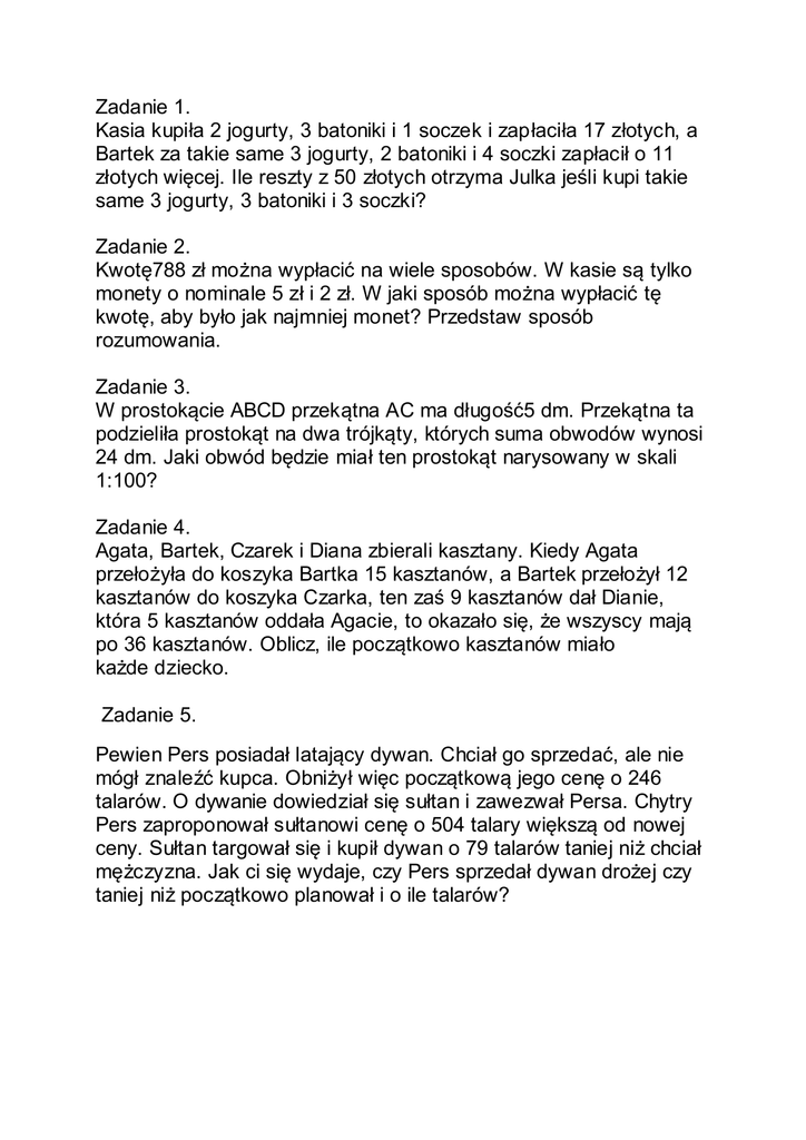 Zadanie 1. Kasia kupiła 2 jogurty, 3 batoniki i 1 soczek i zapłaciła 17 złotych, a Bartek za takie same 3 jogurty, 2 batoniki i 4 soczki zapłacił o 11 złotych więcej. Ile reszty z 50 złotych otrzyma Julka jeśli kupi takie same 3 jogurty, 3 batoniki i 3 soczki? Zadanie 2. Kwotę788 zł można wypłacić na wiele sposobów. W kasie są tylko monety o nominale 5 zł i 2 zł. W jaki sposób można wypłacić tę kwotę, aby było jak najmniej monet? Przedstaw sposób rozumowania. Zadanie 3. W prostokącie ABCD przekątna AC ma długość5 dm. Przekątna ta podzieliła prostokąt na dwa trójkąty, których suma obwodów wynosi 24 dm. Jaki obwód będzie miał ten prostokąt narysowany w skali 1:100? Zadanie 4. Agata, Bartek, Czarek i Diana zbierali kasztany. Kiedy Agata przełożyła do koszyka Bartka 15 kasztanów, a Bartek przełożył 12 kasztanów do koszyka Czarka, ten zaś 9 kasztanów dał Dianie, która 5 kasztanów oddała Agacie, to okazało się, że wszyscy mają po 36 kasztanów. Oblicz, ile początkowo kasztanów miało każde dziecko. Zadanie 5. Pewien Pers posiadał latający dywan. Chciał go sprzedać, ale nie mógł znaleźć kupca. Obniżył więc początkową jego cenę o 246 talarów. O dywanie dowiedział się sułtan i zawezwał Persa. Chytry Pers zaproponował sułtanowi cenę o 504 talary większą od nowej ceny. Sułtan targował się i kupił dywan o 79 talarów taniej niż chciał mężczyzna. Jak ci się wydaje, czy Pers sprzedał dywan drożej czy taniej niż początkowo planował i o ile talarów?