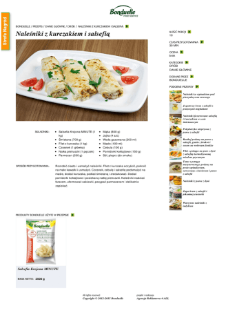 BONDUELLE / PRZEPIS / DANIE GŁÓWNE / DRÓB / NALEŚNIKI Z KURCZAKIEM I SALSEFIĄ Naleśniki z kurczakiem i salsefią ILOŚĆ PORCJI 10 CZAS PRZYGOTOWANIA 30 MIN OCENA brak KATEGORIE DRÓB DANIE GŁÓWNE DODANE PRZEZ BONDUELLE PODOBNE PRZEPISY Naleśniki ze szpinakiem pod pierzynką sosu serowego Jogurtowy krem z salsefii z prażonymi migdałami Naleśniki faszerowane salsefią i kurczakiem w sosie śmietanowym Salsefia Krojona MINUTE (1 kg) Śmietana (700 g) Filet z kurczaka (1 kg) Czosnek (1 główka) Natka pietruszki (1 pęczek) Parmezan (200 g) SKŁADNIKI: SPOSÓB PRZYGOTOWANIA: Mąka (800 g) Jajka (4 szt.) Woda gazowana (200 ml) Masło (100 ml) Cebula (100 g) Pomidorki koktajlowe (150 g) Sól, pieprz (do smaku) Rozrobić ciasto i usmażyć naleśniki. Filet z kurczaka oczyścić, pokroić na małe kawałki i usmażyć. Czosnek, cebulę i salsefię podsmażyć na maśle, dodać kurczaka, podlać śmietaną i zredukować. Dodać pomidorki koktajlowe i posiekaną natkę pietruszki. Naleśniki nadziać farszem, uformować sakiewki, posypać parmezanem i delikatnie zapiekać. Polędwiczka wieprzowa z puree z salsefii Rostbef podany na puree z salsefii, gratin z brukwi i sosem na wołowym fondzie Filet z pstrąga na pure z dyni z salsefią karmelizowaną miodem gryczanym Tatar z pstrąga marynowanego podany na pesto szpinakowym, serwowany z kawiorem i puree z salsefii Naleśniki z puree z dyni Zupa krem z salsefii i pikantnej cieciorki Warzywne naleśniki z indykiem PRODUKTY BONDUELLE UŻYTE W PRZEPISIE Salsefia Krojona MINUTE MASA NETTO: 2500 g All rights reserved projekt i realizacja Copyright © 2012-2015 Bonduelle Agencja Reklamowa 4 ALL