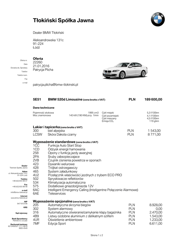 7åRNLĤVNL 6SyåND Jawna Dealer BMW 7æRNLĥVNL Aleksandrowska 131c 91-224 ļyGĵ Oferta nr. Data Doradca ds. 6SUHGDį\ Telefon Oferta 22260 21.01.2016 Patrycja Plicha Telefon kom. Fax e-mail [email protected] 5E51 BMW 520d Limousine (cena brutto z VAT) PLN 189 600,00 Dane techniczne 3RMHPQRĬĕ skokowa Moc znamionowa 1995 cm3 140 kW (190 KM) przy 1/min Cykl miejski Cykl pozamiejski Cykl mieszany Emisja CO2 Lakier i tapicerka (cena brutto z VAT) 300 biel alpejska LCSW Skóra Dakota czarny Dealer 7æRNLĥVNL 6SyæND Jawna Adres ul. Aleksandrowska 131c 91-224 Lodz Telefon +48 (42) 655 98 47 Fax +48 (42) 655 98 48 e-mail [email protected] Internet www.bmw-tlokinski.pl NIP 9471973706 KRS 6ēG rejonowy Bank Sprzedawcy PEKAO O. w ļRG]L Rachunek bankowy 6212405527 1111 0010 3605 4540 5,3 l/100km 4,1 l/100km 4,5 l/100km 119 g/km PLN PLN 1 543,00 8 771,00 :\SRVDĮenie standardowe (cena brutto z VAT) 1CC Funkcja Auto Start Stop 1CD Odzysk energii hamowania 258 Opony z IXQNFMĔ jazdy awaryjnej 2PA Sruby zabezpieczajace 2VB Czujnik cisnienia powietrza w oponach 423 Dywaniki welurowe 428 Trójkat ostrzegawczy 465 System ]DæDGXQNRZ\ 4U2 3U]HæĔF]QLN ZæDĬFLZRĬFL jezdnych z trybem ECO PRO 502 Spryskiwacze reflektorów 534 Klimatyzacja automatyczna 575 Dodatkowe gniazdo/gniazda 12V 6AC Intelligent Emergency Calling (Inteligentne 3RæĔF]HQLH Alarmowe) 6AE Teleservices :\SRVDĮHQLH opcjonalne (cena brutto z VAT) 205 Automatyczna skrzynia biegów 302 System alarmowy 316 Automatyczne otwieranie/zamykanie klapy EDJDįQLND 4B9 Listwy ozdobne aluminium z delikatnym szlifem 4UR 2ĬZLHWOHQLH ambientowe 7MF Edycja Sport Strona 1 z 2 PLN PLN PLN PLN PLN PLN 8.928,00 0,00 2.470,00 1.543,00 1.233,00 6.611,00 Oferta nr. Data Oferta 22260 21.01.2016 24G 18" Light alloy wheels Double-spoke 609 with mixed tyres/run-flat tyres Kierownica sportowa, skórzana Obramowania satynowe aluminium BMW Individual Diodowe swiatla przeciwmgielne PLN 0,00 PLN PLN PLN 0,00 0,00 0,00 PLN PLN PLN PLN PLN PLN PLN 0,00 0,00 0,00 13.401,00 0,00 0,00 0,00 6WA Service Inclusive - 5 Jahre/100.000km Polska wersja Mę]\NRZD Polska instrukcja obslugi BMW ConnectedDrive Advanced System nawigacyjny Professional ConnectedDrive Services 8VæXJL ConnectedDrive) 3HæQD bezprzewodowa integracja kompatybilnych telefonów komórkowych wraz z USB Deska rozdzielcza o rozszerzonym zakresie PLN 0,00 ZP5 431 464 494 508 Polski pakiet Lusterko wsteczne przyciemniane automatycznie 5ęNDZ na narty Ogrzewanie foteli przednich Czujniki parkowania z W\æX i z przodu PLN PLN PLN PLN PLN 4.826,00 0,00 0,00 0,00 0,00 :\SRVDĮenie opcjonalne razem PLN 49 326,00 Cena katalogowa (cena brutto z VAT) PLN 238 926,00 Cena FDåNRZLWD netto (bez VAT) PLN 194 248,78 Total cena brutto z VAT PLN 238 926,00 255 3MB 5A1 7NH 8A1 8AT ZD4 609 6AK 6NS Nota prawna Podane ceny VĔ cenami detalicznymi, ]DZLHUDMĔF\PL podatek VAT oraz podatek akcyzowy. Strona 2 z 2 Przykładowa kalkulacja Model. 520d Limousine Przegląd cen. cena Cena Cena brutto Wyposażenie dodatkowe brutto 189 600,00 PLN 49 326,00 PLN Całkowita cena pojazdu 238 926,00 PLN Przykładowa kalkulacja finansowa. Miesięczna rata brutto 2 794,35 PLN BMW Comfort Lease Decydując się na BMW Comfort Lease zyskujesz możliwość swobodnego wyboru parametrów umowy tak, by była ona najlepiej dostosowana do Twoich oczekiwań. Oferta łączy w sobie zalety podatkowe leasingu operacyjnego z niskim obciążeniem miesięcznym, minimalizację kosztów finansowania pojazdu, gwarancję odkupu i możliwość zmiany samochodu na nowy, po zakończeniu umowy leasingu. Unikatowa konstrukcja BMW Comfort Lease sprawia, że nowe BMW jest teraz także w Twoim zasięgu. Cena z wyposażeniem dodatkowym 238 926,00 zł Opłata wstępna 25,00 % Opłata wstępna 59 731,50 zł Okres leasingu 36 Miesiące Deklarowany średnioroczny przebieg 20 000 km Gwarantowana wartość końcowa 46,81 % Gwarantowana wartość końcowa 111 831,86 zł Miesięczna rata brutto 2 794,35 zł 21.01.16 15:03 BMW Financial Services Polska Przykładowa kalkulacja Warunki finansowania. Parametry finansowania możesz dobrać wedle indywidualnych preferencji. Opłata wstępna od 0% do 35%, okres finansowania 24-60 miesięcy, wartość końcowa uzależniona od długości okresu finansowania oraz deklarowanego, średniorocznego przebiegu w kilometrach. Przykładowa kalkulacja została przygotowana w oparciu o zmienną stawkę WIBOR 1M dla PLN i w przypadku jej zmiany wysokość miesięcznych rat leasingowych może się różnić. Nota prawna. Prezentowane powyżej kwoty zawierają podatek VAT. Przedstawiona propozycja jest niewiążąca i nie stanowi oferty w rozumieniu art. 66 Kodeksu Cywilnego. Niniejsze parametry mają charakter wstępny. Ostateczne warunki zależą od oceny sytuacji finansowo-prawnej Leasingobiorcy oraz zaproponowanej struktury zabezpieczeń i zostaną uregulowane w umowie leasingowej. Po szczegółową ofertę zapraszamy do najbliższego Dealera BMW, gdzie Doradca ds. Finasowania przedstawi kalkulację, dopasowaną do Twoich potrzeb. BMW Comfort Lease jest oferowany w Polsce przez BMW Financial Services Polska Sp. z o.o. 21.01.16 15:03 BMW Financial Services Polska