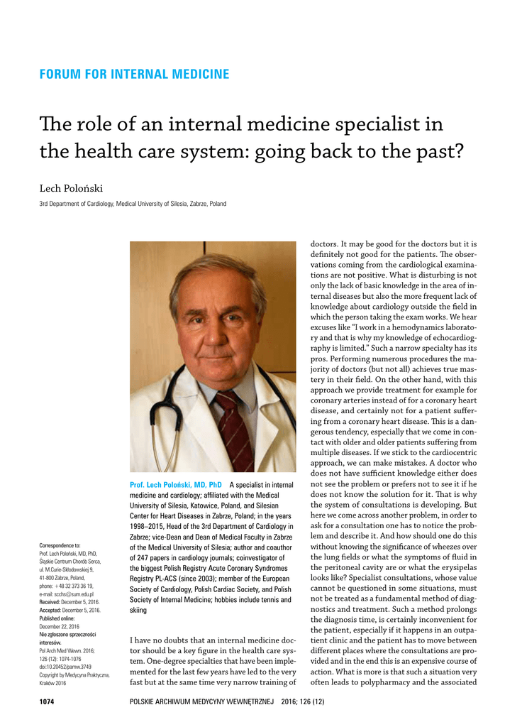 FORUM FOR INTERNAL MEDICINE The role of an internal medicine specialist in the health care system: going back to the past? Lech Poloński 3rd Department of Cardiology, Medical University of Silesia, Zabrze, Poland Correspondence to: Prof. Lech Poloński, MD, PhD, Śląskie Centrum Chorób Serca, ul. M.Curie‑Skłodowskiej 9, 41-800 Zabrze, Poland, phone: +48 32 373 36 19, e‑mail: [email protected] Received: December 5, 2016. Accepted: December 5, 2016. Published online: December 22, 2016 Nie zgłoszono sprzeczności interesów. Pol Arch Med Wewn. 2016; 126 (12): 1074-1076 doi:10.20452/pamw.3749 Copyright by Medycyna Praktyczna, Kraków 2016 1074 Prof. Lech Poloński, MD, PhD A specialist in internal medicine and cardiology; affiliated with the Medical University of Silesia, Katowice, Poland, and Silesian Center for Heart Diseases in Zabrze, Poland; in the years 1998–2015, Head of the 3rd Department of Cardiology in Zabrze; vice‑Dean and Dean of Medical Faculty in Zabrze of the Medical University of Silesia; author and coauthor of 247 papers in cardiology journals; coinvestigator of the biggest Polish Registry Acute Coronary Syndromes Registry PL‑ACS (since 2003); member of the European Society of Cardiology, Polish Cardiac Society, and Polish Society of Internal Medicine; hobbies include tennis and skiing I have no doubts that an internal medicine doc‑ tor should be a key figure in the health care sys‑ tem. One‑degree specialties that have been imple‑ mented for the last few years have led to the very fast but at the same time very narrow training of doctors. It may be good for the doctors but it is definitely not good for the patients. The obser‑ vations coming from the cardiological examina‑ tions are not positive. What is disturbing is not only the lack of basic knowledge in the area of in‑ ternal diseases but also the more frequent lack of knowledge about cardiology outside the field in which the person taking the exam works. We hear excuses like “I work in a hemodynamics laborato‑ ry and that is why my knowledge of echocardiog‑ raphy is limited.” Such a narrow specialty has its pros. Performing numerous procedures the ma‑ jority of doctors (but not all) achieves true mas‑ tery in their field. On the other hand, with this approach we provide treatment for example for coronary arteries instead of for a coronary heart disease, and certainly not for a patient suffer‑ ing from a coronary heart disease. This is a dan‑ gerous tendency, especially that we come in con‑ tact with older and older patients suffering from multiple diseases. If we stick to the cardiocentric approach, we can make mistakes. A doctor who does not have sufficient knowledge either does not see the problem or prefers not to see it if he does not know the solution for it. That is why the system of consultations is developing. But here we come across another problem, in order to ask for a consultation one has to notice the prob‑ lem and describe it. And how should one do this without knowing the significance of wheezes over the lung fields or what the symptoms of fluid in the peritoneal cavity are or what the erysipelas looks like? Specialist consultations, whose value cannot be questioned in some situations, must not be treated as a fundamental method of diag‑ nostics and treatment. Such a method prolongs the diagnosis time, is certainly inconvenient for the patient, especially if it happens in an outpa‑ tient clinic and the patient has to move between different places where the consultations are pro‑ vided and in the end this is an expensive course of action. What is more is that such a situation very often leads to polypharmacy and the associated POLSKIE ARCHIWUM MEDYCYNY WEWNĘTRZNEJ 2016; 126 (12) risk of drug interaction. The current system lacks the presence of a doctor who would look at the patient holistically and “coordinate” all those ac‑ tivities. I think that in the case of some patients the role of a “coordinator” should belong to (and often does) a general practitioner. Considering the competencies and knowledge, more difficult cases should be run by an internal medicine spe‑ cialist. I am trying to get into the patient’s shoes who is experiencing for example shortness of breath. The first examination should be conduct‑ ed by a general practitioner. If he or she identi‑ fies the underlying cause and can treat it, like for example in the case of bronchitis, then the diag‑ nostics and treatment will end at this stage. If the patient had suffered a heart attack, is suf‑ fering from a duodenal ulcer disease, is 75 years old, had worked in a mine and has pneumoco‑ niosis and has respiratory problems because of this, then the case is more difficult. Such a pa‑ tient should remain under the care of an internal medicine specialist, aided by a consulting pulmo‑ nologist or cardiologist if the need be. Neverthe‑ less, in both cases, that is the patient with bron‑ chitis and the patient with several diseases, there should be one doctor in charge. The aging society will more and more often require comprehensive and specialist care. Such care can be provided by the internal medicine specialists or to some de‑ gree general practitioners if the training curric‑ ulum is changed and there is even more empha‑ sis placed on the internal diseases. Therefore, what should be the role of an internal medicine specialist in the health care system? It should be a doctor in charge of difficult cases which can‑ not be solved by a general practitioner. This doc‑ tor should decide about the need of specialist consultation, specifying the questions to which he or she needs answers from a specialist. If it is a well prepared internal medicine specialist then 1–2 consultations per year will most likely suffice, even for difficult cases. What will we gain from this or, even better, what will the patient gain from such organization? Firstly, the pat