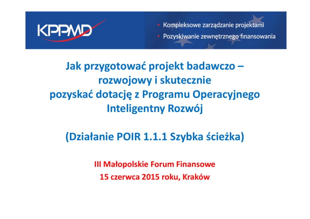 Jak przygotować projekt badawczo – rozwojowy i skutecznie pozyskać dotację z Programu Operacyjnego Inteligentny Rozwój (Działanie POIR 1.1.1 Szybka ścieżka) III Małopolskie Forum Finansowe 15 czerwca 2015 roku, Kraków Badania przemysłowe i prace rozwojowe realizowane przez przedsiębiorstwa (Działanie 1.1.1 PO Inteligentny Rozwój) – szybka ścieżka Czas trwania konkursu 4.05.2015 – 31.12.2015 Skierowany wyłącznie do MŚP Wniosek składany tylko elektronicznie Konkurs: nabór, ocena, listy (w danym miesiącu kalendarzowym) • Badania przemysłowe i prace rozwojowe lub tylko prace rozwojowe • Projekty nie uwzględniające prac rozwojowych nie mogą uzyskać dofinansowania • Maksymalnie 4 etapy zadań badawczych • • • • Badania przemysłowe i prace rozwojowe realizowane przez przedsiębiorstwa (Działanie 1.1.1 PO Inteligentny Rozwój) – szybka ścieżka • Projekt: • obejmuje badania przemysłowe i prace rozwojowe albo prace rozwojowe • przewiduje wdrożenie wyników projektu • przedmiot projektu nie wpisuje się w działalności wykluczone • minimalna wartość kosztów kwalifikowalnych projektu wynosi 2 mln PLN • realizacja projektu nie rozpoczęła się przed dniem złożenia wniosku o dofinansowanie Badania przemysłowe i prace rozwojowe realizowane przez przedsiębiorstwa (Działanie 1.1.1 PO Inteligentny Rozwój) – szybka ścieżka • Najważniejszy jest pomysł, innowacyjny i wyróżniający się • Wniosek jest krótki, opisy zwięzłe – limity znaków w polach wniosku, mało załączników • Język polski + język angielski (wybrane pola) • Generator wniosków uniemożliwia popełnienie części błędów (walidacje, pola wypełniane automatycznie), zapewnia spełnienie części kryteriów Szybka ścieżka - uwaga • Konkurs podzielony jest na etapy. Etap konkursu obejmuje nabór wniosków w danym miesiącu kalendarzowym, ich ocenę formalną i merytoryczną oraz opublikowanie list projektów rekomendowanych i nierekomendowanych do dofinansowania; procedura ta ma trwać 60 dni • Projekt, który nie został wybrany do dofinansowania na danym etapie konkursu, może zostać złożony w kolejnym etapie tego konkursu, jednak nie wcześniej niż po upływie 3 miesięcy od dnia opublikowania informacji o wynikach konkursu • Niezachowanie ww. terminu skutkować będzie odrzuceniem wniosku Budżet i alokacja Kwota środków przeznaczonych na dofinansowanie projektów w ramach ogłaszanej rundy aplikacyjnej w 2015 r. dla Działania 1.1, Poddziałanie 1.1.1 wynosi: 1 600 000 000 PLN w tym: • dla projektów zlokalizowanych w województwie mazowieckim: 140 000 000 PLN; • dla projektów zlokalizowanych w województwie innym niż mazowieckie: 1 460 000 000 PLN • Po pierwszym miesiącu naboru: Narodowe Centrum Badań i Rozwoju informuje, że w maju 2015 r. (w ramach pierwszego etapu konkursu) wpłynęło 179 wniosków o dofinansowanie projektów na łączną kwotę dofinansowania 1 179 704 739,77 PLN, z czego kwota 194 505 893,50 PLN przypada na projekty zlokalizowane w województwie mazowieckim Poziom wsparcia Minimalna wartość kosztów kwalifikowalnych projektu dofinansowanego w ramach konkursu wynosi 2 mln PLN. Maksymalna wartość dofinansowania (udzielonej pomocy publicznej) nie może przekroczyć dla przedsiębiorstwa na jeden projekt pułapów określonych w § 9 ust.1 rozporządzenia MNiSW, t.j.: • 20 mln euro – jeżeli projekt obejmuje głównie badania przemysłowe, dotyczy to sytuacji, w której więcej niż połowa kosztów kwalifikowanych projektu jest ponoszona na działania wchodzące w zakres kategorii badań przemysłowych, lub • 15 mln euro – jeżeli projekt obejmuje głównie prace rozwojowe, dotyczy to sytuacji, w której więcej niż połowa kosztów kwalifikowanych projektu jest ponoszona na działania wchodzące w zakres kategorii prac rozwojowych. Poziom dofinansowania Mikro i małe firmy • 70% kosztów kwalifikowanych w przypadku badań przemysłowych • 45% kosztów kwalifikowanych w przypadku prac rozwojowych Średnie firmy • 60% kosztów kwalifikowanych w przypadku badań przemysłowych • 35% kosztów kwalifikowanych w przypadku prac rozwojowych • W przypadku szerokiego rozpowszechniania wyników projektu zgodnie z § 14 rozporządzenia (…) +15% Premie za rozpowszechnianie wyników projektu w okresie 3 lat od zakończenia projektu wyniki projektu: • zostaną zaprezentowane na co najmniej 3 konferencjach naukowych i technicznych, w tym co najmniej 1 o randze ogólnokrajowej lub • zostaną opublikowane w co najmniej 2 czasopismach naukowych lub technicznych zawartych w wykazie czasopism opracowanym przez MNISW lub powszechnie dostępnych bazach danych zapewniających swobodny dostęp do uzyskanych wyników badań (surowych danych badawczych), lub • zostaną w całości rozpowszechnione za pośrednictwem oprogramowania bezpłatnego lub oprogramowania z licencją otwartego dostępu. Mikro i małe firmy 80% kosztów kwalifikowanych w przypadku badań przemysłowych 60% kosztów kwalifikowanych w przypadku prac rozwojowych Średnie firmy 75% kosztów kwalifikowanych w przypadku badań przemysłowych 50% kosztów kwalifikowanych w przypadku prac rozwojowych Gotowość wyników projektu do wdrożenia Dofinansowanie projektu może być udzielone pod warunkiem zobowiązania się beneficjenta do wdrożenia wyników projektu, rozumianego jako: a) wprowadzenie wyników badań lub prac do własnej działalności gospodarczej Wnioskodawcy poprzez rozpoczęcie produkcji lub świadczenia usług na bazie uzyskanych wyników projektu; b) udzielenie licencji (na zasadach rynkowych) na korzystanie z przysługujących Wnioskodawcy praw własności przemysłowej w działalności gospodarczej prowadzonej przez innego przedsiębiorcę; c) sprzedaż (na zasadach rynkowych) praw do wyników tych badań lub prac w celu wprowadzenia ich do działalności gospodarczej innego przedsiębiorcy (z zastrzeżen