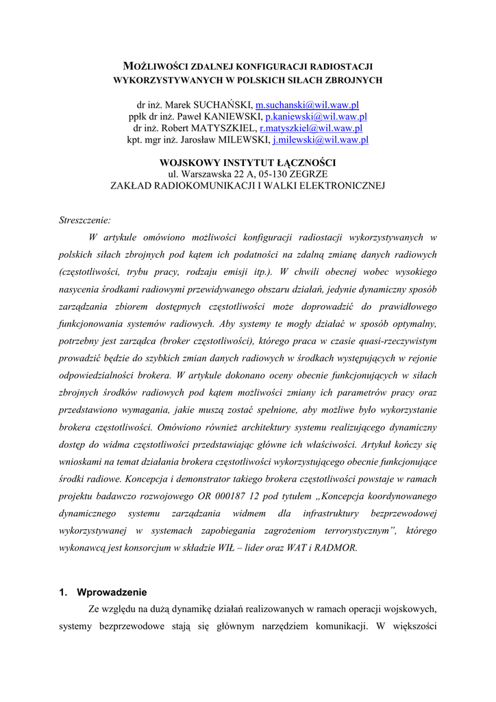 MOŻLIWOŚCI ZDALNEJ KONFIGURACJI RADIOSTACJI WYKORZYSTYWANYCH W POLSKICH SIŁACH ZBROJNYCH dr inż. Marek SUCHAŃSKI, [email protected] ppłk dr inż. Paweł KANIEWSKI, [email protected] dr inż. Robert MATYSZKIEL, [email protected] kpt. mgr inż. Jarosław MILEWSKI, [email protected] WOJSKOWY INSTYTUT ŁĄCZNOŚCI ul. Warszawska 22 A, 05-130 ZEGRZE ZAKŁAD RADIOKOMUNIKACJI I WALKI ELEKTRONICZNEJ Streszczenie: W artykule omówiono możliwości konfiguracji radiostacji wykorzystywanych w polskich siłach zbrojnych pod kątem ich podatności na zdalną zmianę danych radiowych (częstotliwości, trybu pracy, rodzaju emisji itp.). W chwili obecnej wobec wysokiego nasycenia środkami radiowymi przewidywanego obszaru działań, jedynie dynamiczny sposób zarządzania zbiorem dostępnych częstotliwości może doprowadzić do prawidłowego funkcjonowania systemów radiowych. Aby systemy te mogły działać w sposób optymalny, potrzebny jest zarządca (broker częstotliwości), którego praca w czasie quasi-rzeczywistym prowadzić będzie do szybkich zmian danych radiowych w środkach występujących w rejonie odpowiedzialności brokera. W artykule dokonano oceny obecnie funkcjonujących w siłach zbrojnych środków radiowych pod kątem możliwości zmiany ich parametrów pracy oraz przedstawiono wymagania, jakie muszą zostać spełnione, aby możliwe było wykorzystanie brokera częstotliwości. Omówiono również architektury systemu realizującego dynamiczny dostęp do widma częstotliwości przedstawiając główne ich właściwości. Artykuł kończy się wnioskami na temat działania brokera częstotliwości wykorzystującego obecnie funkcjonujące środki radiowe. Koncepcja i demonstrator takiego brokera częstotliwości powstaje w ramach projektu badawczo rozwojowego OR 000187 12 pod tytułem „Koncepcja koordynowanego dynamicznego systemu zarządzania widmem dla infrastruktury bezprzewodowej wykorzystywanej w systemach zapobiegania zagrożeniom terrorystycznym”, którego wykonawcą jest konsorcjum w składzie WIŁ – lider oraz WAT i RADMOR. 1. Wprowadzenie Ze względu na dużą dynamikę działań realizowanych w ramach operacji wojskowych, systemy bezprzewodowe stają się głównym narzędziem komunikacji. W większości przypadków działania te prowadzone są w otoczeniu, w którym środowisko elektromagnetyczne charakteryzuje się dużym nasyceniem środków emitujących fale radiowe. Systemy bezprzewodowe narażone są na wysoki poziom interferencji, prowadzących do wzajemnych, elektromagnetycznych kolizji systemów własnych. Zjawiska takie są wynikiem zarówno niedostatków widma stanowiącego zasób naturalny o ograniczonej pojemności, jak i obecnej praktyki zarządzania nim - bazującej na statycznych metodach przeznaczeń i przydziału częstotliwości (ang. allotment and assignment). Jednocześnie okazuje się, że czasowy poziom wykorzystania widma nie przekracza 10 %. Spostrzeżenia te stały się przyczyną podjęcia badań nad zwiększeniem efektywności wykorzystania widma poprzez stosowanie tzw. dynamicznego dostępu do niego (ang. Dynamic Spectrum Access - DSA). Koncepcja DSA jest ucieleśnieniem idei współdzielenia widma przez różne systemy bezprzewodowe. W literaturze przedmiotu rozważa się dwie architektury DSA, a mianowicie: • koordynowany dynamiczny dostęp do widma (ang. Coordinated Dynamic Spectrum Access - CDSA), polegający na wykorzystaniu pewnej infrastruktury z brokerem widma, jako jej głównym elementem, • oportunistyczny dostęp do widma (ang. Opportunistic Spectrum Access - OSA), który realizuje ideę oportunistycznego wykorzystania nieużywanych chwilowo fragmentów widma ("spectrum holes"), z przestrzeganiem zasady niezakłócania innych środków radiowych. W tej filozofii przewiduje się konieczność stworzenia zaawansowanych metod badania zajętości widma. Filozofia ta znajdzie w przyszłości ucieleśnienie w nowej generacji systemów - tzw. Cognitive Radio (radio samouczące się środowiska elektromagnetycznego). Praktyczna implementacja idei DSA wymaga wprowadzenia odpowiednich metod zarządzania widmem, uwzględniających dynamikę zmian środowiska, mobilność systemów i ewentualny wpływ systemów walki elektronicznej. Bez względu na przyjętą filozofię zarządzania widmem, każda koncepcja prowadzi do częstych zmian (przeprogramowania) parametrów wykorzystywanych urządzeń nadawczo – odbiorczych. W SZ RP stosowanych jest wiele rodzajów środków łączności radiowej, które na uzbrojenie wprowadzano w różnych okresach czasu. Wprawdzie obecnie dominują radiostacje cyfrowe, to jednak nadal spotykane są analogowe radiostacje starszej generacji. Ich wykorzystanie jest już niewielkie, ograniczone do nielicznych relacji. W artykule wyróżniono dwa zagadnienia. Pierwsze dotyczy koncepcji zautomatyzowanego systemu zarządzania widmem dla sieci i urządzeń bezprzewodowych znajdujących się w eksploatacji obecnie lub przewidzianych do wdrożenia w najbliższej przyszłości. W ramach drugiego zagadnienia przedstawiono możliwości techniczne zdalnej konfiguracji radiostacji dominujących w polskich siłach zbrojnych - radiostacji UKF rodziny PR4G firmy Radmor oraz KF firmy Harris. 2. Koordynowane dynamiczne zarządzanie widmem Koncepcja zautomatyzowanego systemu zarządzania widmem dla sieci i urządzeń bezprzewodowych jest obecnie opracowywana w ramach projektu realizowanego przez konsorcjum, w skład którego wchodzi Wojskowy Instytut Łączności, Wojskowa Akademia Techniczna oraz firma Radmor. Założono w niej, że możliwe jest zastosowanie koordynowanego dynamicznego dostępu do widma, a zatem odpowiednio koordynowanego dynamicznego zarządzania widmem (CDSA). Istotą i wspólną cechą CDSA jest stosowanie centralnego (regionalnego) brokera widma. W literaturze przedmiotu rozważa się różnorodne implementacje tej filozofii zarządzania, mieszczące się między koncepcjami reprezentowanymi p