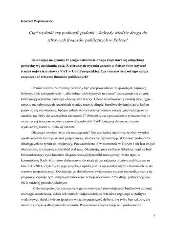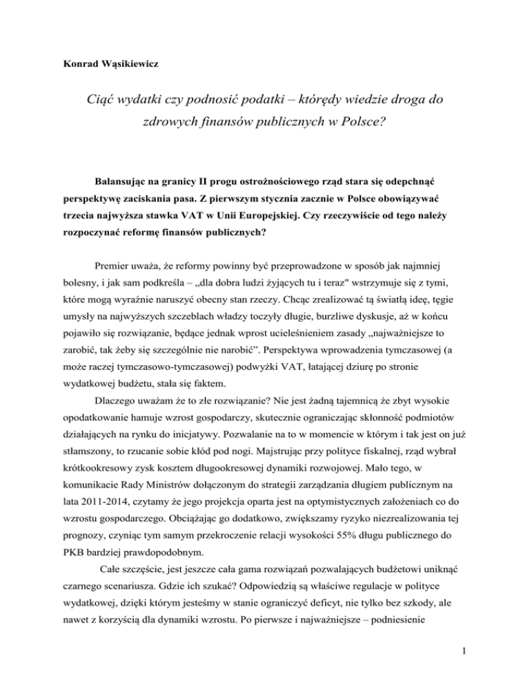 Konrad Wąsikiewicz Ciąć wydatki czy podnosić podatki – którędy wiedzie droga do zdrowych finansów publicznych w Polsce? Balansując na granicy II progu ostrożnościowego rząd stara się odepchnąć perspektywę zaciskania pasa. Z pierwszym stycznia zacznie w Polsce obowiązywać trzecia najwyższa stawka VAT w Unii Europejskiej. Czy rzeczywiście od tego należy rozpoczynać reformę finansów publicznych? Premier uważa, że reformy powinny być przeprowadzone w sposób jak najmniej bolesny, i jak sam podkreśla – „dla dobra ludzi żyjących tu i teraz" wstrzymuje się z tymi, które mogą wyraźnie naruszyć obecny stan rzeczy. Chcąc zrealizować tą światłą ideę, tęgie umysły na najwyższych szczeblach władzy toczyły długie, burzliwe dyskusje, aż w końcu pojawiło się rozwiązanie, będące jednak wprost ucieleśnieniem zasady „najważniejsze to zarobić, tak żeby się szczególnie nie narobić”. Perspektywa wprowadzenia tymczasowej (a może raczej tymczasowo-tymczasowej) podwyżki VAT, łatającej dziurę po stronie wydatkowej budżetu, stała się faktem. Dlaczego uważam że to złe rozwiązanie? Nie jest żadną tajemnicą że zbyt wysokie opodatkowanie hamuje wzrost gospodarczy, skutecznie ograniczając skłonność podmiotów działających na rynku do inicjatywy. Pozwalanie na to w momencie w którym i tak jest on już stłamszony, to rzucanie sobie kłód pod nogi. Majstrując przy polityce fiskalnej, rząd wybrał krótkookresowy zysk kosztem długookresowej dynamiki rozwojowej. Mało tego, w komunikacie Rady Ministrów dołączonym do strategii zarządzania długiem publicznym na lata 2011-2014, czytamy że jego projekcja oparta jest na optymistycznych założeniach co do wzrostu gospodarczego. Obciążając go dodatkowo, zwiększamy ryzyko niezrealizowania tej prognozy, czyniąc tym samym przekroczenie relacji wysokości 55% długu publicznego do PKB bardziej prawdopodobnym. Całe szczęście, jest jeszcze cała gama rozwiązań pozwalających budżetowi uniknąć czarnego scenariusza. Gdzie ich szukać? Odpowiedzią są właściwe regulacje w polityce wydatkowej, dzięki którym jesteśmy w stanie ograniczyć deficyt, nie tylko bez szkody, ale nawet z korzyścią dla dynamiki wzrostu. Po pierwsze i najważniejsze – podniesienie 1 ogólnego wieku emerytalnego. Pomoże to nie tylko odciążyć finanse publiczne, których FUS jest częścią, ale też pomoże utrzymać poziom życia emerytów, który jeżeli system zostanie zachowany w obecnym kształcie, będzie się pogarszał. Po drugie - ograniczenie przywilejów emerytalnych. W samym tylko 2010 roku na finansowanie uprzywilejowanych emerytur państwo wyda 26 mld zł. Całkowita ich likwidacja nie wchodzi w grę – ciężko sobie wyobrazić pracującego górnika po 60-tce. Jednak w sytuacji w której co piąty mundurowy przechodzi na emeryturę przed 40-tką powinniśmy poważnie zastanowić się nad sensownością takiego rozwiązania. Po trzecie – redukcja rozmiarów administracji publicznej – jej rozrost na przestrzeni 5 ostatnich lat aż o blisko 100 tys. jest niewspółmierny do potrzeb. Generuje ona miliardowe koszty, nie będąc szczególnie efektywną. Przedstawiono niedawno plan redukcji zatrudnienia w sektorze o 10%. Dlaczego o tyle? Racjonalniej byłoby przyjąć kryterium efektywnościowe, nie trzymając się arbitralnych progów. Może należałoby się skupić na stworzeniu funkcjonującej dobrze na zachodzie Europy e-administracji? Zyskalibyśmy większą wydajność, przy mniejszych kosztach. Po czwarte – ograniczenie dostępności ubezpieczeń w KRUS dla bogatych rolników. Rolnictwo w swojej naturze jest bardzo zróżnicowane. Ustawodawca powinien więc przewidzieć możliwość rozliczania szczególnie dochodowych gospodarstw na niepreferencyjnych zasadach. Po piąte - becikowe. Wydatek socjalny, który jak pokazała praktyka, nijak się ma do zwiększania współczynnika urodzeń. Cóż, trudno żeby ktoś zdecydował się na dziecko z uwagi na 1000 zł świadczenia. Po szóste - zasiłek pogrzebowy. W prawdzie rząd obniżył go do 4 tys. zł, lecz dalej jest jednym z najwyższych w UE. Dziesięć krajów członkowskich w ogóle go nie wypłaca, a te które to robią, utrzymują stawkę na sporo niższym poziomie. Po siódme - rezygnacja z podwyżek dla nauczycieli. Wzrost wynagrodzeń nie koreluje tu z jakością kształcenia. Należy najpierw przeprowadzić reformę strukturalną, dopiero potem myśleć nad regulacją płac. W przeciwnym razie utrwalamy tylko zły stan rzeczy. Po ósme – zaprzestanie subsydiowania kredytów hipotecznych. Rodzą spore koszty i napędzają boom mieszkaniowy, w dłuższej perspektywie prowadząc do destabilizacji sektora. Rządzący, chcąc uzdrowić finanse publiczne, nie mogą kierować się chęcią zadowalania wszystkich grup społecznych na raz. Niemożliwe jest całkowicie bezbolesne wprowadzenie efektywnych rozwiązań. Podnoszenie podatków to działanie po najniższej linii oporu. Jeżeli więc nie zmotywujemy polityków siłą naszych wyborczych głosów, będziemy tkwić we względnie wygodnym marazmie, powoli zaprzepaszczając szanse polskiej gospodarki. Może się wtedy okazać że reformatorska bierność była bardziej kosztowna niż wykazanie inicjatywy. 2