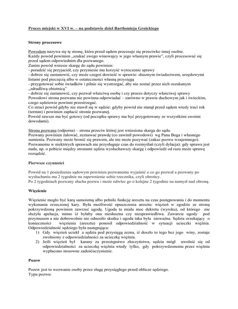 Proces miejski w XVI w. – na podstawie dzieł Bartłomieja Groickiego Strony procesowe Powodem nazywa się tę stronę, która przed sądem procesuje się przeciwko innej osobie. Każdy powód powinien „szukać swego winowajcy w jego własnym prawie”, czyli procesować się przed sądem odpowiednim dla pozwanego. Zanim powód wniesie skargę do sądu powinien: - poradzić się przyjaciół, czy przyniesie mu korzyść wytoczenie sprawy - dobrze się zastanowić, czy może czegoś dowieść w sprawie: słusznym świadectwem, urzędowymi listami pod pieczęcią albo w ostateczności własną przysięgą - przygotować sobie świadków i pilnie się wystrzegać, aby nie zostać przez nich oszukanym „zdradliwą obietnicą” - dobrze się zastanowić, czy pozwał właściwą osobę i czy proces dotyczy właściwej sprawy Powodowi strona pozwana nie powinna odpowiadać – zarówno w prawie duchowym jak i świeckim, czego sędziowie powinni przestrzegać. Co straci powód gdyby nie stawił się w sądzie: gdyby powód nie stanął przed sądem wtedy traci rok (termin) i powinien zapłacić stronie pozwanej. Powód zawsze ma być gotowy (od początku sprawy ma być przygotowany ze wszystkimi swoimi dowodami). Strona pozwana (odporna) – strona przeciw której jest wniesiona skarga do sądu. Pozwany powinien żałować, zeznawać prawdę (co zawinił powodowi) wg Pana Boga i własnego sumienia. Pozwany może bronić się prawem, ale nie może pozywać (zakaz pozwu wzajemnego). Pozwanemu w niektórych sprawach nie przysługuje czas do rozmyślań (czyli dylacja): gdy sprawa jest mała, np. o pobicie między stronami sędzia wysłuchawszy skargę i odpowiedź od razu może sprawę rozsądzić. Pierwsze czynności Powód na 1 posiedzeniu sądowym powinien pozwanemu wyjaśnić o co go pozwał a pozwany po wysłuchaniu ma 2 tygodnie na zapewnienie sobie rzecznika, czyli obrońcy. Po 2 tygodniach pozwany słucha pozwu i może odwlec go o kolejne 2 tygodnie na namysł nad obroną. Więzienie Więzienie mogło być karą samoistną albo pełniło funkcję aresztu na czas postępowania i do momentu wykonania orzeczonej kary. Była możliwość opuszczenia aresztu: więzień w zgodzie ze stroną pokrzywdzoną powinien zawrzeć ugodę. Ugoda ta miała moc dekretu (wyroku), od którego nie służyła apelacja, mimo iż byłaby ona niesłuszna czy niesprawiedliwa. Zawarcie ugody pod przymusem a nie dobrowolnie nie odnosiło skutku i ugoda taka była nieważna. Sędzia orzekający o konieczności więzienia (aresztu) ponosił odpowiedzialność w sytuacji ucieczki więźnia. Odpowiedzialność sędziego była następująca: 1) Gdy więzień uciekł a sędzia pod przysięgą zezna, iż doszło to tego bez jego winy, zostaje zwolniony z odpowiedzialności za ucieczkę więźnia. 2) Jeśli więzień był karany za przestępstwo złoczyństwa, sędzia mógł uwolnić się od odpowiedzialności za ucieczkę więźnia wtedy tylko, gdy pokrzywdzonemu przez więźnia wypłacono stosowne zadośćuczynienie. Pozew Pozew jest to wezwanie osoby przez sługę przysięgłego przed oblicze sędziego. Typu pozwu: 1. ustny lub pisemny – zawierał datę stawienia się w sądzie, przekazywany był przez sługę przysięgłego na polecenie sędziego 2. listowny – gdy osoba znajdowała się poza miastem czy nawet Królestwem 3. na kształt mandatu = per edictum – gdy osoba nie mogła być poinformowana listownie lub znajdowała się w niebezpiecznym miejscu albo też była uznana za zbiegłą; pozew taki musiał zostać przybity (przy udziale 2 lub 3 świadków) na domie pozwanego, jego bramie lub Ratuszu, czy też na innym miejscu, z którego pozywana osoba mogła się dowiedzieć o wezwaniu do sądu; wezwanie wedle woli sędziego było wyrażone na dzień 20 lub 30 od obwieszczenia pozwu 4. przez przywołanie = per proclama – gdy chodziło o znalezienie spadkobierców osoby zmarłej lub krewnych sieroty; dokonywano go na Rynku lub ulicy; rok sądowy wyznaczany był na 3 miesiące od wezwania 5. fikcyjne doręczenie pozwu – gdy osoba pozywana ukrywała się lub zbiegła i nie znane było jej miejsce pobytu; pozew mimo iż nie był faktycznie doręczony miał moc wiążącą Dowody Zeznanie pozwanego Zeznanie jest pewną i jasną odpowiedzią. Skutkiem zeznania przed sądem jest to, że gdy strona powodowa będzie zeznawać i przyzna się do winy to powód od potwierdzenia procesu bywa zwolniony. Przyznanie się przed sądem do winy nie może być wywołane groźbami. Nieważność zeznań Zeznanie nie jest ważne, gdy zeznaje dziecko osoby pozwanej, ponieważ z uwagi na swój młodociany wiek nie jest świadoma swoich zeznań. Zeznanie nie jest ważne również wtedy, kiedy ktoś zeznaje dla własnego pożytku oraz gdy zeznaje osoba o całkowitej lub ograniczonej poczytalności. Dokumenty (zwane przez Groickiego listami) List jest pismem urzędowym służącym potwierdzeniu na piśmie jakiejś sprawy. Listy mogą być jawne i osobliwe. List jawny : - jest ręka jawnego pisarza napisany ( króla lub urzędnika państwowego), podpisany lub zapieczętowany pieczęcią urzędową; - list sądowy; - podpisany przez dwóch lub trzech świadków. List osobliwy : - listem osobliwym jest np. wypis z rejestru urzędowego. Listy które trafiają do Sądu powinny być rozpatrzone, chyba że są sfałszowane. Pieczęcie – sposób uwierzytelnienia dokumentów Są dwa rodzaje pieczęci. Ważne są te, które w listach potwierdzają różne sprawy. Mogą to być pieczęcie królewskie lub ważnych urzędników państwowych. Drugi rodzaj pieczęci to pieczęcie które nie mogą potwierdzać żadnych ważnych dokumentów a jedynie dotyczą spraw zwykłych. Są to pieczęcie prywatne. Wyrok Wyroki wydawał sędzia. Był osobą jawną, odpowiadał przed Bogiem, miał być sprawiedliwy w swoich orzeczeniach. Gdyby miał wątpliwości co do wyroku mógł odroczyć sprawę w czasie. Powinien wysłuchiwać obie strony procesu, ża
