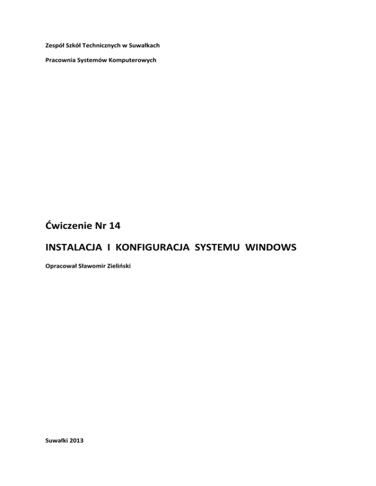 Zespół Szkół Technicznych w Suwałkach Pracownia Systemów Komputerowych Ćwiczenie Nr 14 INSTALACJA I KONFIGURACJA SYSTEMU WINDOWS Opracował Sławomir Zieliński Suwałki 2013 Cel ćwiczenia Nabycie umiejętności instalacji oraz konfiguracji jednego z systemów operacyjnych Windows Zadania 1. Korzystając z dostępnych narzędzi systemu operacyjnego sprawdzić i zapisać w sprawozdaniu najważniejsze informacje dotyczące konfiguracji sprzętowej i programowej bieżącego komputera. Informacje te powinny zawierać: a. typ procesora i jego parametry, b. pojemność pamięci RAM zainstalowanej w komputerze oraz pojemność pamięci RAM „widzianej” przez system, c. liczba dysków twardych i ich pojemność, d. typ karty graficznej, e. typ karty sieciowej, f. rodzaj płyty głównej, g. rodzaj i wersja systemu operacyjnego. Wskazówka: Informacje o systemie mogą być zgromadzone poprzez: analizę informacji wyświetlanej podczas uruchomiania komputera (w celu dłuższego przyjrzenia się informacjom wyświetlanym podczas uruchomiania komputera można na klawiaturze nacisnąć klawisz pauzy ‘Pause/Break’, który spowoduje chwilowe zatrzymanie procesu uruchomiania komputera. Proces uruchomiania można wznowić naciskając klawisz ‘Esc’), analizę informacji wyświetlanej po wejściu do menedżera urządzeń, analizę informacji wyświetlanej po uruchomieniu informacyjnego programu systemu operacyjnego o nazwie ‘msinfo32.exe’. Informacje zebrane w tym zadaniu mogą być przydatne podczas instalacji lub aktualizacji sterowników w dalszej części zajęć. 2. Używając odpowiedniego dysku instalacyjnego zainstalować system operacyjny Windows XP Professional PL lub inny, wyznaczony przez nauczyciela. Procedura instalacji jest opisana w podręczniku [1]. Podczas instalacji wypisać w sprawozdaniu najważniejsze techniczne decyzje wymagane od osoby nadzorującej instalację, np. wybór liczby partycji twardego dysku, rodzaj formatowania dysku (szybki, standardowy), itp. Należy zmierzyć i zapisać w sprawozdaniu czas instalacji systemu. Podczas instalacji niniejszego systemu operacyjnego dysk twardy komputera należy podzielić na co najmniej na dwie partycje logiczne. Pierwsza z nich posłuży do instalacji systemu 2 operacyjnego Windows XP, natomiast na druga partycja posłuży do zainstalowania systemu operacyjnego Windows Server 2008 R2. Uwaga! Proces instalacji systemu operacyjnego i sterowników może być czasochłonny. Czas ten należy wykorzystać na realizację teoretycznych zadań niniejszego ćwiczenia. 3. Przy użyciu podręcznika lub zasobów internetowych wyjaśnić konsekwencje technicznych wyborów wypisanych w zadaniu poprzednim. Na przykład, wyjaśnić, jakie są konsekwencje używania szybkiego trybu formatowania. Dodatkowo należy wyjaśnić wady i zalety instalowania systemu operacyjnego z podziałem na kilka partycji. 4. Po zainstalowaniu systemu operacyjnego, korzystając z menedżera urządzeń systemu operacyjnego sprawdzić i wypisać w sprawozdaniu, które z urządzeń komputerowych nie posiada jeszcze zainstalowanego sterownika. 5. Przy użyciu odpowiedniego dysku narzędziowego uzyskanego od nauczyciela prowadzącego zajęcia zainstalować brakujące sterowniki. W sprawozdaniu zapisać całkowity czas instalacji systemu operacyjnego, czyli sumę czasu instalacji systemu operacyjnego i czasu instalacji sterowników. 6. Zmienić nazwę komputera na ‘Stacja-XX’, gdzie XX jest numerem komputera, np. Stacja-01, Stacja-02, Stacja-03, itp. 7. Skonfigurować właściwości protokołu TCP/IP kary sieciowej zgodnie z konwencją stosowaną w pracowni teleinformatyki. Procedura konfiguracji karty sieciowej opisana jest w podręczniku [1]. Następnie sprawdzić poprawność wykonania niniejszego zadania poprzez: a. użycie funkcji diagnostycznej ping testującej poprawność połączenia sieciowego z serwerem pracowni (w wierszu poleceń wpisać ping x, gdzie x oznacza alfanumeryczną nazwę serwera pracowni lub jego adres IP), b. użycie przeglądarki internetowej sprawdzającej poprawność połączenia z Internetem. 8. Korzystając z dysku instalacyjnego uzyskanego od nauczyciela zainstalować klienta programu Symantec Ghost. Używając zasobów internetowych wyjaśnić w sprawozdaniu, do czego służy wspomniany program i w jaki sposób może on przyspieszyć procedurę instalacji systemu. Informacje o dokładnej nazwie i wersji używanego programu znajdują się na dysku instalacyjnym. 9. Przyłączyć komputer do sieciowej grupy roboczej o nazwie Uczniowie. Zademonstrować nauczycielowi efekty wykonania poleceń 7, 8 oraz 9. 10. Używając podręcznika [1] wyjaśnij, na czym polega mechanizm nienadzorowanej instalacji systemu i jaka jest jego zaleta. 11. Używając podręcznika [1] wyjaśnij, na czym polega mechanizm klonowania obrazów dysków z systemem operacyjnym. Opisz zaletę tego rozwiązania. Następnie podaj przykłady programów służących do klonowania obrazów dysków. 3 12. Korzystając z podręcznika wyjaśnij, na czym polega mechanizm plug and play. 13. Wyjaśnij, w jakim celu wykorzystywany jest mechanizm aktywacji systemu operacyjnego. 14. Wyjaśnij, do czego wykorzystywany jest mechanizm automatycznego aktualizowania systemu operacyjnego. 15. Na drugiej partycji zainstalować system operacyjny Windows Server 2008 R2 w wersji ewaluacyjnej. Podczas instalacji należy pominąć komunikat o konieczności wpisania klucza systemu. Zainstalować brakujące sterowniki (dysk ze sterownikami można uzyskać od nauczyciela). Zanotować w sprawozdaniu czas instalacji systemu oraz sterowników, a następnie porównać z całkowitym czasem instalacji systemu Windows XP. 16. Skonfigurować ustawienia TCP/IP interfejsu sieciowego w nowo zainstalowanym systemie operacyjnym zgodnie z konwencją obowiązującą w pracowni. 17. Zmienić nazwę komputera na ‘Serwer-XX’, gdzie XX jest numerem komputera, np. Serwer-01, Serwer-02, Serwer-03, it