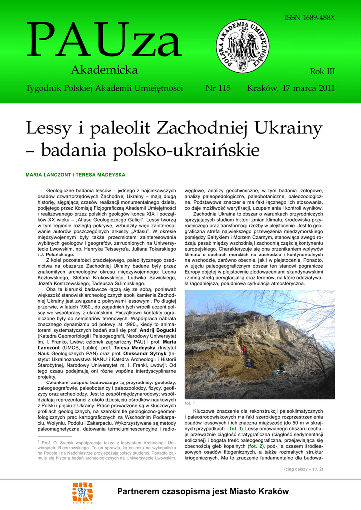 PAUza ISSN 1689-488X Akademicka Rok III Nr 115 Tygodnik Polskiej Akademii Umiejętności Kraków, 17 marca 2011 Lessy i paleolit Zachodniej Ukrainy – badania polsko-ukraińskie Maria Łanczont i Teresa Madeyska Geologiczne badania lessów – jednego z najciekawszych osadów czwartorzędowych Zachodniej Ukrainy – mają długą historię, sięgającą czasów realizacji monumentalnego dzieła, podjętego przez Komisję Fizjograficzną Akademii Umiejętności i realizowanego przez polskich geologów końca XIX i początków XX wieku – „Atlasu Geologicznego Galicji”. Lessy tworzą w tym regionie rozległą pokrywę, wzbudziły więc zainteresowanie autorów poszczególnych arkuszy „Atlasu”. W okresie międzywojennym były także przedmiotem zainteresowania wybitnych geologów i geografów, zatrudnionych na Uniwersytecie Lwowskim, np. Henryka Teisseyre’a, Juliana Tokarskiego i J. Polańskiego. Z kolei pozostałości pradziejowego, paleolitycznego osadnictwa na obszarze Zachodniej Ukrainy badane były przez znakomitych archeologów okresu międzywojennego: Leona Kozłowskiego, Stefana Krukowskiego, Ludwika Sawickiego, Józefa Kostrzewskiego, Tadeusza Sulimirskiego. Oba te kierunki badawcze łączą się ze sobą, ponieważ większość stanowisk archeologicznych epoki kamienia Zachodniej Ukrainy jest związana z pokrywami lessowymi. Po długiej przerwie, w latach 1980., do zagadnień tych wrócili uczeni polscy we współpracy z ukraińskimi. Początkowo kontakty ograniczone były do seminariów terenowych. Współpraca nabrała znacznego dynamizmu od połowy lat 1990., kiedy to animatorami systematycznych badań stali się prof. Andrij Bogucki (Katedra Geomorfologii i Paleogeografii, Narodowy Uniwersytet im. I. Franko, Lwów; członek zagraniczny PAU) i prof. Maria Łanczont (UMCS, Lublin), prof. Teresa Madeyska (Instytut Nauk Geologicznych PAN) oraz prof. Oleksandr Sytnyk (Instytut Ukrainoznawstwa NANU i Katedra Archeologii i Historii Starożytnej, Narodowy Uniwersytet im. I. Franki, Lwów)1. Od tego czasu podejmują oni różne wspólne interdyscyplinarne projekty. Członkami zespołu badawczego są przyrodnicy: geolodzy, paleogeografowie, paleobotanicy i paleozoolodzy, fizycy, geofizycy oraz archeolodzy. Jest to zespół międzynarodowy; współdziałają reprezentanci z około dziesięciu ośrodków naukowych z Polski i pięciu z Ukrainy. Prace prowadzone są w kluczowych profilach geologicznych, na szerokim tle geologiczno-geomorfologicznych prac kartograficznych na Wschodnim Podkarpaciu, Wołyniu, Podolu i Zakarpaciu. Wykorzystywane są metody paleomagnetyczne, datowania termoluminescencyjne i radio1 Prof. O. Sytnyk współpracuje także z Instytutem Archeologii Uniwersytetu Rzeszowskiego. To on sprawia, że co roku na wykopaliska na Podole i na Naddniestrze przyjeżdżają polscy studenci. Ponadto zajmuje się historią badań archeologicznych na Uniwersytecie Lwowskim. węglowe, analizy geochemiczne, w tym badania izotopowe, analizy paleopedologiczne, paleobotaniczne, paleozoologiczne. Podstawowe znaczenie ma fakt łącznego ich stosowania, co daje możliwość weryfikacji, uzupełniania i kontroli wyników. Zachodnia Ukraina to obszar o warunkach przyrodniczych sprzyjających studiom historii zmian klimatu, środowiska przyrodniczego oraz transformacji rzeźby w plejstocenie. Jest to geograficzna strefa największego przewężenia międzymorskiego pomiędzy Bałtykiem i Morzem Czarnym, stanowiąca swego rodzaju pasaż między wschodnią i zachodnią częścią kontynentu europejskiego. Charakteryzuje się ona przenikaniem wpływów klimatu o cechach morskich na zachodzie i kontynentalnych na wschodzie, zarówno obecnie, jak i w plejstocenie. Ponadto, w ujęciu paleogeograficznym obszar ten stanowi pogranicze Europy objętej w plejstocenie zlodowaceniami skandynawskimi i zimną strefą peryglacjalną oraz terenów, na które oddziaływała łagodniejsza, południowa cyrkulacja atmosferyczna. fot. 1 Kluczowe znaczenie dla rekonstrukcji paleoklimatycznych i paleośrodowiskowych ma fakt szerokiego rozprzestrzenienia osadów lessowych i ich znaczna miąższość (do 50 m w skrajnych przypadkach – fot. 1). Lessy omawianego obszaru cechuje przeważnie ciągłość stratygraficzna (ciągłość sedymentacji eolicznej) i bogata treść paleogeograficzna, przejawiająca się obecnością gleb kopalnych (fot. 2), pod-, a czasem śródlessowych osadów fitogenicznych, a także rozmaitych struktur kriogenicznych. Ma to znaczenie fundamentalne dla budowa(ciąg dalszy – str. 2) Partnerem czasopisma jest Miasto Kraków Str. 2 PAUza Akademicka Nr 115, 17 marca 2011 Lessy i paleolit Zachodniej Ukrainy (ciąg dalszy ze str. 1) fot. 2 nia opartej na sekwencji zmian klimatycznych stratygrafii lessów i dalej plejstocenu na Ukrainie, dając doskonałe podstawy do korelacji chronostratygraficznej w skalach ponadregionalnej i kontynentalnej. Badania lessów prowadzone są w kilku obszarach problemowych. Dwa najważniejsze z nich to odtworzenie długiej sekwencji osadów lessowych, powstałych w okresach panowania klimatu zimnego i suchego, rozdzielonych glebami kopalnymi, genetycznie związanymi z warunkami mniej lub bardziej ciepłymi i wilgotnymi. Drugim problemem jest rozwój osadnictwa pradziejowego w nawiązaniu do zmian klimatu i środowiska przyrodniczego. Przebadano dziesiątki odsłonięć lessowych, w których widoczne są sekwencje lessowo-glebowe z glebami odpowiadającymi co najmniej ośmiu okresom ociepleń interglacjalnej rangi (w tym starszych od chronostratygraficznej granicy epok paleomagnetycznych Matuyama/Brunhes, wyznaczonej zmianą polarności Ziemi – 778 000 lat temu), ale także jedne z najstarszych, jeśli nie najstarsze w Europie Środkowej, zespoły struktur peryglacjalnych. Granica M/B została zidentyfikowana w profilach Zahvizdja (Zagwóźdź), Skała Podolska, Korolewo. Poszczególne gleby kopalne różnią się stopniem rozwoju, przy czym większość z