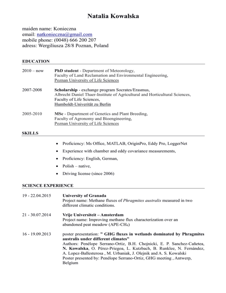 Natalia Kowalska maiden name: Konieczna email: [email protected] mobile phone: (0048) 666 200 207 adress: Wergiliusza 28/8 Poznan, Poland EDUCATION 2010 – now PhD student - Department of Meteorology, Faculty of Land Reclamation and Environmental Engineering, Poznan University of Life Sciences 2007-2008 Scholarship - exchange program Socrates/Erasmus, Albrecht Daniel Thaer-Institute of Agricultural and Horticultural Sciences, Faculty of Life Sciences, Humboldt-Univerität zu Berlin 2005-2010 MSc - Department of Genetics and Plant Breeding, Faculty of Agronomy and Bioengineering, Poznan University of Life Sciences SKILLS Proficiency: Ms Office, MATLAB, OriginPro, Eddy Pro, LoggerNet Experience with chamber and eddy covariance measurements, Proficiency: English, German, Polish – native, Driving license (since 2006) SCIENCE EXPERIENCE 19 - 22.04.2015 University of Granada Project name: Methane fluxes of Phragmites australis measured in two different climatic conditions. 21 - 30.07.2014 Vrije Universiteit – Amsterdam Project name: Improving methane flux characterization over an abandoned peat meadow (APE-CH4) 16 - 19.09.2013 poster presentation: ” GHG fluxes in wetlands dominated by Phragmites australis under different climates” Authors: Penélope Serrano-Ortiz, B.H. Chojnicki, E. P. Sanchez-Cañetea, N. Kowalska, O. Pérez-Priegoa, L. Kutzbach, B. Runklee, N. Fernández, A. Lopez-Ballesterosa , M. Urbaniak, J. Olejnik and A. S. Kowalski Poster presented by: Penélope Serrano-Ortiz, GHG meeting , Antwerp, Belgium 05-12.05.2013 participation in Summer School „Flux measurement techniques for non CO2 GHG: methods, sensors, databases and modeling”, Mierzęcin, Poland 21-25.04.2013 poster presentation „Measurements of methane emission from a temperate peatland by eddy covariance method” Authors: N.Kowalska, B.H. Chojnicki, J.Rinne, M. Urbaniak, R.Juszczak, J. Olejnik Poster presented by: Natalia Kowalska, international workshops “AWARE: Approaches in WetlAnd Restoration - focus on fen landscapes International Workshop Warsaw- Biebrza”, Warsaw, Poland 02 - 07.09.2012 participation in a conference „The importance of land – atmosphere fluxes of methane (CH4) and nitrous oxide (N2O) for the global greenhouse-gas balance”, Hyytiälä, Finland 24 - 26.10.2011 participation in the international conference „GEO-Carbon Conference: Carbon in a changing world”, FAO Rome, Italy 16.10 - 10.12.2011 scholarship at University of Tuscia, in Viterbo, work on international database, part II, „BADM - Biology Ancillary Disturbance Metadata Development” 11 - 20.09.2011 participation in the Summer School „Flux measurement techniques: methods, sensors, databases and modeling” COST Action ES0804 (ABBA), Tuczno, Poland 07 - 10.09.2011 poster presentation: „Evaluation of net photosynthesis of selected vascular plant species on the peatland in Rzecin" Authors: Natalia Kowalska, Bogdan Chojnicki, Dietmar Lüttschwager, Janusz Olejnik Poster presented by: Natalia Kowalska, Congress of Climatologists and Agrometeorologists, Poland, Wroclaw 09.05 – 11.05.2011 ordered presentation in the role of External expert „BADM Biological Ancillary Disturbance Metadata”, Todi, Italy 31.03 - 01.04.2011 course of writing publications in Braunschweig (Germany), led by Dr Annette Freibauer, 27.03 - 01.04.2011 poster presentation „Seasonal Net Ecosystem Production (NEP) and biomass runs of sedge community at wetland in Rzecin", Authors: Natalia Kowalska, Bogdan Chojnicki, Maria Michalak, Radosław Juszczak, Janusz Olejnik, Poster presented by: Natalia Kowalska, meeting of project participants GHG: „Peatland synthesis” in Braunschweig, Germany 17.01 - 20.01.2011 participation in a scientific meeting: „Enlarging and Connecting the European Spectral Network” ,Hyytiälä, Finland 04. 10 - 30. 11. 2010 scholarship at University of Tuscia, in Viterbo, work on international database, part I, „BADM - Biology Ancillary Disturbance Metadata Development” 2011 - 2013 classes with students at the Poznan University of Life Sciences, SCIENTIFIC PUBLICATIONS „Sedge community (Caricetum elatae) seasonal above ground biomass and carbon dioxide exchange runs at Rzecin wetland” Bogdan H. Chojnicki, Maria Michalak, Natalia Konieczna, Janusz Olejnik, Polish Journal of Environmental Study,Vol.21, No(3) 2012, 579-587, 2012 „Measurements of methane emission from a temperate wetland by eddy covariance method” Natalia Kowalska, Bogdan H. Chojnicki, Janne Rinne, Sami Haapanala, Paweł Siedlecki, Marek Urbaniak, RadosławJuszczak, Janusz Olejnik, International Agrophysics 27, 283-290, 2013 „Emission and absorption of methane on the peatland” - „Emisja i pochłanianie metanu na torfowiskach”, Natalia Konieczna, Bogdan H. Chojnicki Creative Time "Młodzi naukowcy dla polskiej nauki", part V, Vol. II, chapter in monograph, 2012 „Attempt to assess the productivity of the ecosystem in the field of Wielkopolska” - „Próba oceny produktywności ekosystemu w warunkach polowych Wielkopolski”, Natalia Kowalska, Bogdan H. Chojnicki, Damian Józefczyk, Marek Urbaniak, Radosław Juszczak, Janusz Olejnik, Annual Set The Environment Protection (Roczniki Ochrony Środowiska), Vol.15,part 3, 2481-2495, 2013 ACHIEVEMENTS ordered presentation in the role of External expert „BADM Biological Ancillary Disturbance Metadata”, Todi, Italy. scholarship COST STSM ESO804-9079, 04.10 - 30.11.2010, receiving a grant University „Grant for the development of young scientists in 2012", scholarship COST STSM ESO804-907, 16.10 - 10.12.2011, receiving a scholarship in the Meteorology Department at Poznan University of Life Sciences,2011, 2012, 2013, 2014 receiving of a grant pro-quality scholarship for the academic year 2012/2013