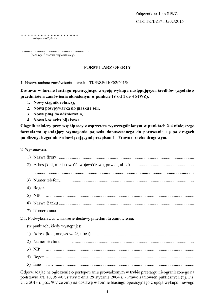 Załącznik nr 1 do SIWZ znak: TK/BZP/110/02/2015 …………………………………. (miejscowość, dnia) ............................................................... (pieczęć firmowa wykonawcy) FORMULARZ OFERTY 1. Nazwa nadana zamówieniu – znak – TK/BZP/110/02/2015: Dostawa w formie leasingu operacyjnego z opcją wykupu następujących środków (zgodnie z przedmiotem zamówienia określonym w punkcie IV od 1 do 4 SIWZ): 1. Nowy ciągnik rolniczy, 2. Nowa posypywarka do piasku i soli, 3. Nowy pług do odśnieżania, 4. Nowa kosiarka bijakowa Ciągnik rolniczy przy współpracy z osprzętem wyszczególnionym w punktach 2-4 niniejszego formularza spełniający wymagania pojazdu dopuszczonego do poruszania się po drogach publicznych zgodnie z obowiązującymi przepisami – Prawo o ruchu drogowym. 2. Wykonawca: 1) Nazwa firmy ............................................................................................................................. 2) Adres (kod, miejscowość, województwo, powiat, ulica) ...................................................... .................................................................................................................................................... 3) Numer telefonu ................................................................................................................. 4) Regon ......................................................................................................................................... 5) NIP ......................................................................................................................................... 6) Nazwa Banku ............................................................................................................................. 7) Numer konta ............................................................................................................................. 2.1. Podwykonawca w zakresie dostawy przedmiotu zamówienia: (w punktach, kiedy występuje): 1) Adres (kod, miejscowość, ulica) 2) Numer telefonu 3) NIP ......................................................................................... …............................................................................................................. ......................................................................................................................................... 4) Regon ......................................................................................................................................... 5) Inne ……................................................................................................................................. Odpowiadając na ogłoszenie o postępowaniu prowadzonym w trybie przetargu nieograniczonego na podstawie art. 10, 39-46 ustawy z dnia 29 stycznia 2004 r. - Prawo zamówień publicznych (t.j. Dz. U. z 2013 r. poz. 907 ze zm.) na dostawę w formie leasingu operacyjnego z opcją wykupu, nowego 1 ciągnika rolniczego i osprzętu wyszczególnionych w punktach 3, 4, 5 i 6 niniejszego formularza ofertowego, zgodnie z warunkami określonymi w Specyfikacji Istotnych Warunków Zamówienia, składamy niniejszą ofertę: 3. Oferuję/emy dostawę nowego ciągnika rolniczego: marka ciągnika rolniczego ................................................................................................................. typ .............................. rocznik ........................... przebieg ....................................... mth/km Numer rejestracyjny .................................... Numer VIN: .................................za cenę:.................. cena netto ………………………………..zł, (słownie: …………………………………………………………………………...………. zł) podatek VAT: …............ % ………………zł, (słownie: …………………………………………………………………………………… zł) cena brutto ………………………………..zł, (słownie: …………………………………………………………………………………… zł) Rodzaj opłaty Kaucja gwarancyjna Wstępna rata leasingowa Pozostałe równe raty leasingowe Wartość końcowa (wykup) 1 Opłata W% 15% 0 0% Liczba opłat Kwota netto VAT Kwota brutto 47 1 6% 4. Oferuję/emy dostawę nowej posypywarki do piasku i soli: marka posypywarki …. ............................................................................................................... typ ......................... rocznik .................... Numer fabryczny: ............................. za cenę:................. cena netto ………………………………..zł, (słownie: …………………………………………………………………………...………. zł) podatek VAT: …............ % ………………zł, (słownie: …………………………………………………………………………………… zł) cena brutto ………………………………..zł, (słownie: …………………………………………………………………………………… zł) Rodzaj opłaty Kaucja gwarancyjna Wstępna rata leasingowa Pozostałe równe raty leasingowe Wartość końcowa (wykup) 1 Opłata W% 15% 0 0% Liczba opłat Kwota netto 47 1 6% 2 VAT Kwota brutto 5. Oferuję/emy dostawę nowego pługa do odśnieżania dróg: marka pługa …..................................................................................................................................... typ .................................... rocznik................................ Numer VIN: ....................................... za cenę:.................. cena netto ………………………………..zł, (słownie: …………………………………………………………………………...………. zł) podatek VAT: …............ % 