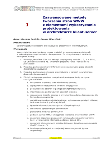 Ośrodek Edukacji Informatycznej i Zastosowań Komputerów 02-026 Warszawa, ul. Raszyńska 8/10, tel. (0-22) 5794100, fax (0-22) 5794170 I Zaawansowane metody tworzenia stron WWW z elementami wykorzystania projektowania w architekturze klient-server Autor: Dariusz Fabicki, Janusz Wierzbicki Przeznaczenie Szkolenie jest przeznaczone dla nauczyciela przedmiotów informatycznych. Wymagania Nauczyciele kierowani na kursy muszą posiadać już ugruntowane umiejętności w zakresie pierwszego kontaktu z komputerem. Za przygotowanych uważa się nauczycieli, którzy: 1. Posiadają certyfikat ECDL lub zaliczyli przynajmniej moduły 1, 2, 3, 4 ECDL, lub ukończyli szkolenia np. w ramach programu "Intel -Nauczanie ku przyszłości". 2. Posiadają podstawowe kursy informatyczne organizowane przez placówki doskonalenia nauczycieli. 3. Posiadają podstawowe szkolenia informatyczne w ramach wewnętrznego doskonalenia nauczycieli, 4. Zdobyli następujące poniższe umiejętności posługiwania się sprzętem i oprogramowaniem: a. korzystania z aplikacji oraz wbudowanej pomocy, b. zapisywania i odczytywanie wyników swojej pracy, c. porządkowania zbiorów w pamięci zewnętrznej komputera, d. modyfikowania podstawowych ustawień systemu, e. redagowania tekstów zgodnie z przyjętymi zasadami, dostosowując ich formę do przeznaczenia, f. projektowania arkusza kalkulacyjnego, wykonywanie prostych obliczeń, tworzenie ilustracji graficznej danych, g. łączenia informacji pochodzących z różnych aplikacji, h. drukowania opracowanych dokumentów i. przesyłania plików za pomocą FTP. j. podstaw języka HTML i umiejętność tworzenia prostych stron WWW. k. znajomość zagadnień związanych z obsługą baz danych: tworzenie bazy, wyszukiwanie informacji, podstawy języka SQL. l. znajomość elementarnych podstaw jednego z języków programowania (BASIC, Pascal, C). m. bardzo przydatna jest przynajmniej bierna znajomość języka angielskiego. Wydanie 1 Formularz F509 Strona 1/4 Ośrodek Edukacji Informatycznej i Zastosowań Komputerów 02-026 Warszawa, ul. Raszyńska 8/10, tel. (0-22) 5794100, fax (0-22) 5794170 Cele Przygotowanie nauczycieli informatyki do zawansowanego projektowania szkolnych serwisów WWW Treści kształcenia 1. Prawa autorskie w witrynach internetowych 2. Zaawansowane możliwości języka HTML 3. Możliwości języka XHTML 4. Kaskadowe arkusze stylów (CSS) 5. Projektowanie strony z wykorzystaniem tabel 6. Wykorzystanie języka XML i arkuszy stylów CSS w tworzeniu zaawansowanych stron 7. Zastosowanie elementów języka DHTML na stronie - JavaScript 8. Elementy programowania po stronie serwera - PHP, ASP, ASP.NET, JSP, Perl 9. Elementy dostępu do baz danych z wybranej technologii 10. Animacje na stronach 11. Graficzny sposób tworzenia stron WWW 12. Wykorzystywanie systemów CMS w budowaniu szkolnych witryn internetowych Osiągnięcia Po zakończeniu kształcenia uczestnik kursu będzie przygotowany do: 1. Wykorzystania zaawansowanych możliwości języka HTML 2. Tworzenia stron dla dowolnej platformy: PC, Macintosh, Linux, PocketPC, SmartPhones, Palm itd. 3. Wykorzystania języka XML do tworzenia stron o bogatej treści. 4. Wykorzystania możliwości kaskadowych arkuszy stylów (CSS) na stronach internetowych i do zarządzania ich treścią. 5. Programowania obsługi formularzy po stronie serwera w wybranej technologii. 6. Tworzenia stron o bogatej szacie graficznej z wykorzystaniem animacji i tabel. 7. Publikowania stron WWW w Internecie. Metody nauczania Wykład. Forma wykładu jest stosowana w celu przedstawienia i omówienia określonych zagadnień, pojęć i problemów, z którymi trzeba zapoznać słuchacza Prezentacja. Część wykładu przyjmuje formę prezentacji, słuchacze zapoznają się z przykładowymi rozwiązaniami, które mogą później wykorzystać w swojej pracy. Praca indywidualna słuchacza – ćwiczenia. Jedną z głównych form pracy na szkoleniu jest indywidualna praca słuchacza. Jest ona stosowana w celu ćwiczenia różnych zadań związanych z przedstawianą problematyką Dyskusja. Podczas szkolenia prowadzone są dyskusje, mające na celu wymianę poglądów i doświadczeń słuchaczy oraz prowadzącego. Wydanie 1 Formularz F509 Strona 2/4 Ośrodek Edukacji Informatycznej i Zastosowań Komputerów 02-026 Warszawa, ul. Raszyńska 8/10, tel. (0-22) 5794100, fax (0-22) 5794170 Charakterystyka materiałów Przed szkoleniem uczestnicy otrzymują: • Program szkolenia. W czasie szkolenia uczestnicy otrzymują: • Skrypt opracowanych przez autorów szkolenia, obejmujący opis i ćwiczenia praktyczne dotyczące wszystkich omawianych na szkoleniu zagadnień. • Dostęp do strony internetowej, gdzie opublikowane zostały wszystkie materiały wykorzystywane w czasie szkolenia w formie elektronicznej Po szkoleniu uczestnicy otrzymują: • Wskazówki dotyczące doskonalenia opanowanych w czasie szkolenia umiejętności. • Informator o innych szkoleniach prowadzonych przez Ośrodek. Ewaluacja i formy oceny pracy uczestników Ewaluacja będzie przeprowadzana na bieżąco poprzez dyskusję ze słuchaczami. W trakcie trwania szkolenia będą oceniane postępy uczestników. Rozmowy z uczestnikami przeprowadzane podczas każdej sesji będą wpływały na dobór ćwiczeń. Przewidywana jest również ankieta dla oceny całego szkolenia, która będzie wypełniana przez słuchaczy po jego zakończeniu. Informacje o organizacji Szkolenie obejmuje 40 godzin zajęć w trakcie 5 dni (lub osiem spotkań po 5 godzin każde). Zajęcia prowadzone są w grupach maksymalnie 16 osobowych w układzie jeden słuchacz przy komputerze Każdy słuchacz ma do dyspozycji komputer wyposażony w odpowiednie oprogramowanie i zasoby. W trakcie szkolenia wykorzystywane będzie następujące licencjonowane oprogramowanie: • System operacyjny Windows XP/Vista Business (edycja MEN, Lato 2007), • Pakiet MS Office 2003/2007, • inne oprogramowanie w razie potrzeby. Literatura • http: