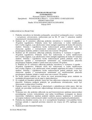 PROGRAM PRAKTYKI ZAWODOWEJ Kierunek studiów: PEDAGOGIKA Specjalność: PEDAGOGIKA PRACY – COACHING I ZARZĄDZANIE SEKRETARIATEM Studia: STACJONARNE/NIESTACJONARNE Edycja 2014 I.ORGANIZACJA PRAKTYKI 1. Praktyka zawodowa na kierunku pedagogika, specjalność pedagogika pracy- coaching i zarządzanie sekretariatem, realizowana jest na III, IV oraz V semestrze studiów stacjonarnych i niestacjonarnych. 2. Studenci po II semestrze odbywają praktykę zawodową w wymiarze 4 tygodni – 30 godzin tygodniowo. Praktyka może być realizowana w trybie śródrocznym lub w trybie ciągłym, a jej zakończenie winno nastąpić najpóźniej do końca III semestru studiów. Dzienna i tygodniowa liczba realizowanych godzin praktyki może być elastyczna zgodnie z wewnętrznymi ustaleniami czy możliwościami placówki przyjmującej studenta, jednak w sumie musi ona wynosić 120 godzin. 3. Studenci po III semestrze odbywają praktykę zawodową w wymiarze 4 tygodni – 30 godzin tygodniowo. Praktyka może być realizowana w trybie śródrocznym lub w trybie ciągłym, a jej zakończenie winno nastąpić najpóźniej do końca IV semestru studiów. Dzienna i tygodniowa liczba realizowanych godzin praktyki może być elastyczna zgodnie z wewnętrznymi ustaleniami czy możliwościami placówki przyjmującej studenta, jednak w sumie musi ona wynosić 120 godzin. 4. Studenci po IV semestrze odbywają praktykę zawodową w wymiarze 4 tygodni – 30 godzin tygodniowo. Praktyka może być realizowana w trybie śródrocznym lub w trybie ciągłym, a jej zakończenie winno nastąpić najpóźniej do końca V semestru studiów. Dzienna i tygodniowa liczba realizowanych godzin praktyki może być elastyczna zgodnie z wewnętrznymi ustaleniami czy możliwościami placówki przyjmującej studenta, jednak w sumie musi ona wynosić 120 godzin. 4. Do liczby godzin praktyki nie wlicza się czasu przeznaczonego przez studenta na niezbędne przygotowanie się do zajęć w danej placówce. 5. Ze względu na charakter praktyki, może być ona odbywana wyłącznie na terenie jednej placówki. Podstawą podjęcia praktyki, po przedłożeniu oświadczenia, może być skierowanie wydane przez Uczelnię. 6. Praktyka może być realizowana w placówkach o całodobowym trybie pracy, fakt ten jednak nie powoduje możliwości odpowiedniego skrócenia planowego wymiaru czasu praktyki. 7. Wskazane jest, aby praktyka odbywała się pod kierownictwem opiekuna (pracownika) posiadającego wyższe wykształcenie oraz pełne kwalifikacje wymagane na danym stanowisku. Zakładowy opiekun praktyki udziela pomocy studentom w zależności od stopnia trudności realizowanych zadań i możliwości poszczególnych praktykantów. 8. Praktyka ma charakter czynny, tzn. że w szczególności hospitacje i tym podobne formy biernego udziału w zajęciach powinny stanowić nie więcej niż 25% ogólnego czasu praktyki. 9. Student prowadzi Dziennik Praktyki. II.CELE PRAKTYKI 1. Zapoznanie się ze specyfiką placówki i jej funkcjonowaniem w aspekcie formalnoprawnym i merytorycznym. 2. Wchodzenie w role zawodowe w organizacjach tworzących potencjalny teren aktywności zawodowej absolwenta studiów. 3. Nabywanie kompetencji do pełnienia kierowniczych funkcji w sekretariatach dużych firm. Nabywanie wiedzy o warsztacie pracy na określonych stanowiskach, poprzez: ćwiczenie umiejętności dokonywania trafnych obserwacji, opanowywanie umiejętności przygotowywania materiałów do pracy , znajomość koncepcji, związanych z pedagogiką pracy, ćwiczenie umiejętności korzystania z dostępnych źródeł informacji i narzędzi, wykonywanie takich samych zadań, jakie wykonują osoby zatrudnione w danym miejscu, dokonywanie szczegółowej analizy typowych problemów z obszaru działania danej placówki (np. organizacyjnego) i usprawnianie procesu pracy. 4. Zdobycie praktycznych umiejętności związanych z zagadnieniem Pedagogiki, specjalności: pedagogika pracy – coaching i zarządzanie sekretariatem: umiejętność planowania pracy własnej oraz podwładnych i jej efektów umiejętność analizowania pracy własnej i podwładnych i jej efektów umiejętność przeprowadzania rozmów, mediacji i prezentacji własnej sylwetki i sylwetki firmy w kontaktach zewnętrznych przy zachowaniu zasad savoir vivre i umiejętnym posługiwaniu się językiem specjalistycznym rozwijanie umiejtności do prowadzenia: Coachingu personalnego i Life coachingu nastawionego na relacje i życie osobiste; Coachingu biznesowego 5. Przygotowanie do samodzielnego zdobywania i doskonalenia wiedzy oraz umiejętności profesjonalnych i badawczych. 6. Aktywny udział w bieżących, ważnych z punktu widzenia funkcjonowania placówki, wydarzeniach, w szczególności takich jak kursy, szkolenia, konferencje, narady, wyjazdy. III. I. SPOTKANIA ŚRODOWISKOWE 1. Studenci zobowiązani są w czasie praktyki do przeprowadzenia minimum jednego spotkania środowiskowego w semestrze, promującego problematykę adekwatną do studiowanej specjalności 2. Student organizuje spotkanie środowiskowe w miejscu gdzie realizuje praktykę. 3. Za przeprowadzenie jednego spotkania studentowi zalicza się 10 godzin praktyki. 4. Student prowadzi spotkanie na podstawie uprzednio uprzednio przygotowanego konspektu 5. Spotkanie wpisuje się do dziennika praktyk, z zaznaczeniem miejsca, czasu, ilości uczestników 6. Konspekt i wpis w dzienniku praktyk wymaga potwierdzenia pieczęcią i podpisem przez kompetentnego przedstawiciela współorganizatora ze strony uczestników spotkania. 7. Niniejsze ustalenia nie dotyczą studentów zwolnionych z obowiązku odbywania praktyki IV.MIEJSCE ODBYWANIA PRAKTYKI 1. Publiczne placówki administracji samorządowej i rządowej 2. Działy personalne firm 4. Firmy doradcze 5.Instytucje szkoleniowe V.ZADANIA PRAKTYKANTA 1. Przeprowadzenie rozmowy ze specjalistą ds. praktyk i wspólne ustalenie planu praktyki (zadania do wykonania, metody realizacji, terminarz, uwagi). 2. Zapozn