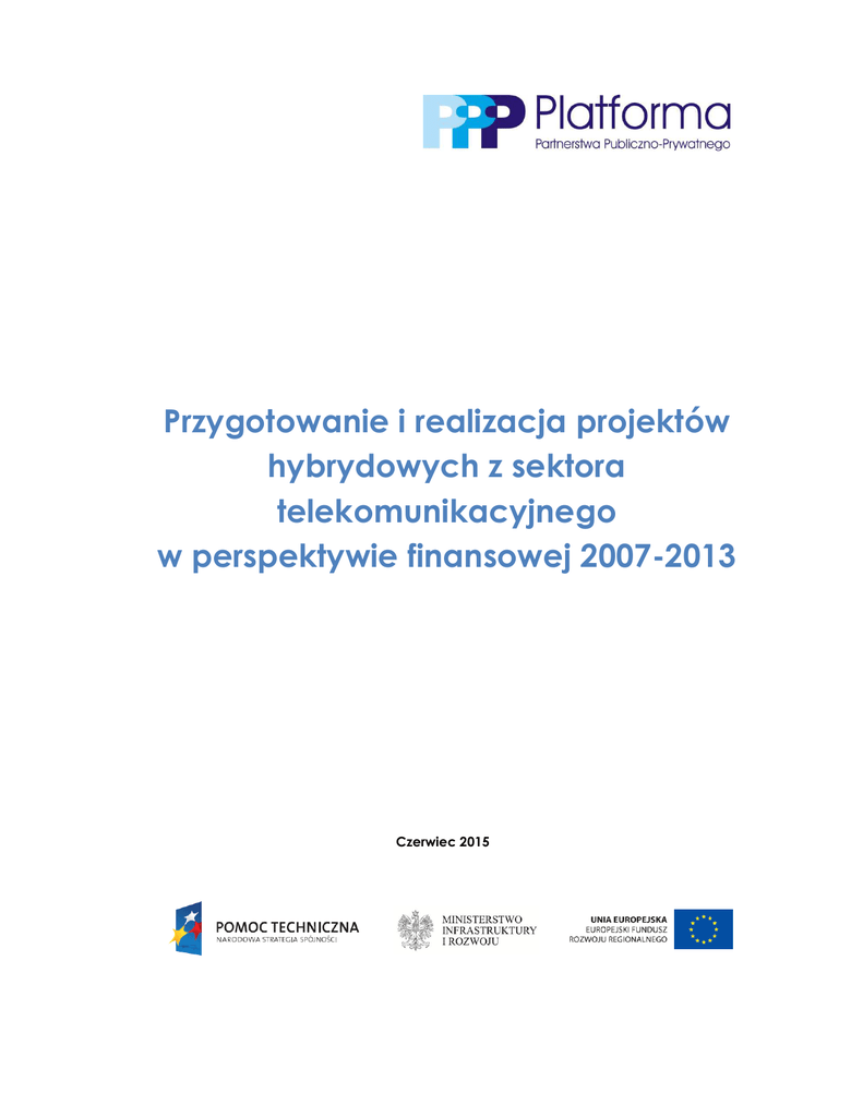 Przygotowanie i realizacja projektów hybrydowych z sektora telekomunikacyjnego w perspektywie finansowej 2007-2013 Czerwiec 2015 Warunki korzystania z niniejszej publikacji Niniejsza publikacja została opracowana w celu wzbogacenia i pobudzenia dyskusji na temat partnerstwa publiczno–prywatnego (ppp), także w celu propagowania dobrych praktyk w tej dziedzinie. Jest ona wynikiem prac Platformy Partnerstwa Publiczno–Prywatnego powołanej w 2011 r. z inicjatywy ówczesnego Ministra Rozwoju Regionalnego. Obserwacje, analizy, interpretacje i wnioski zawarte w przedmiotowym materiale nie stanowią oficjalnego stanowiska Ministerstwa Infrastruktury i Rozwoju (MIiR) i nie mogą stanowić podstawy do formułowania jakichkolwiek roszczeń. Ponadto, MIiR nie odpowiada za błędne interpretacje treści publikacji, ani za następstwa czynności podjętych na ich podstawie. W związku z tym użytkownik korzystający z informacji zawartych w niniejszej publikacji czyni to na swoją wyłączną odpowiedzialność. Ministerstwo Infrastruktury i Rozwoju upoważnia odbiorców niniejszej publikacji do jej użytkowania, pobierania, wyświetlania, kopiowania i rozpowszechniania, w całości lub w części, ze wskazaniem źródła pochodzenia cytowanych materiałów. Bezwzględnie zabronione jest wykorzystywanie niniejszego dokumentu i jego treści do celów komercyjnych. Dokument może zawierać odesłania do serwisów internetowych podmiotów trzecich. MIiR nie ponosi odpowiedzialności za takie serwisy, a korzystanie z nich może podlegać szczegółowym warunkom. Publikacja powstała w Departamencie Wsparcia Projektów Partnerstwa Publiczno– Prywatnego. Przygotował: Michał Macura pod kierunkiem Marcina Jędrasika i Roberta Kałuży. 2 Spis treści Wprowadzenie .............................................................................................................................. 4 1. Opis zidentyfikowanych projektów hybrydowych ......................................................... 7 2. Harmonogramy realizacji wybranych projektów ........................................................... 9 3. Przygotowanie projektów hybrydowych ........................................................................ 10 3.1 Wykorzystanie spółki celowej (SPV) ............................................................................ 10 3.2 Dofinansowanie z funduszy europejskich .................................................................. 12 3.3 Wydanie decyzji KE notyfikującej pomoc publiczną .............................................. 12 3.4 Wydanie decyzji KE dla dużego projektu .................................................................. 14 4. Tryb i kryteria wyboru partnera prywatnego ................................................................. 16 5. Analiza wybranych umów ppp ........................................................................................ 18 6. Opis występujących modeli finansowania inwestycji ................................................. 23 Podsumowanie i wnioski ............................................................................................................ 25 Lista fiszek projektów .................................................................................................................. 26 Materiały źródłowe .................................................................................................................... 37 3 Wprowadzenie Materiał stanowi analizę i opis projektów szerokopasmowych, których liczba w perspektywie finansowej 2007-2013 była najwyższa i stanowiła 62% wszystkich projektów hybrydowych. Projekt hybrydowy oznacza projekt realizowany w formule partnerstwa publiczno-prywatnego, w którym wykorzystane zostały środki unijne. Środki funduszy strukturalnych i Funduszu Spójności stanowią w takim modelu uzupełnienie finansowania prywatnego. Zgodnie z prowadzoną na stronie www.ppp.gov.pl Bazą Projektów Hybrydowych zidentyfikowano 16 projektów hybrydowych, z czego zdecydowaną większość, bo aż 10 projektów stanowią inwestycje z sektora telekomunikacyjnego. Wartość całkowita tych projektów wynosi 2 855 mln zł, natomiast wartość pozostałych projektów wynosi 1 161 mln zł. Pozostałe projekty realizowane są w ramach następujących sektorów: sport i rekreacja, gospodarka odpadami, rewitalizacja, innowacyjność oraz efektywność energetyczna. Wykres 1,2. Ilość i wartość projektów hybrydowych w podziale na sektory Źródło: Opracowanie własne MIiR Projekty obejmujące budowę sieci szerokopasmowych realizowane są na zagrożonych wykluczeniem cyfrowym terenach województw, zgodnie z zasadą neutralności technologicznej. Powstałe infrastruktury teleinformatyczne mają na celu uzupełnienie istniejących zasobów należących do różnych operatorów, tworząc sieci szkieletowodystrybucyjne. Sieci powstałe w ramach projektów będą otwarte dla wszystkich zainteresowanych przedsiębiorców telekomunikacyjnych dostarczających usługi szerokopasmowe bezpośrednio odbiorcom końcowym, tj. mieszkańcom, firmom i instytucjom w województwach. Według danych na koniec 2011 r. w Polsce możliwość dostępu do internetu miało jedynie 78% ludności, przy czym do internetu o prędkości co najmniej 30 Mbps dostęp miało około 37% ludności, a tylko 1% gospodarstw domowych korzystało z łącza o prędkości co najmniej 100 Mbps. Stacjonarny dostęp do usług szerokopasmowych osiągnął poziom 17,3%, co wciąż jest wynikiem zdecydowanie poniżej średniej UE, która wynosi 27,7%. W Polsce występują nieprawidłowości w funkcjonowaniu rynku, w przypadku świadczenia usług NGA, a na niektórych obszarach również podstawowych usług szerokopasmowych, zatem interwencja państwa jest konieczna, w celu 4 skorygowania zastanej infrastruktury1. W związku z niskim dostępem do internetu szerokopasmowego, koniecznym było podjęcie stosownych działań, m.in. pra