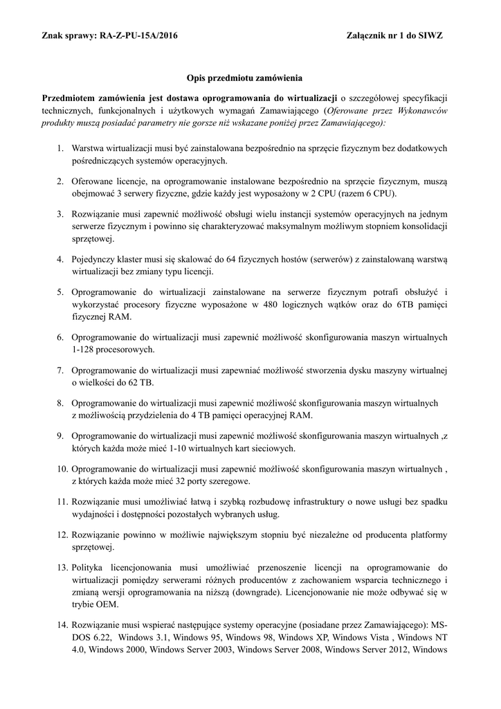 Znak sprawy: RA-Z-PU-15A/2016 Załącznik nr 1 do SIWZ Opis przedmiotu zamówienia Przedmiotem zamówienia jest dostawa oprogramowania do wirtualizacji o szczegółowej specyfikacji technicznych, funkcjonalnych i użytkowych wymagań Zamawiającego (Oferowane przez Wykonawców produkty muszą posiadać parametry nie gorsze niż wskazane poniżej przez Zamawiającego): 1. Warstwa wirtualizacji musi być zainstalowana bezpośrednio na sprzęcie fizycznym bez dodatkowych pośredniczących systemów operacyjnych. 2. Oferowane licencje, na oprogramowanie instalowane bezpośrednio na sprzęcie fizycznym, muszą obejmować 3 serwery fizyczne, gdzie każdy jest wyposażony w 2 CPU (razem 6 CPU). 3. Rozwiązanie musi zapewnić możliwość obsługi wielu instancji systemów operacyjnych na jednym serwerze fizycznym i powinno się charakteryzować maksymalnym możliwym stopniem konsolidacji sprzętowej. 4. Pojedynczy klaster musi się skalować do 64 fizycznych hostów (serwerów) z zainstalowaną warstwą wirtualizacji bez zmiany typu licencji. 5. Oprogramowanie do wirtualizacji zainstalowane na serwerze fizycznym potrafi obsłużyć i wykorzystać procesory fizyczne wyposażone w 480 logicznych wątków oraz do 6TB pamięci fizycznej RAM. 6. Oprogramowanie do wirtualizacji musi zapewnić możliwość skonfigurowania maszyn wirtualnych 1-128 procesorowych. 7. Oprogramowanie do wirtualizacji musi zapewniać możliwość stworzenia dysku maszyny wirtualnej o wielkości do 62 TB. 8. Oprogramowanie do wirtualizacji musi zapewnić możliwość skonfigurowania maszyn wirtualnych z możliwością przydzielenia do 4 TB pamięci operacyjnej RAM. 9. Oprogramowanie do wirtualizacji musi zapewnić możliwość skonfigurowania maszyn wirtualnych ,z których każda może mieć 1-10 wirtualnych kart sieciowych. 10. Oprogramowanie do wirtualizacji musi zapewnić możliwość skonfigurowania maszyn wirtualnych , z których każda może mieć 32 porty szeregowe. 11. Rozwiązanie musi umożliwiać łatwą i szybką rozbudowę infrastruktury o nowe usługi bez spadku wydajności i dostępności pozostałych wybranych usług. 12. Rozwiązanie powinno w możliwie największym stopniu być niezależne od producenta platformy sprzętowej. 13. Polityka licencjonowania musi umożliwiać przenoszenie licencji na oprogramowanie do wirtualizacji pomiędzy serwerami różnych producentów z zachowaniem wsparcia technicznego i zmianą wersji oprogramowania na niższą (downgrade). Licencjonowanie nie może odbywać się w trybie OEM. 14. Rozwiązanie musi wspierać następujące systemy operacyjne (posiadane przez Zamawiającego): MSDOS 6.22, Windows 3.1, Windows 95, Windows 98, Windows XP, Windows Vista , Windows NT 4.0, Windows 2000, Windows Server 2003, Windows Server 2008, Windows Server 2012, Windows Znak sprawy: RA-Z-PU-15A/2016 Załącznik nr 1 do SIWZ 7, Windows 8, SLES 11, SLES 10, SLES 9, SLES 8, RHEL 6, RHEL 5, RHEL 4, RHEL 3, Solaris 11 ,Solaris 10, Solaris 9, Solaris 8, OS/2 Warp 4.0, NetWare 6.5, NetWare 6, NetWare 5, OEL 4, OEL 5, Debian, CentOS, FreeBSD, Asianux, Mandriva, Ubuntu 14, Ubuntu 12, SCO OpenServer, SCO Unixware, Mac OS X. 15. Rozwiązanie musi umożliwiać przydzielenie większej ilości pamięci RAM dla maszyn wirtualnych niż fizyczne zasoby RAM serwera w celu osiągnięcia maksymalnego współczynnika konsolidacji. 16. Rozwiązanie musi umożliwiać udostępnienie maszynie wirtualnej większej ilości zasobów dyskowych niż jest fizycznie zarezerwowane na dyskach lokalnych serwera lub na macierzy. 17. Rozwiązanie powinno posiadać centralną konsolę graficzną do zarządzania maszynami wirtualnymi i do konfigurowania innych funkcjonalności. Centralna konsola graficzna powinna mieć możliwość działania zarówno, jako aplikacja na maszynie fizycznej lub wirtualnej, jak i jako gotowa, wstępnie skonfigurowana maszyna wirtualna tzw. virtual appliance. 18. Rozwiązanie musi zapewnić możliwość bieżącego monitorowania wykorzystania zasobów fizycznych infrastruktury wirtualnej (np. wykorzystanie procesorów, pamięci RAM, wykorzystanie przestrzeni na dyskach/wolumenach) oraz przechowywać i wyświetlać dane maksymalnie sprzed roku. 19. Oprogramowanie do wirtualizacji powinno zapewnić możliwość wykonywania kopii migawkowych instancji systemów operacyjnych (tzw. snapshot) na potrzeby tworzenia kopii zapasowych bez przerywania ich pracy. 20. Oprogramowanie do wirtualizacji musi zapewnić możliwość klonowania systemów operacyjnych wraz z ich pełną konfiguracją i danymi. 21. Oprogramowanie do wirtualizacji oraz oprogramowanie zarządzające musi posiadać możliwość integracji z usługami katalogowymi. 22. Rozwiązanie musi zapewniać mechanizm bezpiecznego uaktualniania warstwy wirtualizacyjnej (hosta, maszyny wirtualnej) bez potrzeby wyłączania wirtualnych maszyn. 23. Rozwiązanie musi zapewnić wbudowany, bezpieczny mechanizm do automatycznego tworzenia kopii zapasowych, odtwarzania wskazanych maszyn wirtualnych. Mechanizm ten musi umożliwiać również odtwarzanie pojedynczych plików z kopii zapasowej oraz zapewnia stosowanie deduplikacji dla kopii zapasowych. Mechanizm zapewnia możliwość wykonywania spójnych kopii zapasowych serwerów aplikacyjnych posiadanych przez Zamawiającego (Microsoft SQL Server, Microsoft Exchange Server, Microsoft SharePoint Server) oraz replikację kopii zapasowych. 24. Rozwiązanie musi zapewniać mechanizm replikacji wskazanych maszyn wirtualnych w obrębie klastra serwerów fizycznych. 25. Rozwiązanie musi mieć możliwość przenoszenia maszyn wirtualnych w czasie ich pracy pomiędzy serwerami fizycznymi. Mechanizm powinien umożliwiać 4 lub więcej takich procesów przenoszenia jednocześnie. 26. Rozwiązanie musi mieć możliwość przenoszenia zwirtualizowanych dysków maszyn wirtualnych w czasie ich pracy pomiędzy fizycznymi zasobami dyskowymi. 27. Musi zostać zapewniona odpowiednia redundancja i taki mechanizm (wysokiej dostęp