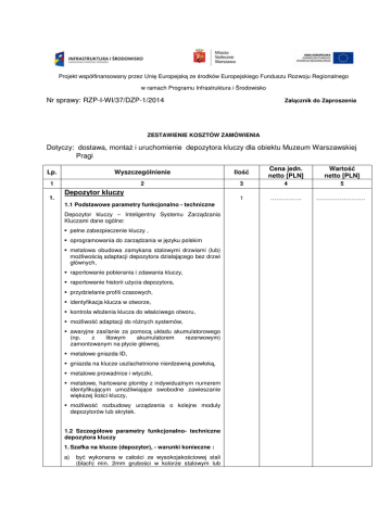 Projekt współfinansowany przez Unię Europejską ze środków Europejskiego Funduszu Rozwoju Regionalnego w ramach Programu Infrastruktura i Środowisko Załącznik do Zaproszenia Nr sprawy: RZP-I-WI/37/DZP-1/2014 ZESTAWIENIE KOSZTÓW ZAMÓWIENIA Dotyczy: dostawa, montaż i uruchomienie depozytora kluczy dla obiektu Muzeum Warszawskiej Pragi Lp. Wyszczególnienie Ilość Cena jedn. netto [PLN] Wartość netto [PLN] 1 2 3 4 5 1 ……………. ……………………. 1. Depozytor kluczy 1.1 Podstawowe parametry funkcjonalno - techniczne Depozytor kluczy – Inteligentny Systemu Zarządzania Kluczami dane ogólne: pełne zabezpieczenie kluczy , oprogramowania do zarządzania w języku polskim metalowa obudowa zamykana stalowymi drzwiami (lub) możliwością adaptacji depozytora działającego bez drzwi głównych, raportowanie pobierania i zdawania kluczy, raportowanie historii użycia depozytora, przydzielanie profili czasowych, identyfikacja klucza w otworze, kontrola włożenia klucza do właściwego otworu, możliwość adaptacji do różnych systemów, awaryjne zasilanie za pomocą układu akumulatorowego (np. z litowym akumulatorem rezerwowym) zamontowanym na płycie głównej, metalowe gniazda ID, gniazda na klucze uszlachetnione nierdzewną powłoką, metalowe prowadnice i wtyczki, metalowe, hartowane plomby z indywidualnym numerem identyfikującym umożliwiające swobodne zawieszanie większej ilości kluczy, możliwość rozbudowy urządzenia o kolejne moduły depozytorów lub skrytek. 1.2 Szczegółowe parametry funkcjonalno- techniczne depozytora kluczy 1. Szafka na klucze (depozytor), - warunki konieczne : a) być wykonana w całości ze wysokojakościowej stali (blach) min. 2mm grubości w kolorze stalowym lub szarym, zintegrowana z urządzeniem sterującym – brak otwartych lub odstających elementów stwarzających zagrożenie, b) posiadać wewnętrzne zawiasy zapewniające dużą odporność na próby włamania, c) posiadać drzwi metalowe z zamkiem i swobodnego otwierania drzwi, d) być wyposażona w jeden niepodzielny, nieprzestany panel na 40 kluczy. e) mieć możliwość rozbudowy systemu o kolejne moduły ( depozytor: 10, 20, 40, 60, 80, 90, 120…. gniazd na moduł) f) posiadać rozstaw gniazd na panelu min.: szer. 5, wys. 8 cm, ułatwiającym swobodne wieszanie kluczy różnych rozmiarów, g) mieć możliwość trwałego dopięcia do uchwytów kluczy, różnego rodzaju kluczy bez względu na ich wielkość i kształt - ilość kluczy zależna od potrzeb użytkownika, h) umożliwiać rozbudowę systemu depozytorów np. o moduły skrytek na klucze dla pomieszczeń podlegających specjalnej ochronie, i) mieć zainstalowany, wyspecyfikowany czytnik kart zbliżeniowych o częstotliwości transmisji 125 KHz j) zapewniać stykową identyfikację klucza w otworze, identyfikacja powinna wskazywać prawidłowość włożonego uchwytu klucza oraz właściwe miejsce jego lokalizacji, k) być wyposażona w metalową niewycierającą się klawiaturę alfanumeryczną i wyświetlacz LED z min. 20 znakami umożliwiający odczyt historii zdarzeń, l) sygnalizować błędne włożenie klucza sygnalizować zmianę miejsca na właściwe, rączką do oraz m) umożliwić wygenerowanie raportów zdarzeń ON-LINE dla administratora i/lub wydruk zdarzeń ON-LINE bezpośrednio na drukarce podłączonej do terminala, n) w przypadku całkowitej awarii zasilania i wyczerpania akumulatorów, umożliwić awaryjne zwolnienie kluczy w sposób mechaniczny za pomocą specjalnego klucza, przez uprawnionego administratora o) posiadać gniazda na 40 kluczy; wymiar zewnętrzny szafy: wys. 100 cm (+/- 20%), szer. 100 cm (+/- 20%), gł. 15-20 cm. Szafa musi być mocowana do ściany w sposób trwały i bezpieczny, bez możliwości ingerencji osób trzecich, p) zasilanie depozytora jednofazowe 230 V 2. Dostęp do kluczy: musi odbywać się jedynie po dokonaniu podwójnej autoryzacji (zasada czterech oczu) tzn. po identyfikacji i uwierzytelnieniu za pomocą kodu PIN i karty zbliżeniowej. 3. Oprogramowanie systemowe – warunki konieczne : a) Język oprogramowania - polski, podpowiadającą lub funkcję administratora(ów) systemu, spełniający rolę „pomoc” dla b) zapewniać zdalne 24 godzinne zarządzanie kluczami, c) umożliwiać import i eksport danych pracowników (id, imię, nazwisko, opis, grupa, kod karty, termin ważności karty) do plików tekstowych, d) zapewniać tworzenie grup pracowników , e) zapewniać przydzielanie uprawnień do kluczy pozwalające konkretnemu użytkownikowi na pobranie przypisanych mu kluczy, w określonym czasie i na określony czas, f) zawierać opcje udostępnienia jednego klucza wielu użytkownikom i wielu kluczy jednemu użytkownikowi, g) zakładać możliwość ograniczenia ilości jednocześnie pobranych kluczy, h) zapewniać możliwość pobrania wszystkich kluczy przy jednorazowym otwarciu szafki za pomocą specjalnego klucza,(ewakuacja), i) zapewniać możliwość pobrania i zwrotu klucza przez dwóch różnych użytkowników , j) elastycznie definiować przedziały czasowe dostępu do szafek dla użytkowników systemu zapewniać monitorowanie pracy szafki na stanowiskach wartowniczych , k) zapewniać gromadzenie (archiwizowanie) wszystkich zdarzeń związanych z działaniem depozytorów, l) uwzględniać przygotowywanie raportów z historii działania depozytora na podstawie opracowanych indywidualnie filtrów. 4. Ponadto system powinien zapewniać: a) podtrzymanie zasilania z akumulatora na min. 12 godzin w przypadku braku zasilania, b) sygnalizację dźwiękową o braku zasilania. c) możliwość zwalniania wszystkich kluczy w sytuacjach kryzysowych i zagrożenia. d) Odczyt czasu zegarze. rzeczywistego na wbudowanym 2 Zapasowe zawieszki (linki) do kluczy 20 …………. ………….. 3 Karty zbliżeniowe do czytnika kart depozytora 50 …………. ….………. …………. …………. ………….. ………….. ………... ……….. RAZEM