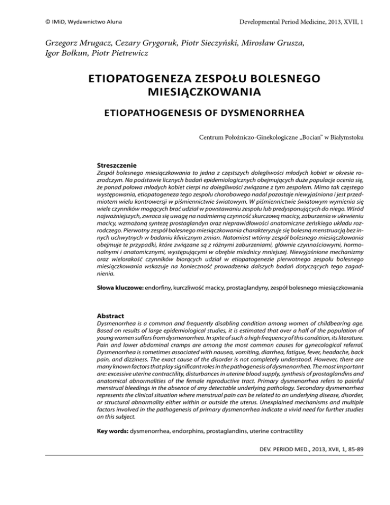 © IMiD, Wydawnictwo Aluna Developmental Period Medicine, 2013, XVII,851 Grzegorz Mrugacz, Cezary Grygoruk, Piotr Sieczyński, Mirosław Grusza, Igor Bołkun, Piotr Pietrewicz ETIOPATOGENEZA ZESPOŁU BOLESNEGO MIESIĄCZKOWANIA ETIOPATHOGENESIS OF DYSMENORRHEA Centrum Położniczo-Ginekologiczne „Bocian” w Białymstoku Streszczenie Zespół bolesnego miesiączkowania to jedna z częstszych dolegliwości młodych kobiet w okresie rozrodczym. Na podstawie licznych badań epidemiologicznych obejmujących duże populacje ocenia się, że ponad połowa młodych kobiet cierpi na dolegliwości związane z tym zespołem. Mimo tak częstego występowania, etiopatogeneza tego zespołu chorobowego nadal pozostaje niewyjaśniona i jest przedmiotem wielu kontrowersji w piśmiennictwie światowym. W piśmiennictwie światowym wymienia się wiele czynników mogących brać udział w powstawaniu zespołu lub predysponujących do niego. Wśród najważniejszych, zwraca się uwagę na nadmierną czynność skurczową macicy, zaburzenia w ukrwieniu macicy, wzmożoną syntezę prostaglandyn oraz nieprawidłowości anatomiczne żeńskiego układu rozrodczego. Pierwotny zespół bolesnego miesiączkowania charakteryzuje się bolesną menstruacją bez innych uchwytnych w badaniu klinicznym zmian. Natomiast wtórny zespół bolesnego miesiączkowania obejmuje te przypadki, które związane są z różnymi zaburzeniami, głównie czynnościowymi, hormonalnymi i anatomicznymi, występującymi w obrębie miednicy mniejszej. Niewyjaśnione mechanizmy oraz wielorakość czynników biorących udział w etiopatogenezie pierwotnego zespołu bolesnego miesiączkowania wskazuje na konieczność prowadzenia dalszych badań dotyczących tego zagadnienia. Słowa kluczowe: endorfiny, kurczliwość macicy, prostaglandyny, zespół bolesnego miesiączkowania Abstract Dysmenorrhea is a common and frequently disabling condition among women of childbearing age. Based on results of large epidemiological studies, it is estimated that over a half of the population of young women suffers from dysmenorrhea. In spite of such a high frequency of this condition, its literature. Pain and lower abdominal cramps are among the most common causes for gynecological referral. Dysmenorrhea is sometimes associated with nausea, vomiting, diarrhea, fatigue, fever, headache, back pain, and dizziness. The exact cause of the disorder is not completely understood. However, there are many known factors that play significant roles in the pathogenesis of dysmenorrhea. The most important are: excessive uterine contractility, disturbances in uterine blood supply, synthesis of prostaglandins and anatomical abnormalities of the female reproductive tract. Primary dysmenorrhea refers to painful menstrual bleedings in the absence of any detectable underlying pathology. Secondary dysmenorrhea represents the clinical situation where menstrual pain can be related to an underlying disease, disorder, or structural abnormality either within or outside the uterus. Unexplained mechanisms and multiple factors involved in the pathogenesis of primary dysmenorrhea indicate a vivid need for further studies on this subject. Key words: dysmenorrhea, endorphins, prostaglandins, uterine contractility DEV. PERIOD MED., 2013, XVII, 1, 8589 86 Grzegorz Mrugacz i wsp. Zespół bolesnego miesiączkowania (ZBM) to jedna z częstszych dolegliwości młodych kobiet w okresie rozrodczym. Na podstawie licznych badań epidemiologicznych obejmujących duże populacje ocenia się, że ponad połowa młodych kobiet cierpi na dolegliwości związane z ZBM (1). Mimo tak częstego występowania, etiopatogeneza tego zespołu chorobowego nadal pozostaje niewyjaśniona i jest przedmiotem wielu kontrowersji w piśmiennictwie światowym. Wiążą się z tym problemy w diagnozowaniu i postępowaniu terapeutycznym. Stosowany w pracy klinicznej podział ZBM wyróżnia dwie jego postacie. Pierwotny ZBM charakteryzuje się nadmierną patologiczną czynnością skurczową macicy i związanymi z tym bolesnymi krwawieniami miesięcznymi bez innych uchwytnych w badaniu klinicznym zmian w obrębie miednicy mniejszej. Natomiast wtórny ZBM obejmuje te przypadki, które związane są z różnymi zaburzeniami występującymi w obrębie miednicy mniejszej. Wtórny ZBM występuje rzadziej i z reguły jest wynikiem zmian nabytych. Wśród wielu przyczyn wywołujących wtórne bolesne miesiączkowanie można wyróżnić: endometriozę, przewlekłe stany zapalne miednicy mniejszej, mięśniaki macicy, polipy endometrialne, stenozę szyjki macicy oraz wrodzone i nabyte nieprawidłowości anatomiczne i czynnościowe narządu rodnego. Pierwotny ZBM występuje przeważnie u młodych kobiet mających regularne cykle owulacyjne. Dolegliwości mogą wystąpić już przy menarche, ale najczęściej pojawiają się 1-2 lata później. Jeśli zespół objawów pojawi się jeszcze później, to należy podejrzewać wtórny ZBM. Najwięcej kobiet cierpi na to schorzenie między 20. a 25. rokiem życia i wtedy też ma ono najcięższy przebieg. Częstość występowania zmniejsza się znacznie po pierwszej ciąży. Według różnych autorów częstość występowania pierwotnego ZBM określana jest na 40 do 60% populacji żeńskiej (1). Zazwyczaj dolegliwości rozpoczynają się kilka godzin przed lub wraz z początkiem krwawienia miesięcznego. Dominującym objawem jest ból, do którego dołączają inne dolegliwości ze strony układów: pokarmowego, sercowo-naczyniowego i neurowegetatywnego. Bóle miesiączkowe mają charakter bólów skurczowych zlokalizowanych w dole brzucha, często promieniujących do krzyża lub ud. Wśród objawów towarzyszących, do najczęstszych należą bóle kolkowe, bóle głowy, nudności, wymioty, uczucie ogólnego rozbicia, biegunka, zaburzenie równowagi oraz labilność nastroju. Niekiedy bolesne miesiączkowanie poprzedza zespół napięcia przedmiesiączkowego charakteryzujący się obrz