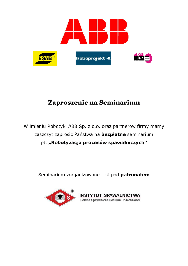 Zaproszenie na Seminarium W imieniu Robotyki ABB Sp. z o.o. oraz partnerów firmy mamy zaszczyt zaprosić Państwa na bezpłatne seminarium pt. „Robotyzacja procesów spawalniczych” Seminarium zorganizowane jest pod patronatem Podczas seminarium uczestnicy zapoznają się z kompendium wiedzy o robotyzacji procesów spawania. Konferencja połączona będzie z premierą nowych modeli z rodziny znanych i cenionych cel spawalniczych FlexArc. Cele te wyposażone są w roboty o nowoczesnej konstrukcji nadgarstka hollow wrist. Zaprezentowane zostanie również oprogramowanie aplikacyjne RobotWare ARC które czyni proces programowania aplikacji spawalniczych szybkim i intuicyjnym. Dodatkowo uczestnicy poznają podstawy oprogramowania RobotStudio z dodatkiem Arc Welding PowerPac. Specjaliści z firmy ABB zademonstrują również „na żywo” możliwości programowania i obsługi robotów. Dodatkowo dzięki udziałowi ekspertów z firm ESAB, Abicor Binzel oraz Roboprojekt uczestnicy konferencji dowiedzą się czym należy kierować się kompletując elementy stanowisk zrobotyzowanych a także poznają produkty dedykowane do robotyzacji procesów spawania. Uczestnicy seminarium zgłębią również ekonomiczne aspekty inwestycji w zrobotyzowane stanowiska zaprezentuje spawalnicze. Dr metody oceny inż. Tomasz efektywności Pfeifer z Instytutu wdrożeń stanowisk Spawalnictwa do spawania zrobotyzowanego. Każdy z uczestników seminarium otrzyma certyfikat uczestnictwa oraz komplet materiałów konferencyjnych. Liczba uczestników seminarium jest ograniczona – o udziale w seminarium decyduje kolejność zgłoszeń. Ze względu na przewidywane duże zainteresowanie, prosimy o mailowe potwierdzenie uczestnictwa na adres: [email protected] , [email protected]