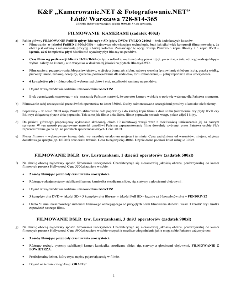 K&F „Kamerowanie.NET & Fotografowanie.NET” Łódź/ Warszawa 728-814-365 CENNIK ślubny obowiązujący od dnia 30.01.2017 r. do odwołania. FILMOWANIE KAMERAMI (zadatek 400zł) a) Pakiet główny FILMOWANIE FullHD (płyty Blu ray) + SD (płyty DVD): TYLKO 2100zł – brak dodatkowych kosztów. Filmowanie w jakości FullHD (1920x1080) – najnowsza obowiązująca technologia, brak jakiejkolwiek kompresji filmu powoduje, że obraz jest oddany z niesamowitą precyzją i barwą kolorów. Zamawiając tę opcję dostają Państwo 3 kopie Blu-ray + 3 kopie DVD – łącznie, aż 6 kompletów płyt! Możliwość wymiany płyt Blu-ray na pendriva. Czas filmu wg preferencji klienta 1h/2h/3h/4h (w tym czołówka, multimedialny pokaz zdjęć, prezentacja auta, różnego rodzaju klipy – wybór należy do klienta), a to wszystko w doskonałej jakości na płytach Blu-ray/DVD. Film zawiera: przygotowania, błogosławieństwo, wyjście z domu, akt ślubu, zabawę weselną (przywitanie chlebem i solą, gorzką wódkę, pierwszy taniec, zabawę, oczepiny, życzenia, podziękowania dla rodziców, tort i zakończenie) – pełny reportaż z dnia uroczystości. 6 kompletów płyt - różnorodność wyboru nadruków i etui, możliwość zamiany na pendriva. Dojazd w województwie łódzkim i mazowieckim GRATIS! Brak ograniczenia czasowego – nie muszą się Państwo martwić, że operator kamery wyjdzie w połowie ważnego dla Państwa momentu. b) Filmowanie całej uroczystości przez dwóch operatorów to koszt 3500zł. Osoby zainteresowane szczegółami prosimy o kontakt telefoniczny. c) Poprawiny – w cenie 700zł mają Państwo sfilmowane całe poprawiny i do każdej kopii filmu z dnia ślubu (niezależnie czy płyty DVD czy Blu-ray) dołączoną płytę z dnia poprawin. Tak samo jak film z dnia ślubu, film z poprawin posiada wstęp, pokaz zdjęć i klipy. d) Do pakietu głównego proponujemy wykonanie skróconej, około 10 minutowej wersji wraz z możliwością umieszczenia jej na naszym serwerze. W ten sposób przygotowany materiał umożliwi Państwu zaprezentowanie filmu dowolnie wybranej przez Państwa osobie i/lub zaprezentowanie go na np. na portalach społecznościowych. Cena 300zł. e) Plener filmowy – wykonywany innego dnia, we wspólnie ustalonym miejscu i terminie. Cena uzależniona od warunków, miejsca, użytego dodatkowego sprzętu (np. DRON) oraz czasu trwania. Cena to najczęściej 400zł. Użycie drona podnosi koszt usługi o 300zł. FILMOWANIE DSLR tzw. Lustrzankami, 1 dzień/2 operatorów (zadatek 500zł) f) Na chwilę obecną najnowszy sposób filmowania uroczystości. Charakteryzuje się niesamowitą jakością obrazu, porównywalną do kamer filmowych prosto z Hollywood. Cena 3500zł zawiera w sobie: 2 osoby filmujące przez cały czas trwania uroczystości. Różnego rodzaju systemy stabilizacji kamer: kamizelka steadicam, slider, rig, statywy z głowicami olejowymi. Dojazd w województwie łódzkim i mazowieckim GRATIS! 3 komplety płyt DVD w jakości SD + 3 komplety płyt Blu-ray w jakości Full HD – łącznie aż 6 kompletów płyt + PENDRIVE! Około 50 min. niesamowitego materiału filmowego odbiegającego od przyjętych norm filmowania ślubów i wesel + trailer czyli krótka zapowiedź naszego filmu. FILMOWANIE DSLR tzw. Lustrzankami, 3 dni/3 operatorów (zadatek 900zł) g) Na chwilę obecną najnowszy sposób filmowania uroczystości. Charakteryzuje się niesamowitą jakością obrazu, porównywalną do kamer filmowych prosto z Hollywood. Cena 5900zł zawiera w sobie wszystkie możliwe udogodnienia jakie mogą sobie Państwo zażyczyć tzn: 3 osoby filmujące przez cały czas trwania uroczystości. Różnego rodzaju systemy stabilizacji kamer: kamizelka steadicam, slider, rig, statywy z głowicami olejowymi, FILMOWANIE Z POWIETRZA. Profesjonalny lektor, który czyta napisy pojawiające się w filmie. Dojazd na terenie całego kraju GRATIS! 1 Film narzeczeński pokazujący codzienne życie przyszłej pary młodej i przygotowania przed ślubem (do ustalenia). Plener, wykonywany innego dnia, w cenie! 3 komplety płyt DVD w jakości SD + 3 komplety płyt Blu-ray w jakości Full HD – łącznie aż 6 kompletów płyt + PENDRIVE! Około 1h niesamowitego materiału filmowego odbiegającego od przyjętych norm filmowania ślubów i wesel Na film składa się: a) Trailer czyli krótka zapowiedź Państwa filmu. b) Film główny: animacja zwana „czołówką”, materiał właściwy, klipy, pokaz zdjęć, napisy końcowe. c) Short czyli około 10 min. film prezentujący całą uroczystość. FOTOGRAFIA (zadatek 300zł) h) Pakiet główny: TYLKO 1900zł – brak dodatkowych kosztów. WSZYSTKIE ZDJĘCIA SĄ DOKŁADNIE OPRACOWANE. Minimum 500 zdjęć wysokiej jakości w postaci cyfrowej na płytach DVD. Fotoreportaż zawiera zdjęcia z: przygotowań, błogosławieństwa, wyjścia z domu, aktu ślubu, zabawy weselnej (przywitanie chlebem i solą, gorzką wódkę, pierwszy taniec, oczepiny, życzenia, podziękowania dla rodziców, tort) – pełny reportaż z dnia uroczystości. 3 komplety płyt - różnorodność wyboru nadruków i etui. Dojazd w województwie łódzkim i mazowieckim GRATIS! Brak ograniczenia czasowego – nie muszą się Państwo martwić, że fotograf wyjdzie w połowie ważnego dla Państwa momentu. i) Wykonanie ekskluzywnej fotoksiążki formatu 30x30cm (po rozłożeniu 30x60cm) w oprawie z ecoskóry, metalu lub innego tworzywa – koszt TYLKO 25zł od strony. j) Poprawiny – za dodatkową opłatą 700zł mają Państwo sfotografowane całe poprawiny i do każdego kompletu z dnia ślubu dołączoną kopię z poprawin, min. 200 zdjęć. PLENER FOTOGRAFICZNY (zadatek 200zł) k) Plener fotograficzny 800zł – w tej cenie mają Państwo zagwarantowany parogodzinny pobyt w plenerze w dniu, który wspólnie ustalimy. Otrzymują Państwo min. 100 sztuk starannie obrobionych zdjęć w postaci cyfrowej (3 komplety). ZAPROSZENIE FILMOWE, PODZIĘKOWANIA DLA RODZ