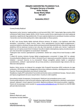 ZWIĄZEK HARCERSTWA POLSKIEGO P.G.K. Chorągiew Harcerzy w Kanadzie Hufiec Karpaty Szczep Wodny Bałtyk 1957-2017 Komunikat 2016/17 Czuwaj Drodzy Rodzice! Zapraszamy zuchy, harcerzy i wędrowników na rok harcerski 2016 / 2017. Zapisy będą 13go września 2016 w Britannia Public School między 18:00 a 19:30. Prosimy zwrócić formy rejestracyjne oraz uiścić opłatę jak najszybciej, najpóźniej do 31go października. W czasie zapisów będziemy tez sprzedawać mundury zuchowe i harcerskie oraz harcerskie podręczniki a także odpowiadać na Wasze pytania. W 2017 roku Szczep Wodny Bałtyk obchodzi 60-lecie istnienia. W związku z tym będziemy mieli kilka obrzędów i uroczystości z okazji rocznicy. Jedna z form upamiętnienia rocznicy będzie przygotowanie i wręczenie każdemu członkowi Szczepu okolicznościowej koszulki (obozówki) 60-lecia. Aby pokryć tego koszt dodaliśmy $10 do rejestracji rocznej w tym roku aby mieć pewność, że każdy zuch, harcerz i wędrownik będzie się czuł częścią naszej historii (tradycji). Koszulka ta będzie obowiązkową częścią umundurowanie w tym roku harcerskim (szczególnie na wycieczkach i biwakach). Tradycyjnie duże rocznice upamiętniane są bankietem. Ostatni był z okazji 50-cio leciał Szczepu w 2007 roku. Z okazji 60 rocznicy istnienia Szczepu Baltyk przygotowujemy uroczystość 4 lutego 2017 (w sobotę). Uroczysty Bankiet odbędzie się w St. Mary’s Ukranian Church. Zapraszamy wszystkich rodziców, znajomych, młodzież i starszych harcerzy na tę uroczystość! Więcej szczegółów podane będzie w specjalnym zawiadomieniu, ulotkach i zaproszeniach ale już teraz prosimy o zarezerwowanie tego wieczoru dla nas. Obecność obowiązkowa. Rodzice, którzy jeszcze nie dołączyli do szeregów Koła Przyjaciół Harcerstwa (KPH) serdecznie do tego zachęcamy. KPH istnieją w celu: propagowania Harcerstwa i jednania członków, udzielają pomocy moralnej, fizycznej i finansowej jednostkom przy których istnieje Koło. Współpraca między KPH i jednostkami harcerskimi jest bardzo ważna w działalności Szczepu. Naszym celem jest lepsze przygotowanie do życia naszych dzieci i musimy to robić wspólnie. Komunikacja miedzy Szczepowym, Drużynowymi i Rodzicami jest prowadzona przez e-mail. Prosimy podać aktywny e-mail na formach żebyśmy mogli wysyłać zawiadomienia o zbiórkach, wycieczkach, obozach, zabawach i innych zajęciach harcerskich. Będziemy próbować informować po polsku i angielsku. Pytania do Szczepowego można wysyłać na [email protected] lub dzwonić na 416 903 9881 jeśli jest taka konieczność. Czuwaj, Mateusz Bieńczyk, pwd. Szczepowy Szczepu Bałtyku 01/09/2016 [email protected] Związek Harcerstwa Polskiego Chorągiew Harcerzy Kanada www.szczepwodnybaltyk.com ZWIĄZEK HARCERSTWA POLSKIEGO P.G.K. Chorągiew Harcerzy w Kanadzie Hufiec Karpaty Szczep Wodny Bałtyk 1957-2017 Komunikat 2016/17 Czuwaj Parents! We welcome all zuchy, harcerze and wedrownicy for the 2016 / 2017 scouting year. Registration will be held on September 13th, 2016 at Britannia Public School from 6pm till 7:30pm. We encourage to print and fill the forms ahead of time and bring along with payment as soon as possible, but latest till October 31st. During registration, we will be selling zuchy and harcerze uniforms and materials, as well as answering questions. 2017 is the year that Szczep Wodny Baltyk celebrates its 60th anniversary. As a result, we will have many ceremonies in dedication to the anniversary. One of the forms in which we will do this is by handing out special 60th shirts. In order to cover these costs, we will be adding an extra $10 to this year’s registration so that every zuch, harcerz and wedrownik can participate in this tradition and memory. This shirt will be a mandatory part of the uniform this scouting year (especially for trips and overnight camps). Traditionally, anniversaries are commemorated with a banquet. The last banquet organized by the Szczep was for the 50th anniversary in 2007. To celebrate the 60th anniversary of Szczep Baltyk, we are organizing a banquet on Saturday February 4th, 2017. The banquet will be held at St. Mary’s Ukranian Church. We invite all parents, family, friends, youth and older scouts. More details will be provided closer to the date, through posters, invitations and e-mail, but we hope that everyone can save this date in their calendars. Parents, who are still on in the Parents Scout Committee (KPH) are welcome to join this year. KPH exists to help promote scouting and reconcile the youth through moral, physical and financial support by the Szczep in which it exists. Cooperation between parents and the scouting division is essential in the development of the youth. Our goal is to better prepare scouts for life, which is better done together. Communication between the District Commissioner (Szczepowy), Local Commissioner (Druzynowy) and parents will be through e-mail. Please provide a valid e-mail on the forms so that we can send notifications about scout meetings, trips, overnight camps, banquets and other scouting events. We aim to provide communication in English and Polish. Questions to the District Commissioner can be sent to [email protected] or can be reached at 416 903 9881 if needed. Czuwaj, Mateusz Bieńczyk, pwd. Szczepowy Szczepu Bałtyku 01/09/2016 [email protected] Związek Harcerstwa Polskiego Chorągiew Harcerzy Kanada www.szczepwodnybaltyk.com Admin: # Czeku: ______ Kwota: _______ Rachunek Potrzebny: ______ ZWIAZEK HARCERSTWA POLSKIEGO Polish Scouting Association in Canada Permission Form / Pozwolenie Szczep Wodny Baltyk - 2016/2017 Zuch Harcerz Wędrownik Participant’s Name: ______________________________________________ Stopień/Gwiazdki: _______________ Date of Birth (D/M/Y): _________________________ Health Card Number (Req’d): ________________________ Participant’s Home Address: __________________________________________________________________ City